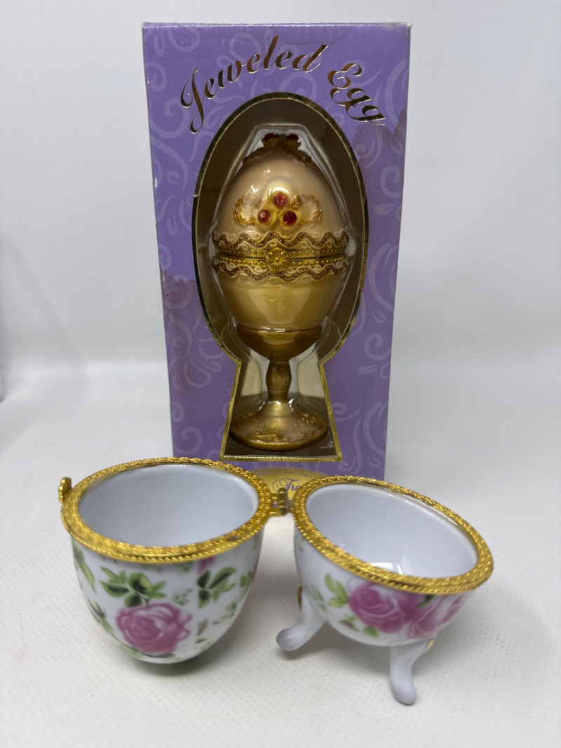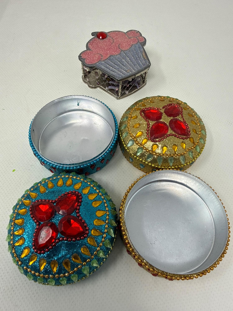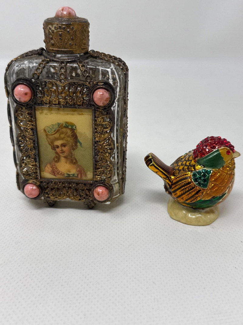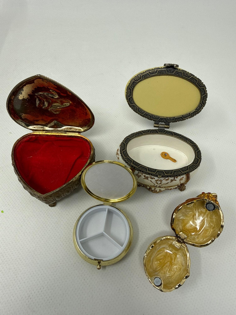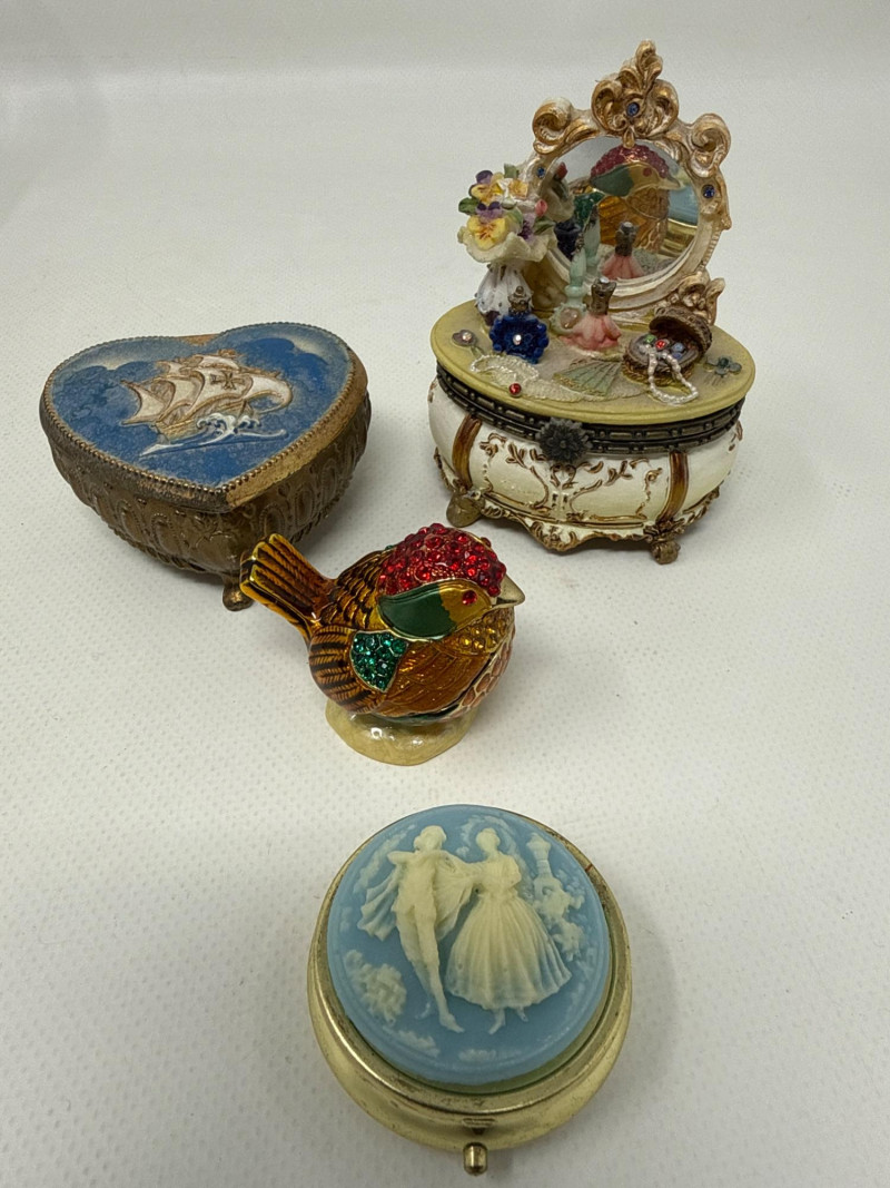 19 pieces. Replicating an era of refined sophistication. A collection of vintage-style trinket boxes and figurines. The assortment includes: Ornate trinket boxes: Egg-shaped, heart-shaped, and round boxes adorned with jewels, floral motifs, and intricate patterns. One heart-shaped box features a delicate pink rose design. Miniature figurines: A girl seated at a vanity with a teddy bear, a small bear figurine, and a bird add a whimsical touch. Unique items: A miniature typewriter and a purple box labeled "HAND PAINTED" suggest handcrafted artistry. Decorative craftsmanship: Many items exhibit detailed metalwork, enamel finishes, and embedded rhinestones, reflecting a collector’s eye for elegance and nostalgia. The overall aesthetic is eclectic and romantic, ideal for collectors of decorative arts or vintage. Style up your vanity, decor, closet or curio