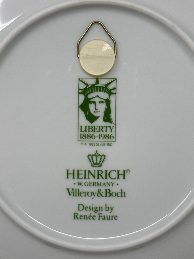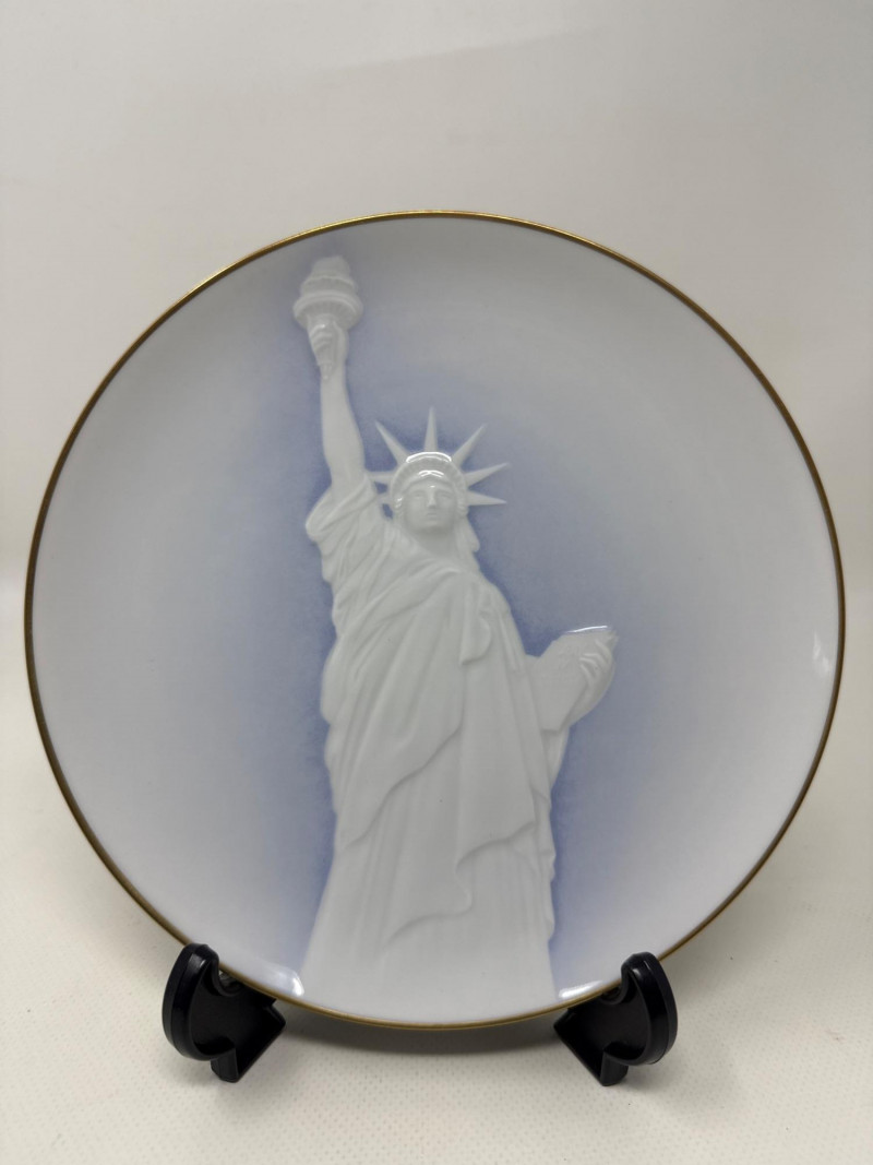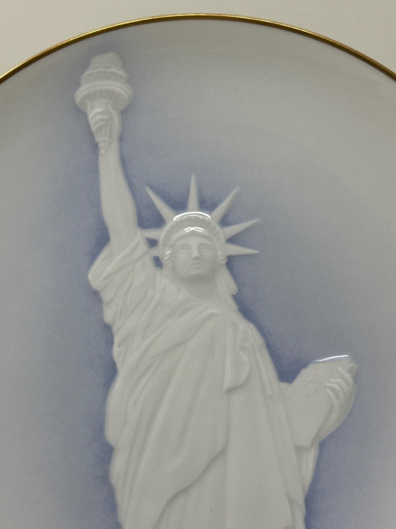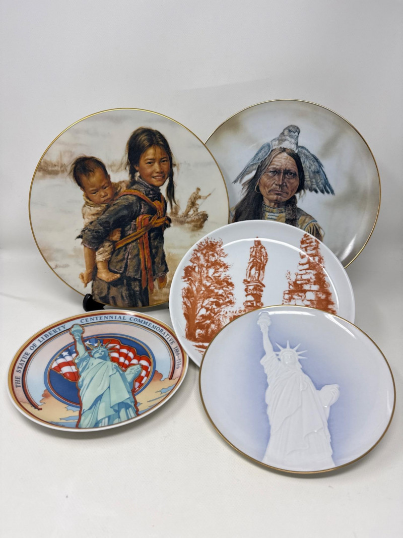 Five commemorative plates arranged in a semi-circle, each celebrating distinct cultural and historical themes: Back Left Plate: A realistic portrait of a young Native American girl carrying a baby on her back. Both are dressed in traditional attire, set against a snowy backdrop, evoking themes of heritage and resilience. Plate is 10.25 inch wide. Back Right Plate: A solemn depiction of an older Native American man wearing a feathered headdress and ceremonial clothing. His stern expression and detailed features suggest wisdom and leadership.Plate is 10.25 inch wide. Front Left Plate: A patriotic design showcasing the Statue of Liberty with the American flag in the background. It includes the inscription: "THE STATUE OF LIBERTY CENTENNIAL COMMEMORATIVE 1886-1986.Plate is 7.25 inch wide. Front Center Plate: Sepia-toned imagery of two statues surrounded by trees, possibly representing historical monuments or figures in a natural setting in Landstuhl, Germany. Plate is 9in wide Front Right Plate: A stylized, embossed rendering of the Statue of Liberty in white against a soft blue background, giving it a minimalist and elegant feel. Plate is 7.25 inch wide. Together, these plates reflect a blend of Native American heritage and American national symbolism merged with German history, likely intended as collectible or commemorative art pieces. All plates include original box.