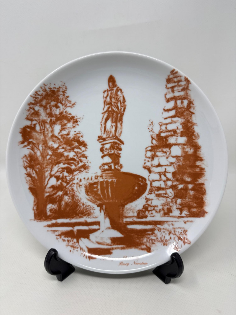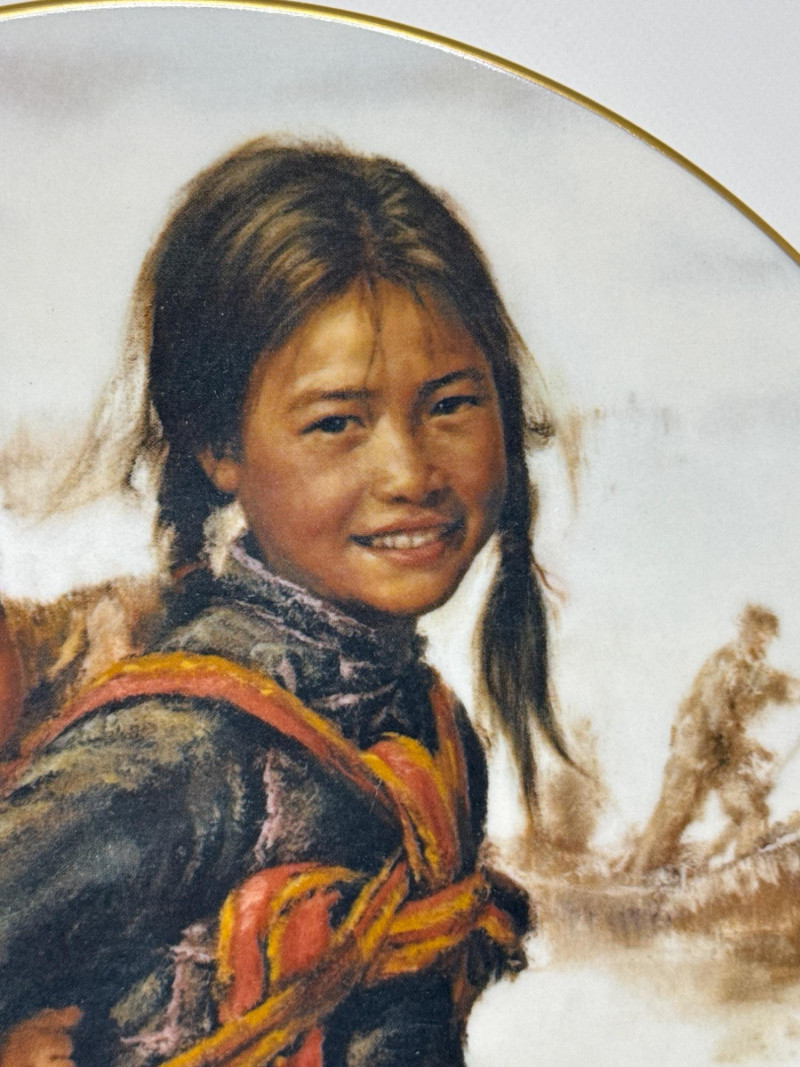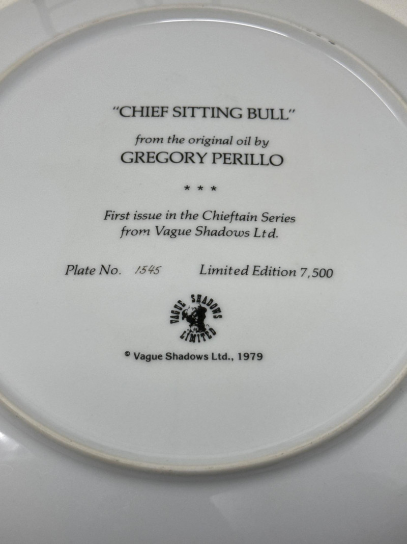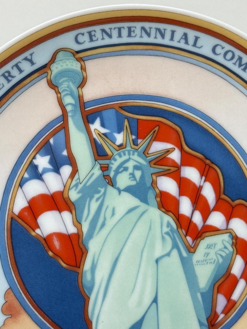 Five commemorative plates arranged in a semi-circle, each celebrating distinct cultural and historical themes: Back Left Plate: A realistic portrait of a young Native American girl carrying a baby on her back. Both are dressed in traditional attire, set against a snowy backdrop, evoking themes of heritage and resilience. Plate is 10.25 inch wide. Back Right Plate: A solemn depiction of an older Native American man wearing a feathered headdress and ceremonial clothing. His stern expression and detailed features suggest wisdom and leadership.Plate is 10.25 inch wide. Front Left Plate: A patriotic design showcasing the Statue of Liberty with the American flag in the background. It includes the inscription: "THE STATUE OF LIBERTY CENTENNIAL COMMEMORATIVE 1886-1986.Plate is 7.25 inch wide. Front Center Plate: Sepia-toned imagery of two statues surrounded by trees, possibly representing historical monuments or figures in a natural setting in Landstuhl, Germany. Plate is 9in wide Front Right Plate: A stylized, embossed rendering of the Statue of Liberty in white against a soft blue background, giving it a minimalist and elegant feel. Plate is 7.25 inch wide. Together, these plates reflect a blend of Native American heritage and American national symbolism merged with German history, likely intended as collectible or commemorative art pieces. All plates include original box.
