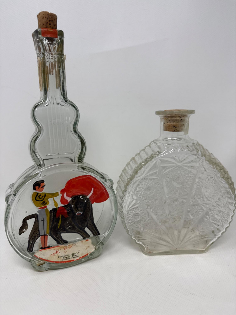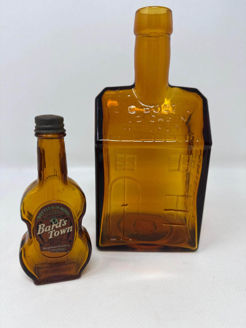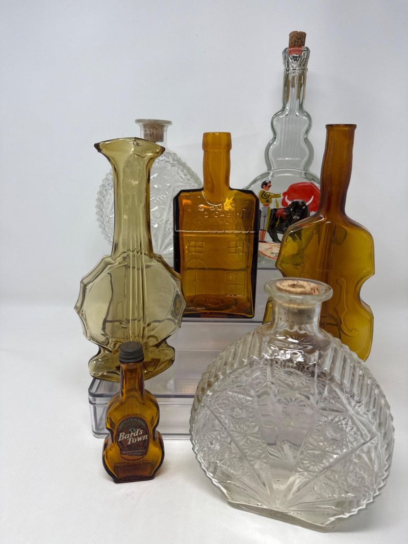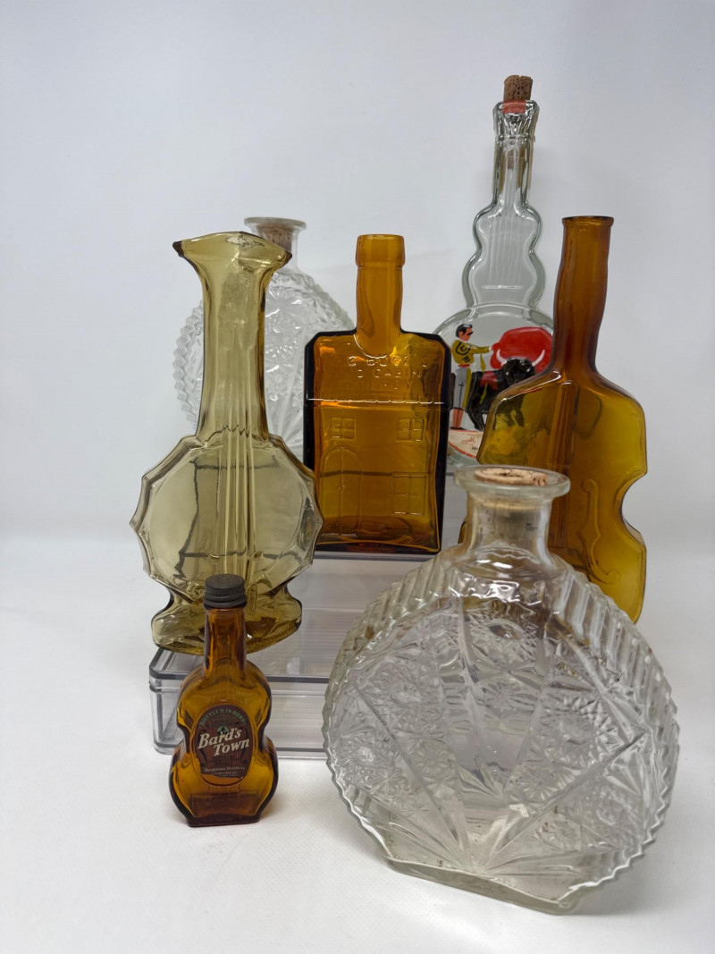 Seven vintage glass bottles, many of which are artistically shaped like violins. The bottles vary in color—clear, amber, and pale green—and feature intricate embossed details. Some with corks. Matching set 7.25 inches tall, 5.75 inches wide. Violin bottle is 9.75 inches tall, 4 inches wide. One standout bottle bears a label reading "Bard's Town Kentucky Straight Bourbon Whiskey," hinting at its origin and use. Old Kentucky whiskey bottle is 8.25 inches tall, 3.75 inches long, 3 inches wide. Another bottle is adorned with a painted scene of a matador and bull, adding a touch of cultural flair. Matador is 11.5 inches tall, 5 inches wide. Banjo bottle is heavy glass with footed base. Old cabin square bottle This ensemble would appeal to collectors of antique glassware or music-themed memorabilia.