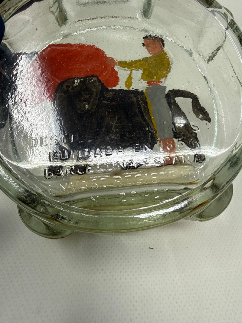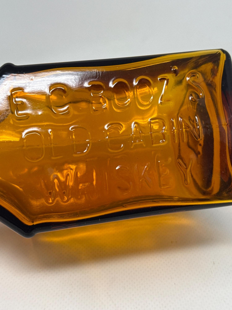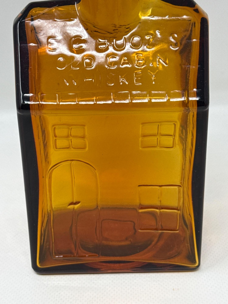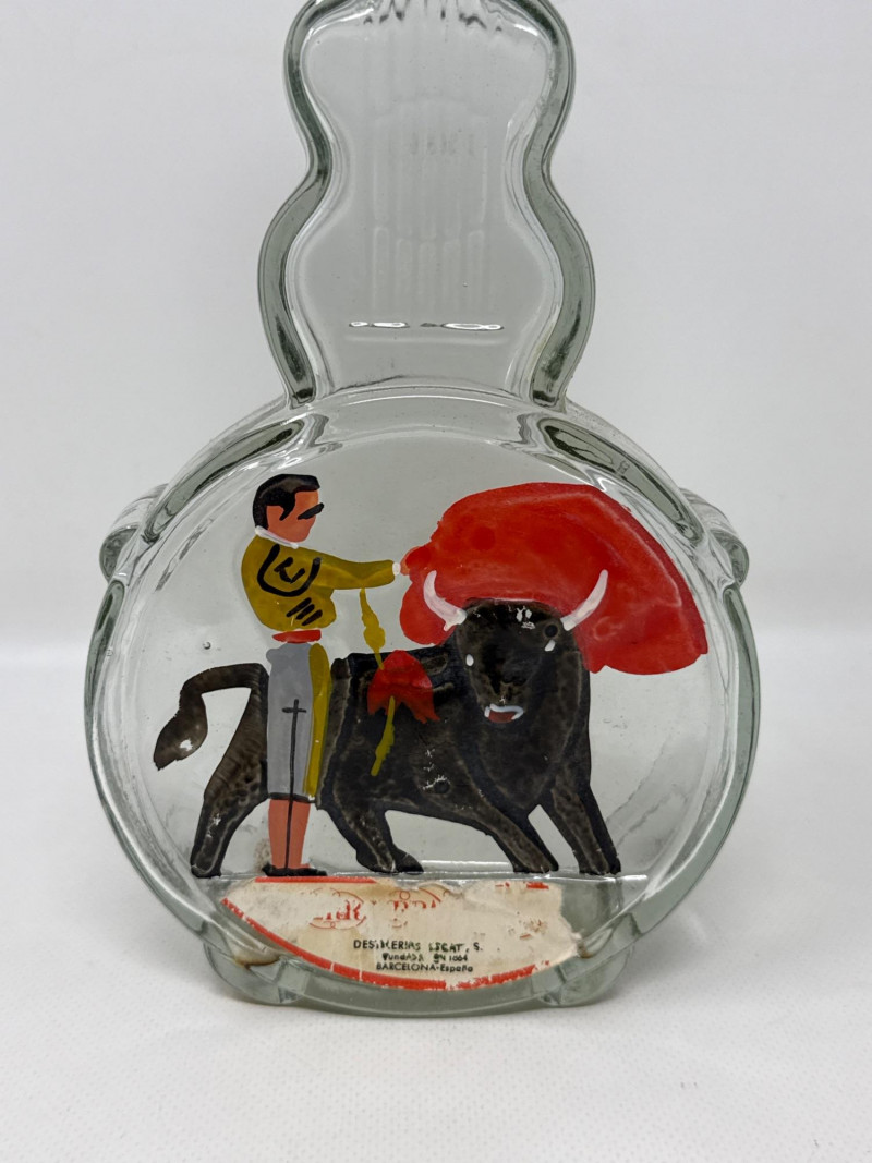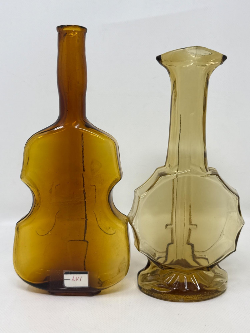 Seven vintage glass bottles, many of which are artistically shaped like violins. The bottles vary in color—clear, amber, and pale green—and feature intricate embossed details. Some with corks. Matching set 7.25 inches tall, 5.75 inches wide. Violin bottle is 9.75 inches tall, 4 inches wide. One standout bottle bears a label reading "Bard's Town Kentucky Straight Bourbon Whiskey," hinting at its origin and use. Old Kentucky whiskey bottle is 8.25 inches tall, 3.75 inches long, 3 inches wide. Another bottle is adorned with a painted scene of a matador and bull, adding a touch of cultural flair. Matador is 11.5 inches tall, 5 inches wide. Banjo bottle is heavy glass with footed base. Old cabin square bottle This ensemble would appeal to collectors of antique glassware or music-themed memorabilia.