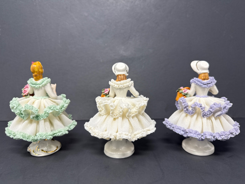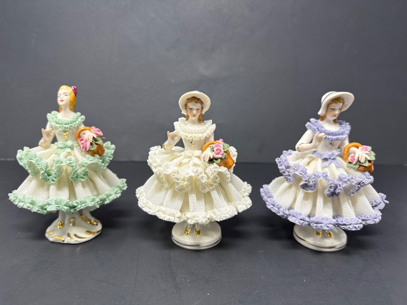 Four delicate Dresden porcelain Lace figurines of women dressed in ornate, ruffled gowns, each holding a basket of flowers. Top tier: One figurine wears a white dress with green trim, holding a floral basket. The other is in a more elaborate white dress with pink accents and a bonnet, also holding flowers. Bottom tier: One figurine is dressed in white with lavender trim and a bonnet. The other wears a white dress adorned with pink flowers and a bonnet. Tallest figurine is 7 inches tall, 5 inch wide. Smaller figurines are 5 inch tall, 3.5 inch wide. Made in Germany. Extremely delicate.