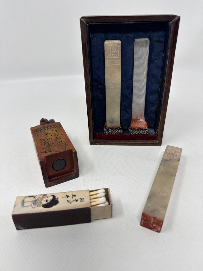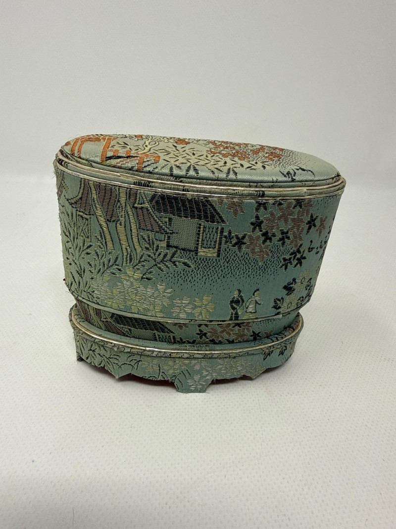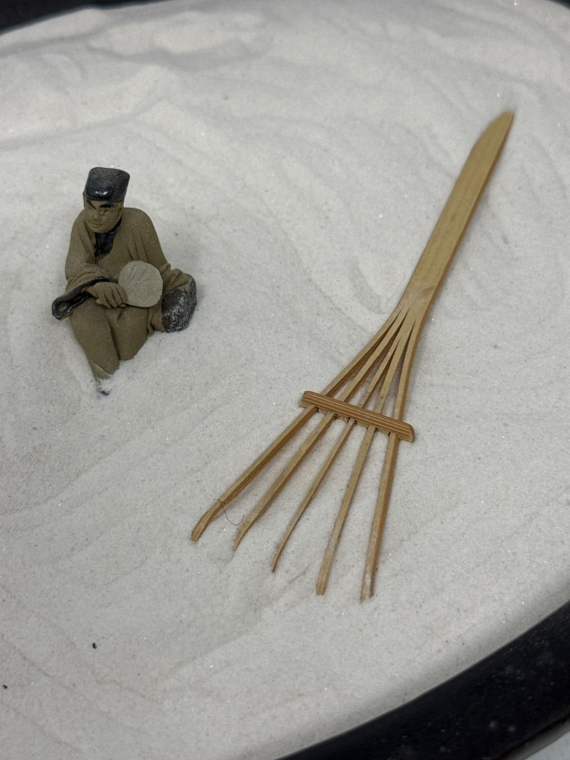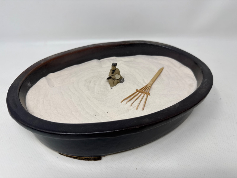 East Asian cultural and artistic artifacts, evoking themes of tranquility, tradition, and craftsmanship. At the center is a black oval tray filled with white sand, resembling a miniature Zen garden. It includes a small rake and a seated figurine, inviting contemplation and calm. Surrounding the Zen garden are various traditional items: A blue-green fabric box for storing metal medicine balls. The ensemble blends elements of meditation, artistry, and cultural heritage, creating a serene and visually rich tableau. If you'd like, I can help identify specific pieces or explore their historical significance.