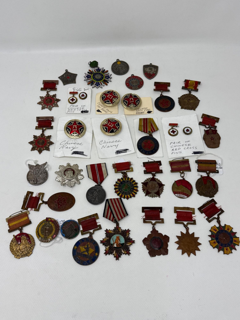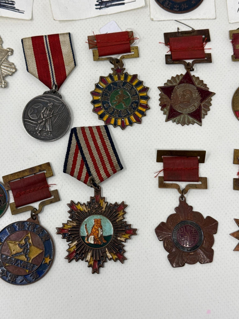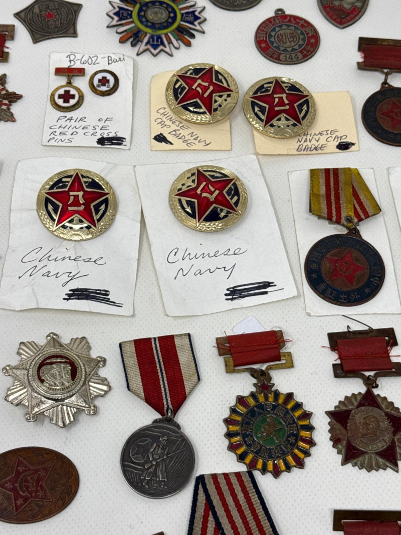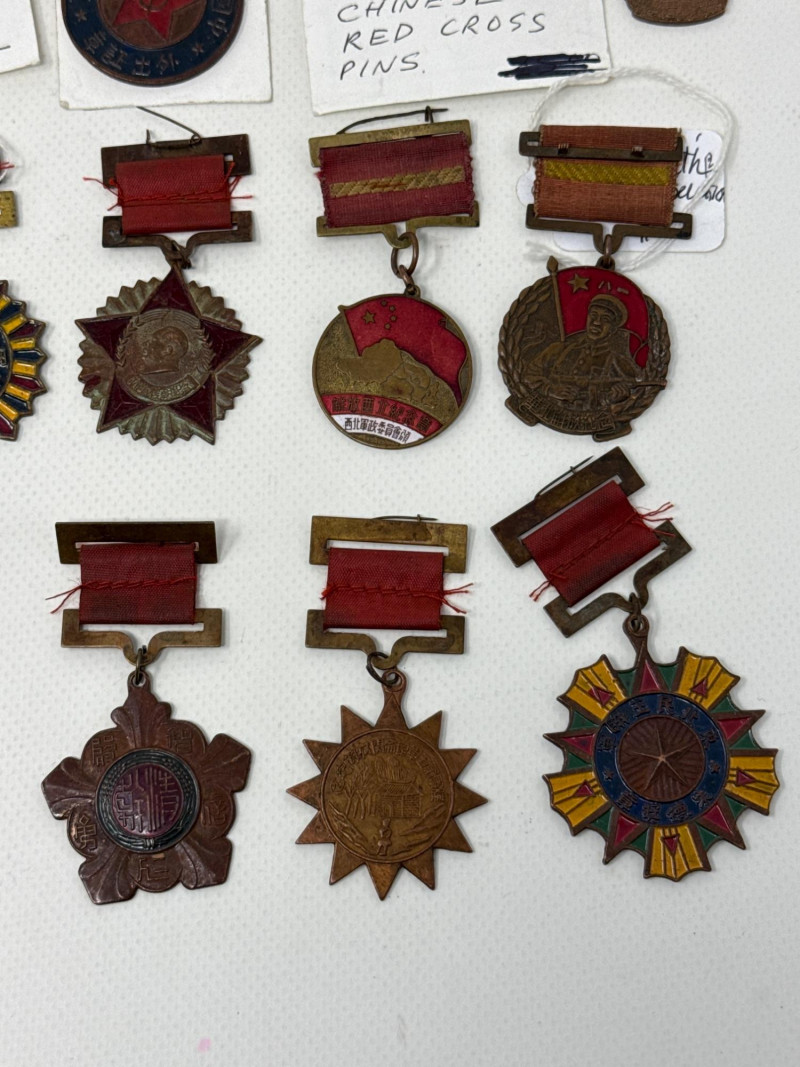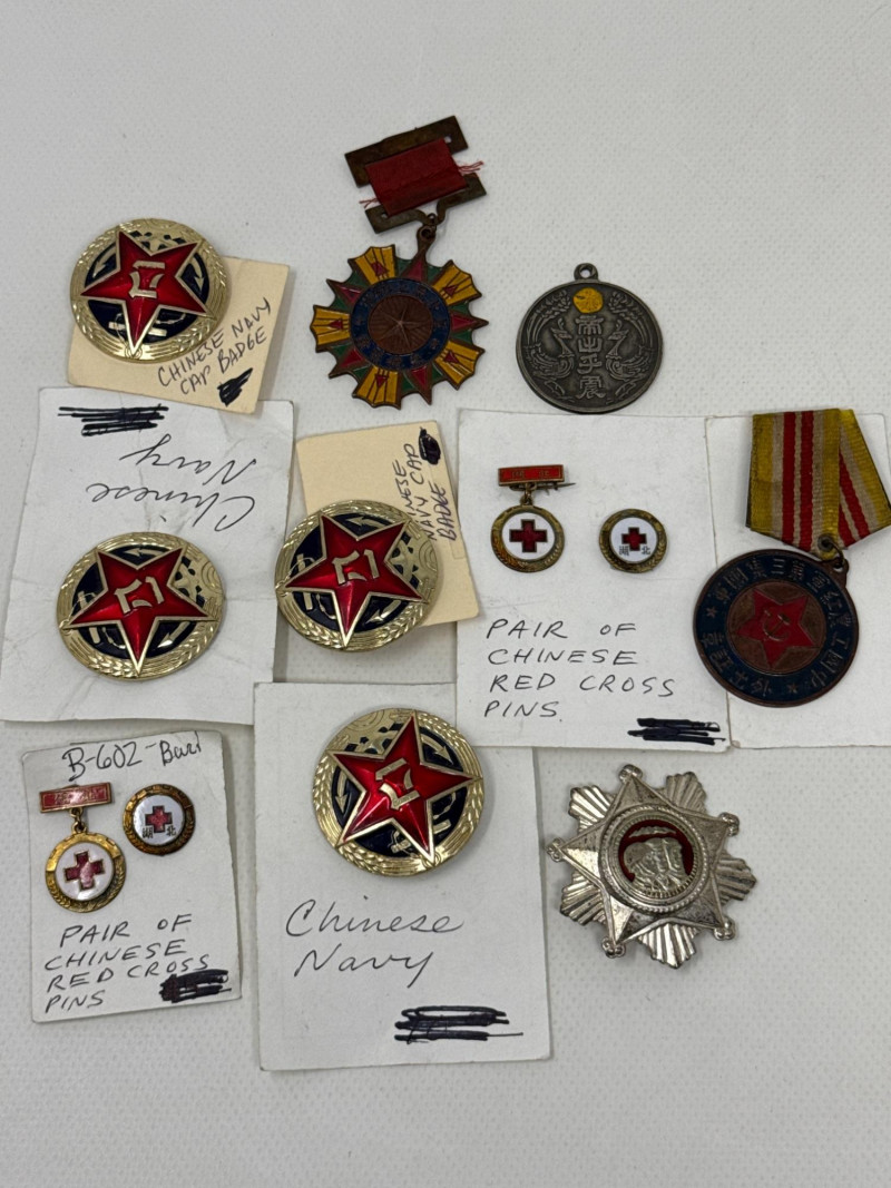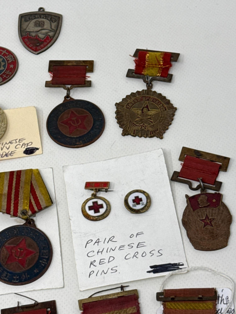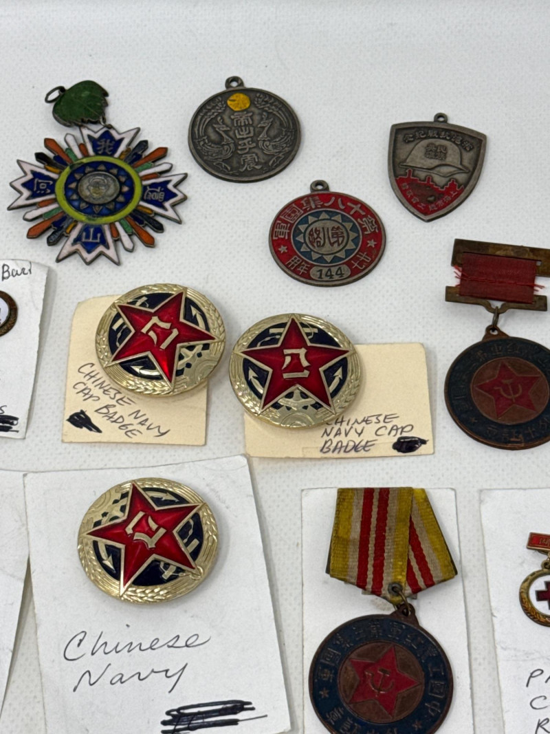 WWII and cold war era Chinese military pins, medals and badges. Conditions vary and there are several duplicates. Several are dated on the back or have script. Please see pics for details.