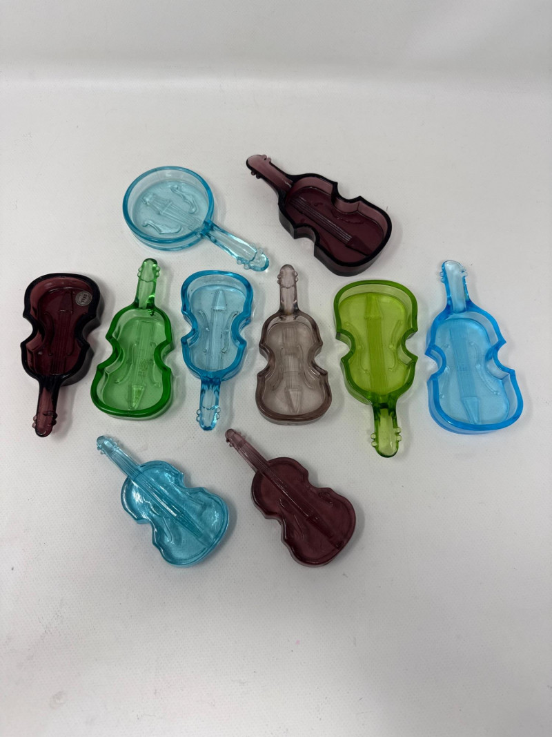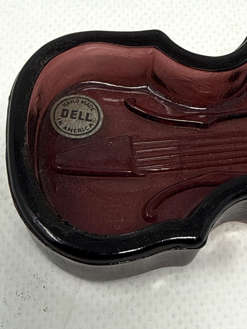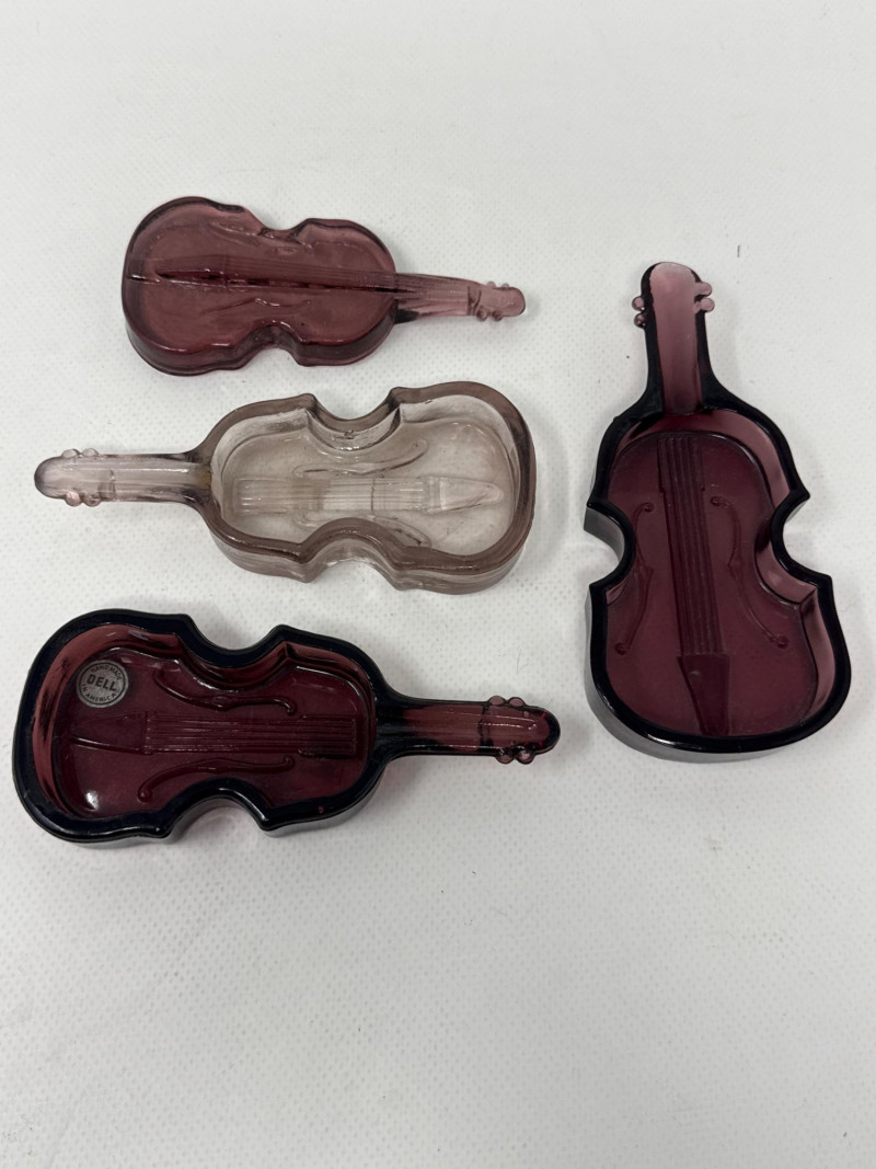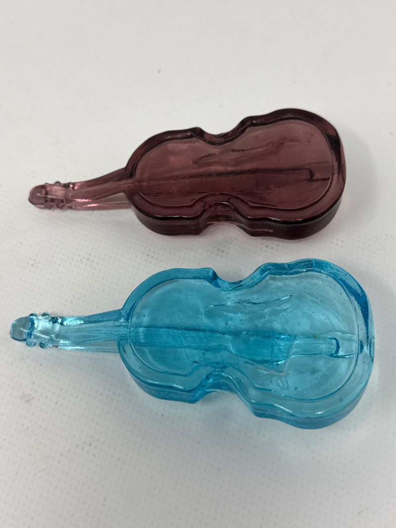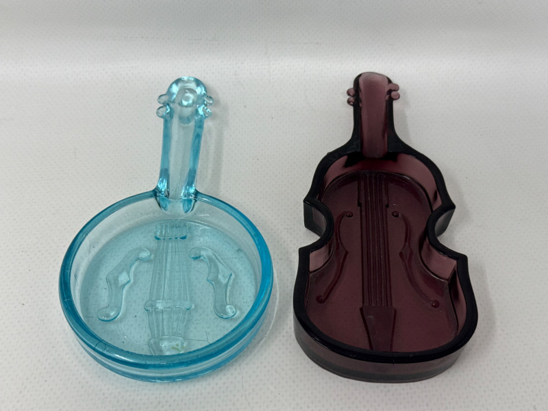 Eight ashtrays. Two decorative solid glass instruments. Average size is 5.5 inches long, 2.5 inches wide. Most are violin and one banjo.