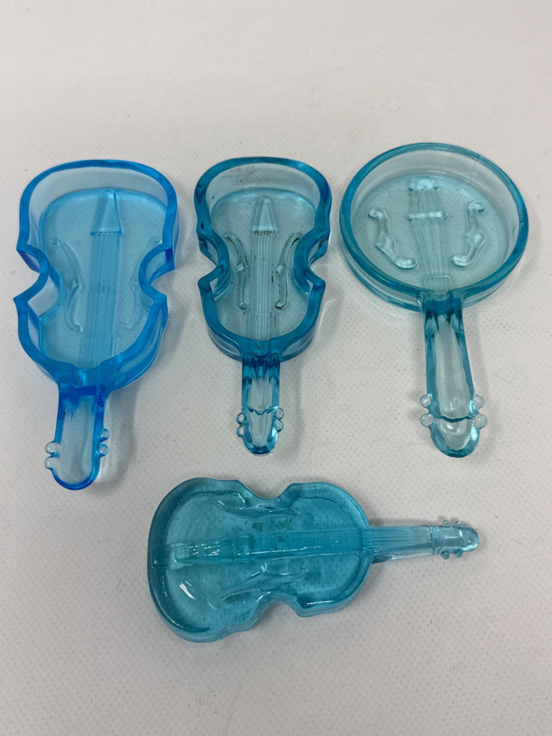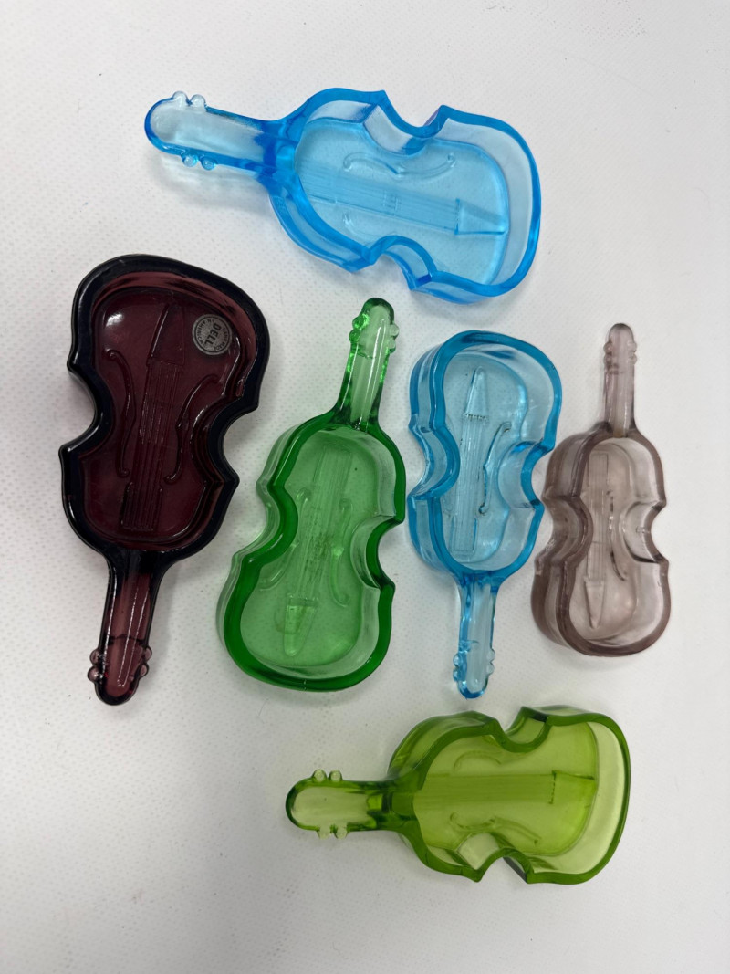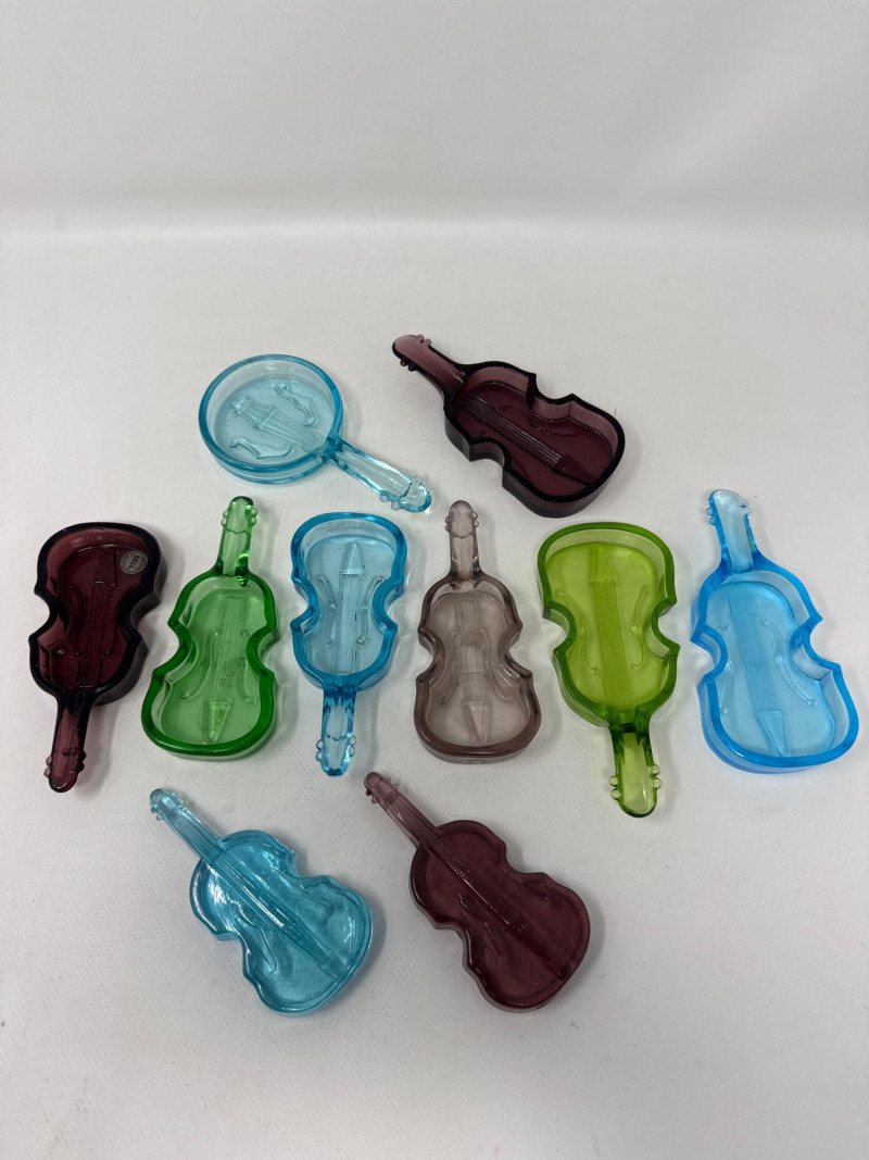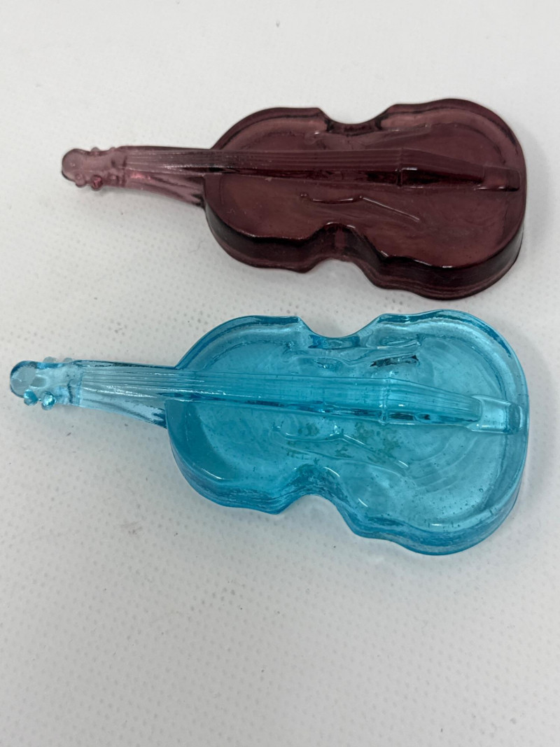 Eight ashtrays. Two decorative solid glass instruments. Average size is 5.5 inches long, 2.5 inches wide. Most are violin and one banjo.