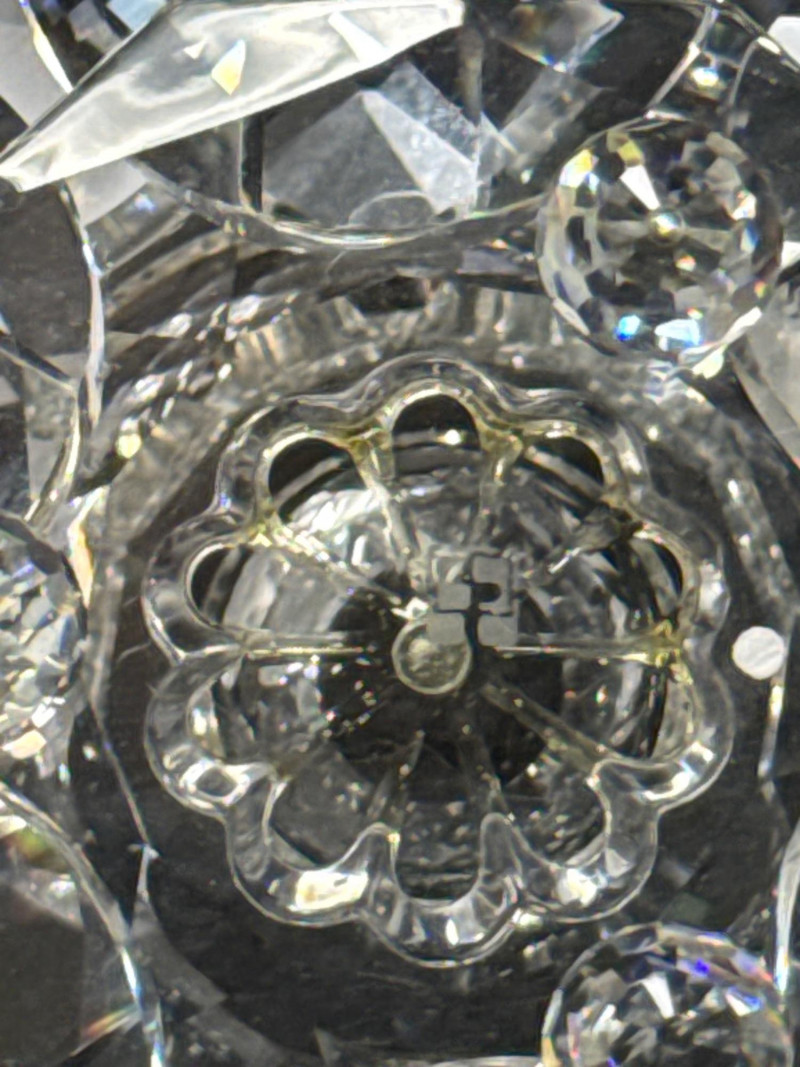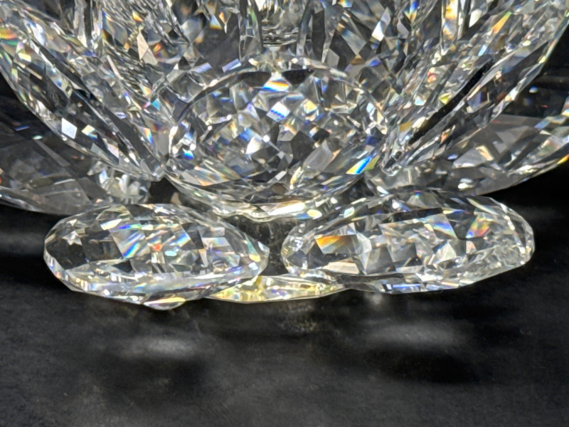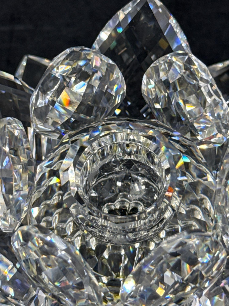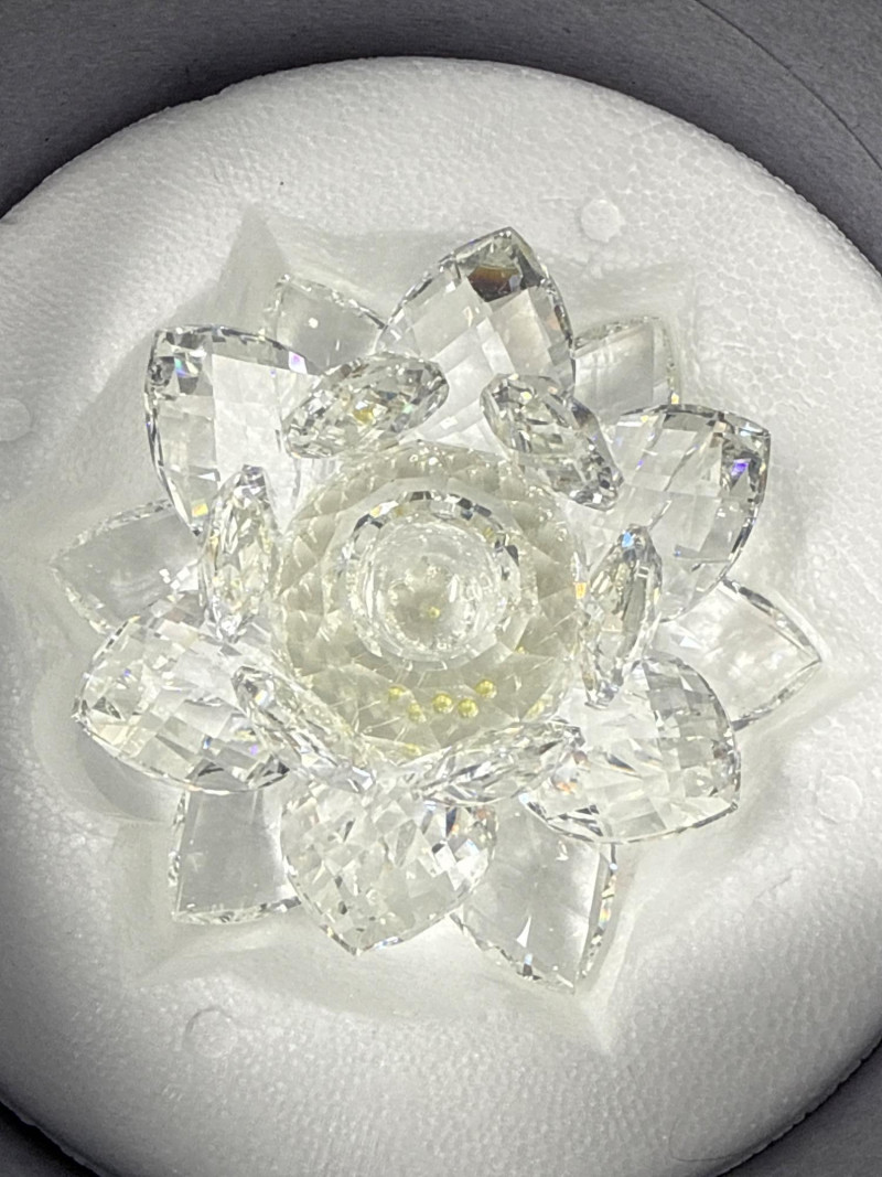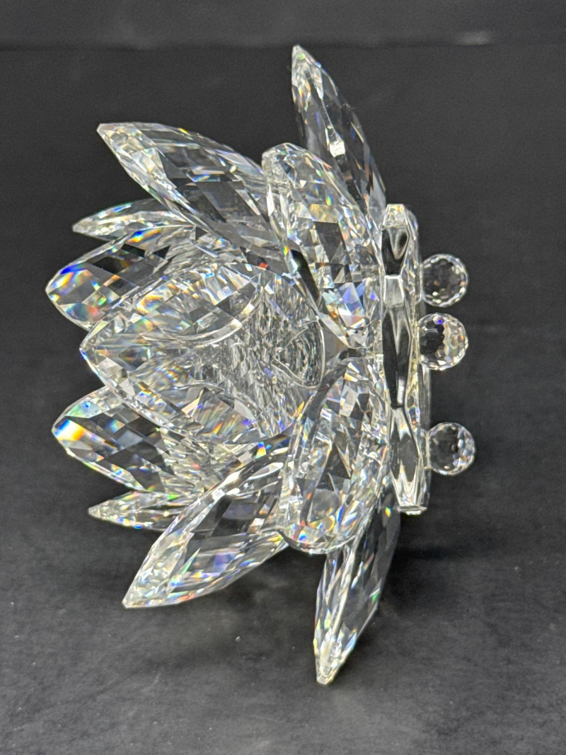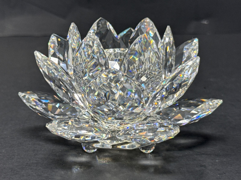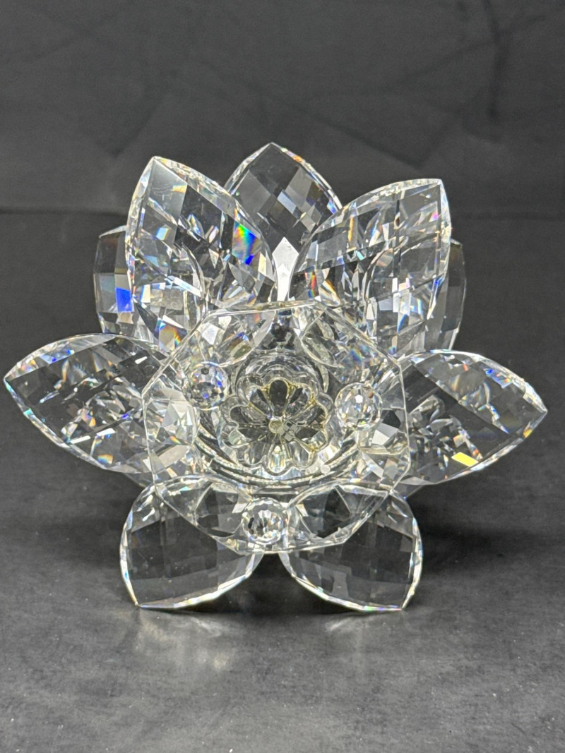 Includes original box and pamphlet. The image features a crystal Lotus/Water Lilly flower taper candleholder. The lotus is crafted with multiple faceted petals that catch and refract light, producing a dazzling array of colors and reflections. Each petal is sharply cut and symmetrically arranged to mimic the natural bloom of a lotus, enhancing its elegance and visual impact. The clarity and precision of the crystal give it a jewel-like brilliance, making it a striking decorative piece. Its reflective qualities and symbolic shape suggest it could be used for aesthetic display, spiritual ambiance, or as a collectible item.