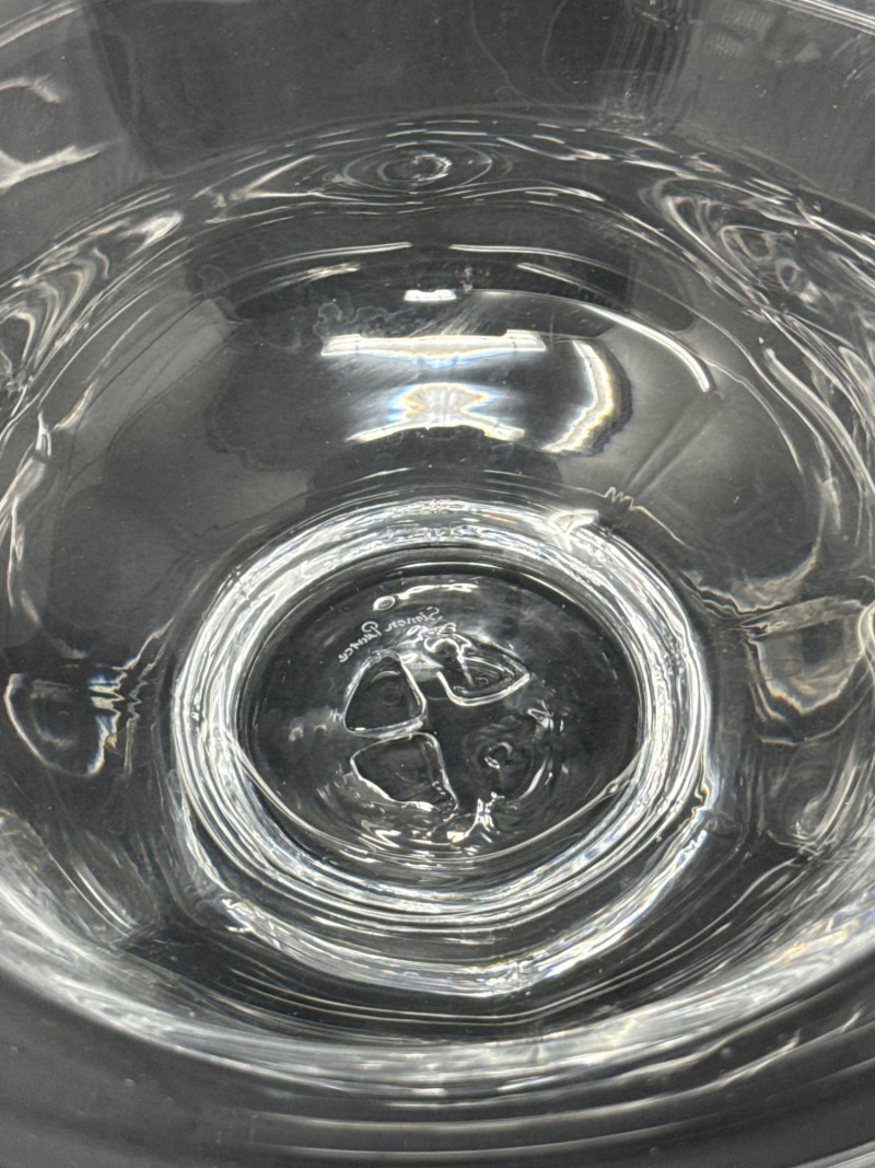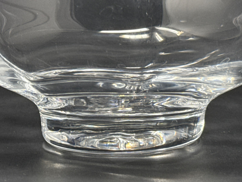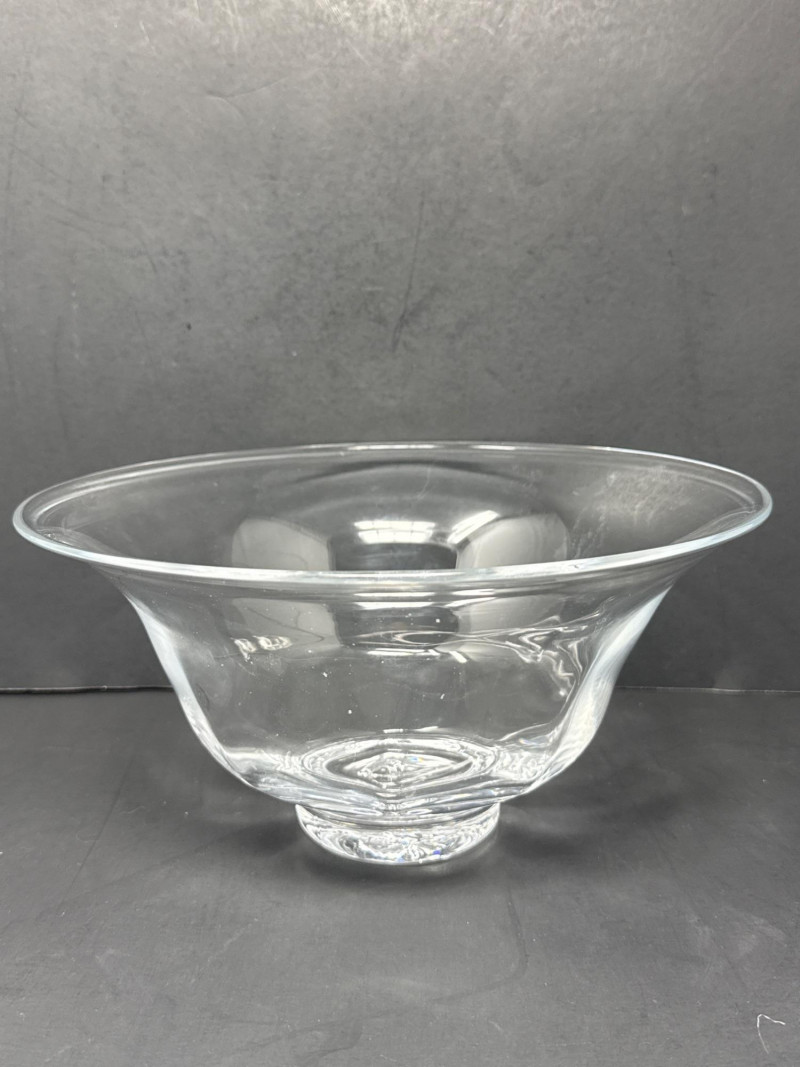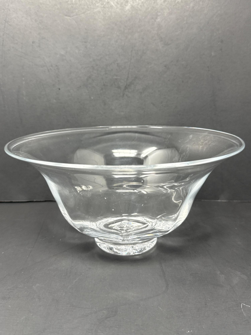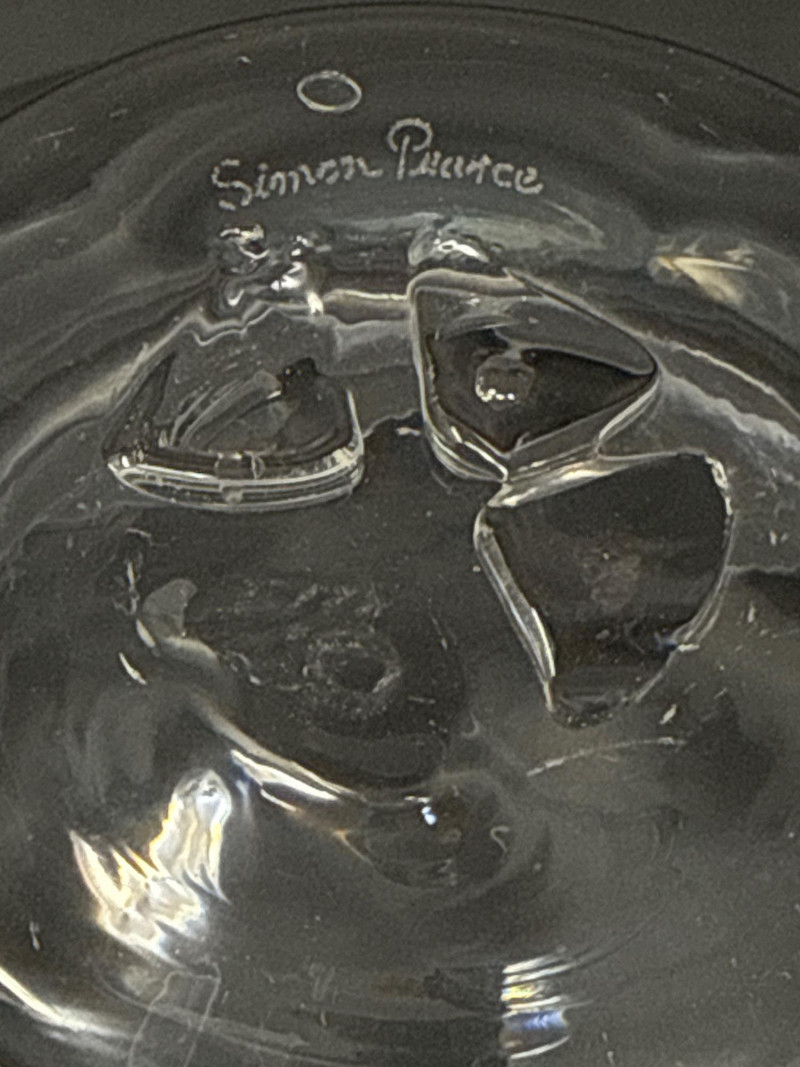 Signed crystal glass bowl by Simon Pierce. Heavy with footed base. The Shelburne crystal glass bowl with a wide, flared rim and a short, rounded base. The curvature and clarity suggest it’s crafted for both functional and decorative use—ideal for serving, displaying items, or as a standalone centerpiece in a refined setting. The overall aesthetic is clean and modern, with a touch of classic sophistication. No defects found