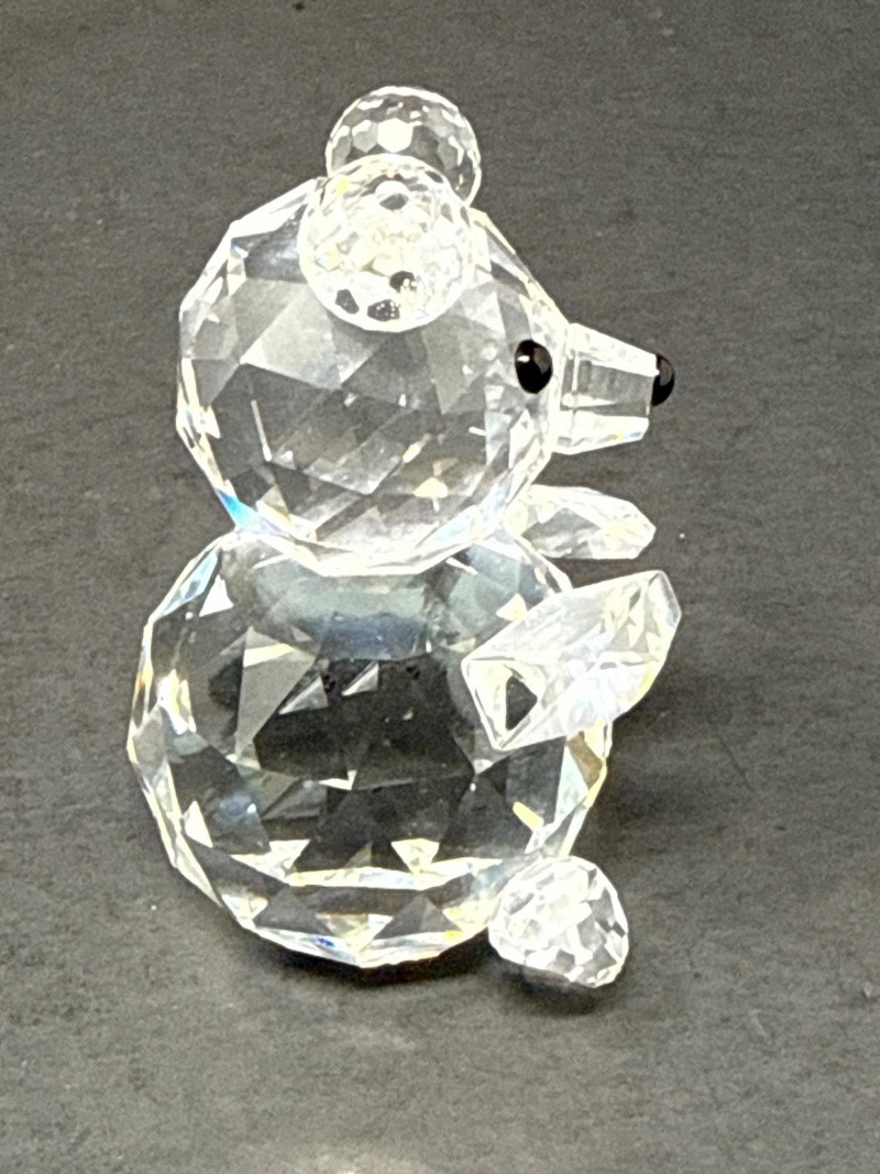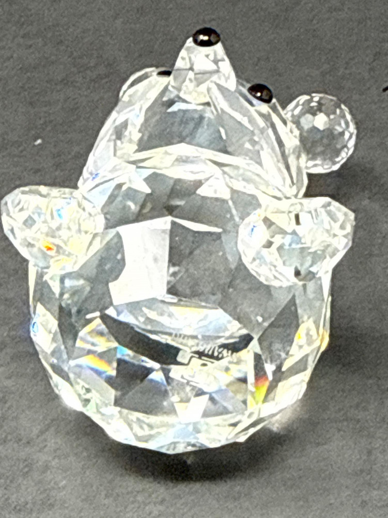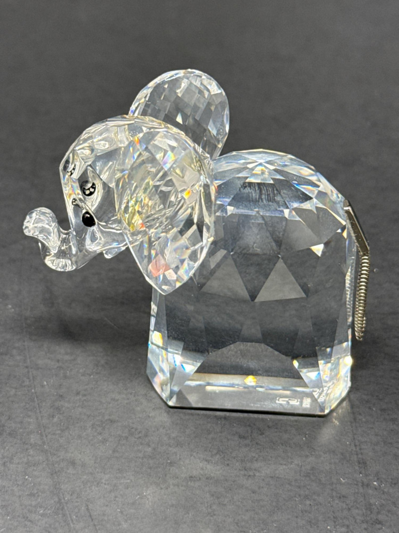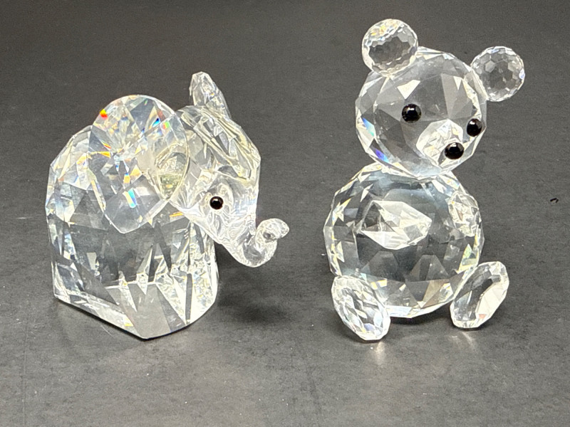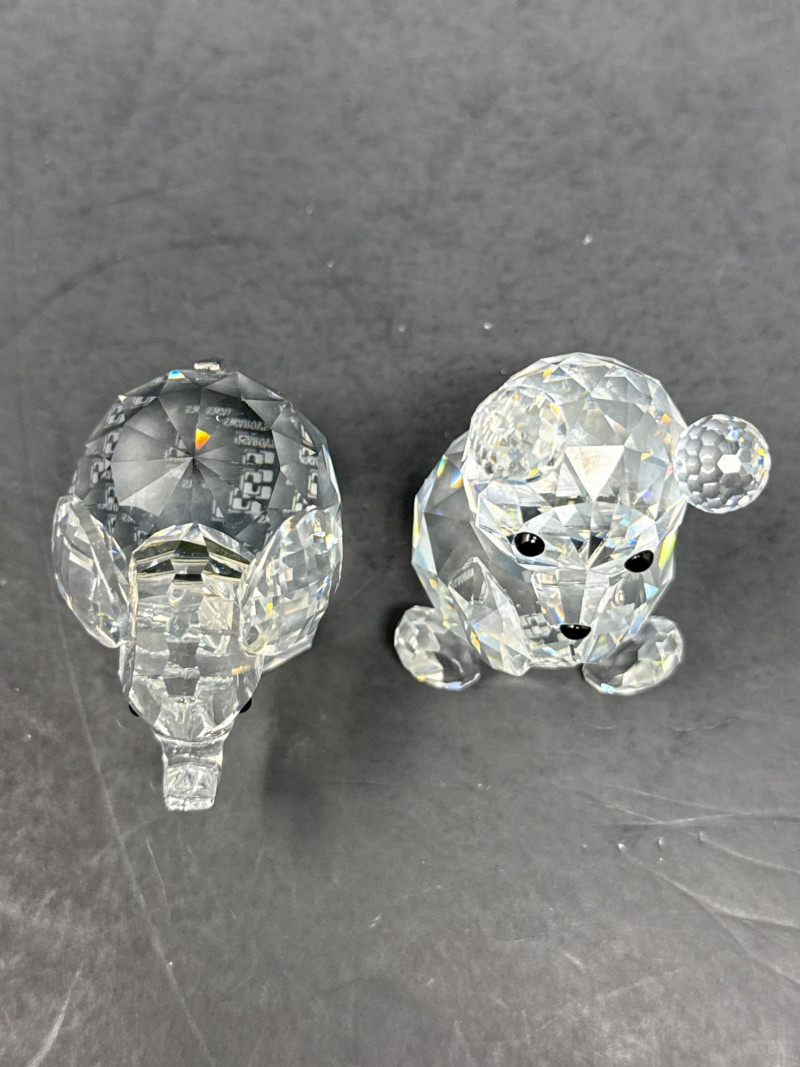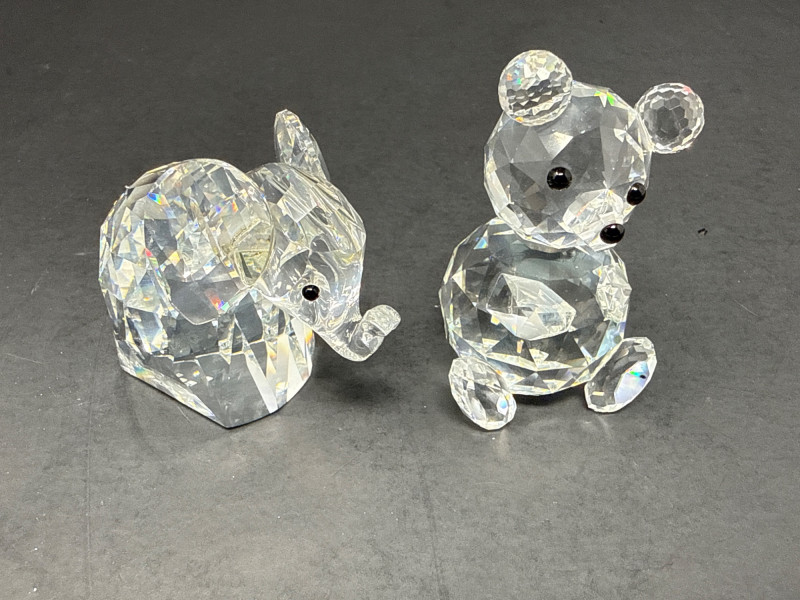 Authentic Swarovski Crystal animals. Includes original packaging and pamphlet. In excellent condition. Two small crystal animal figurines. On the left is a crystal elephant with a raised trunk, large ears, and tiny black eyes. Its faceted body catches the light, creating a shimmering effect that emphasizes its contours and craftsmanship. Elephant 2.25 inch tall, 2.75 inch long, 1.25 inch wide. Has metal tail. On the right is a crystal bear, characterized by a rounded head, small ears, black eyes and nose, and defined limbs. Its smooth yet angular facets give it a playful yet elegant appearance. Bear is 2.75 inch tall, 1.75 inch wide,1.5 inch long. Both pieces exhibit high-quality glasswork, with precision-cut facets that reflect light beautifully. Their compact size and charming animal forms suggest they are decorative collectibles.