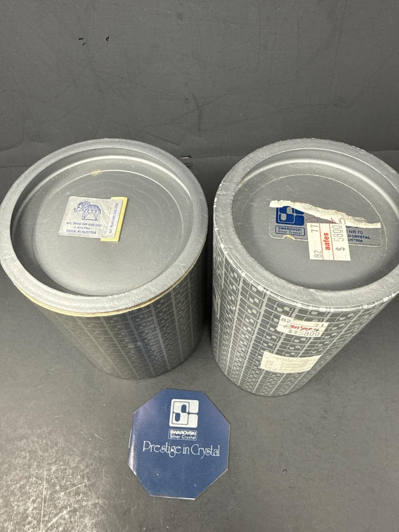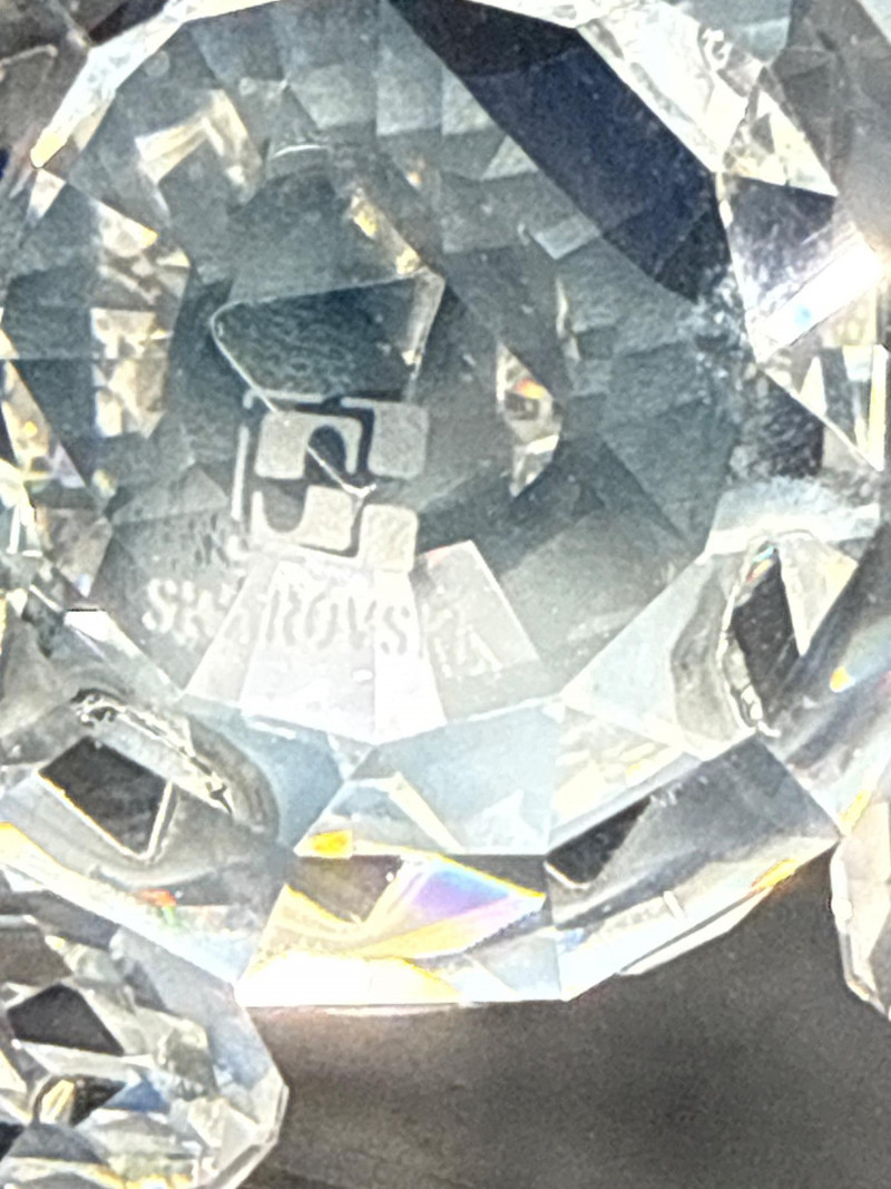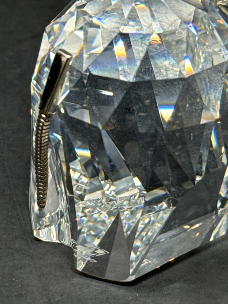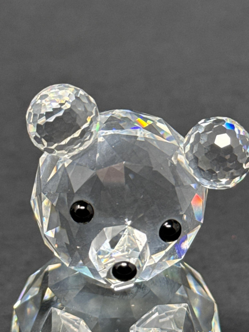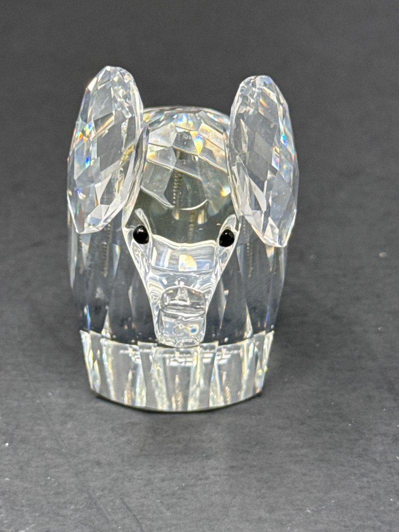 Authentic Swarovski Crystal animals. Includes original packaging and pamphlet. In excellent condition. Two small crystal animal figurines. On the left is a crystal elephant with a raised trunk, large ears, and tiny black eyes. Its faceted body catches the light, creating a shimmering effect that emphasizes its contours and craftsmanship. Elephant 2.25 inch tall, 2.75 inch long, 1.25 inch wide. Has metal tail. On the right is a crystal bear, characterized by a rounded head, small ears, black eyes and nose, and defined limbs. Its smooth yet angular facets give it a playful yet elegant appearance. Bear is 2.75 inch tall, 1.75 inch wide,1.5 inch long. Both pieces exhibit high-quality glasswork, with precision-cut facets that reflect light beautifully. Their compact size and charming animal forms suggest they are decorative collectibles.