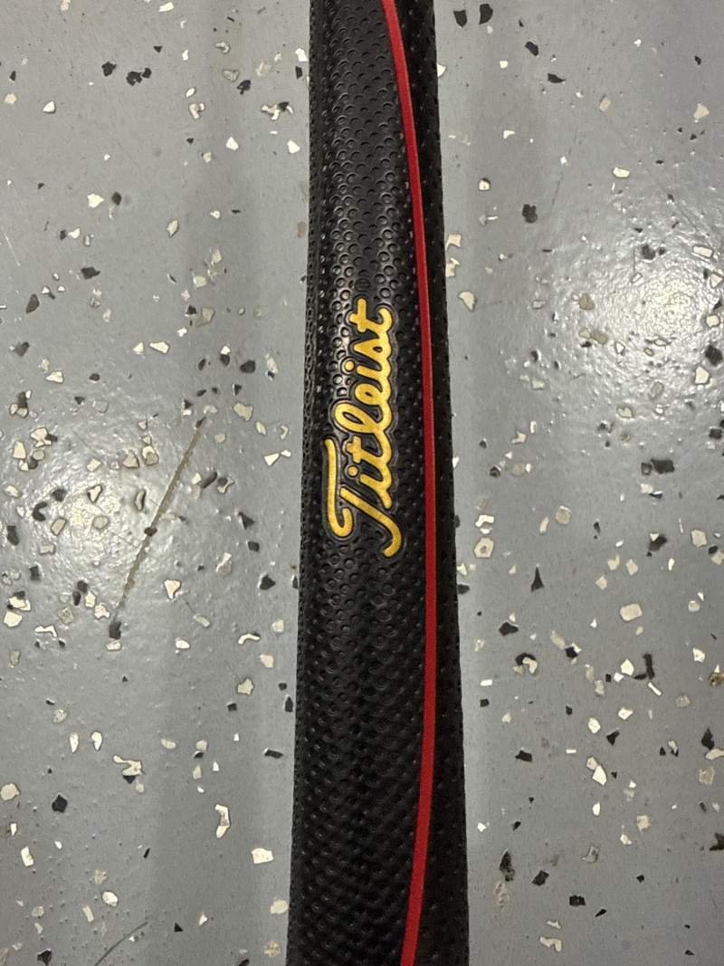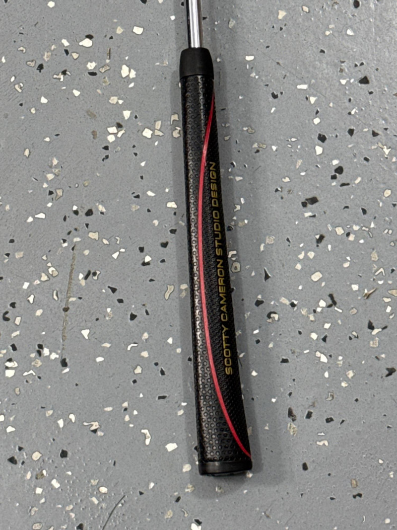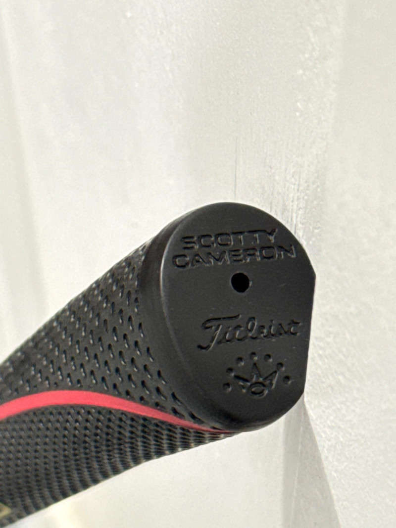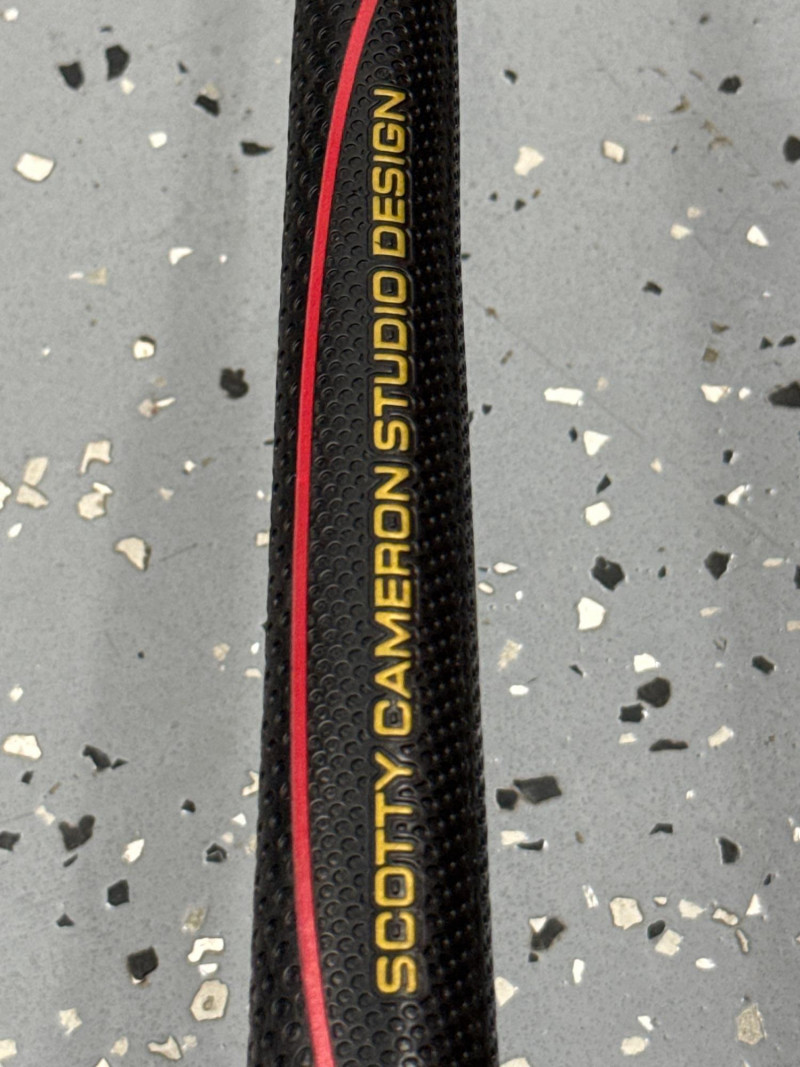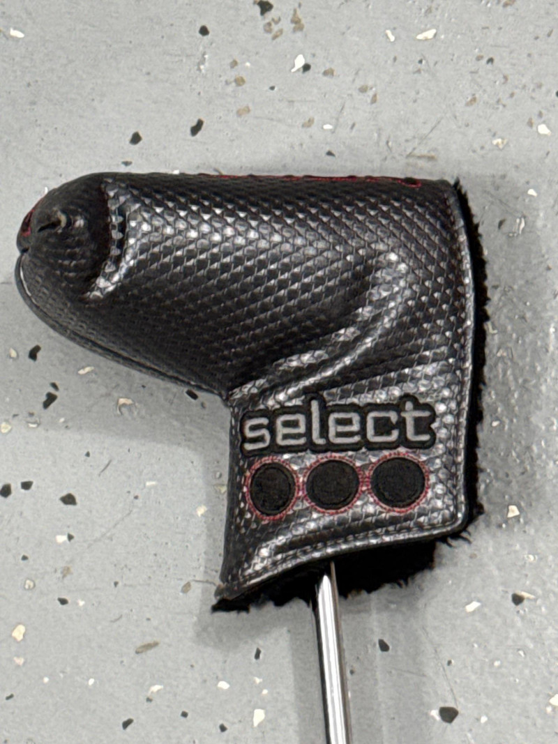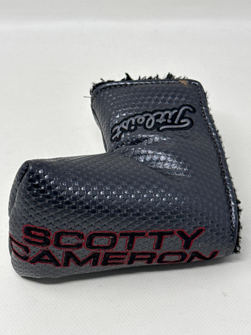 Overview: A Scotty Cameron GOLO 3 putter head made by Titleist. Includes head cover. The shot focuses on the striking details of the club face and sole.