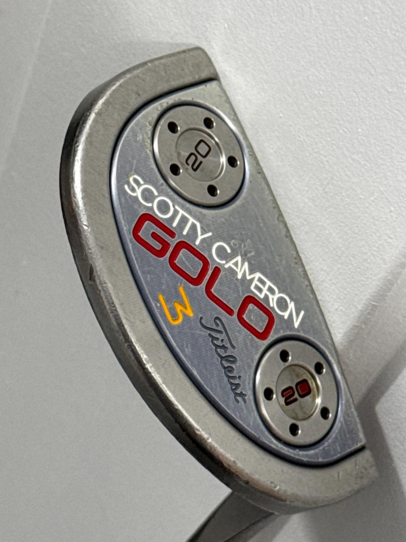 Visible features: Two circular perimeter weights each marked 20; a central badge with SCOTTY CAME7RON in white, GOLO in red, and 3 in yellow; the Titleist script logo in cursive. The finish and machining details suggest a premium, precision-crafted head and shaft.
