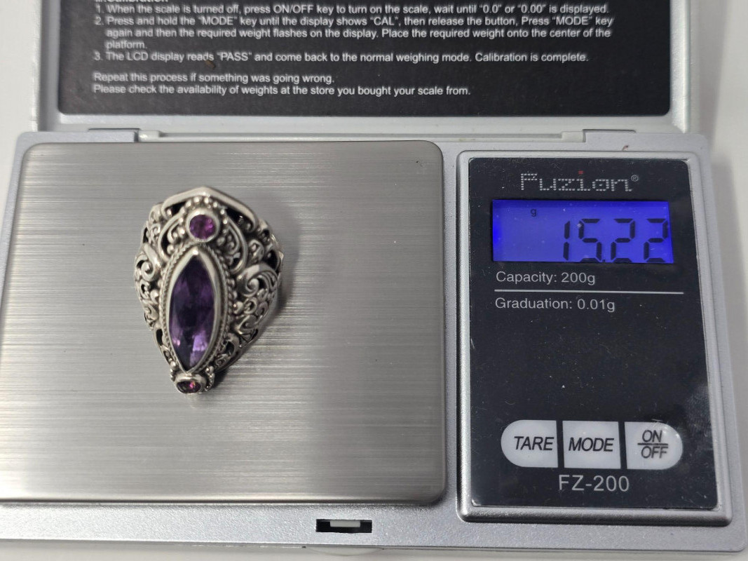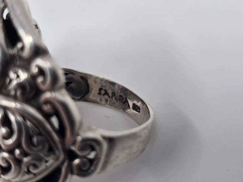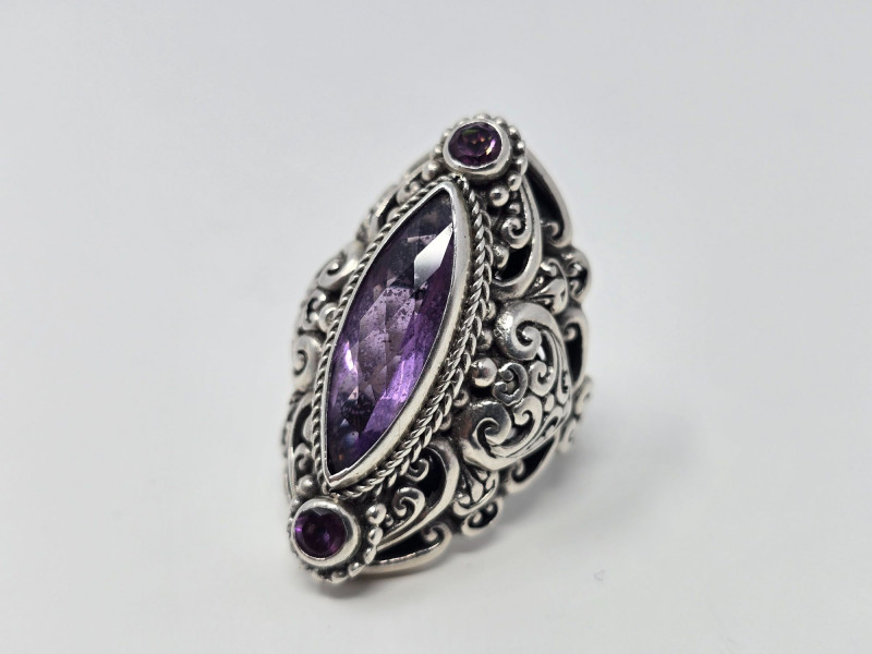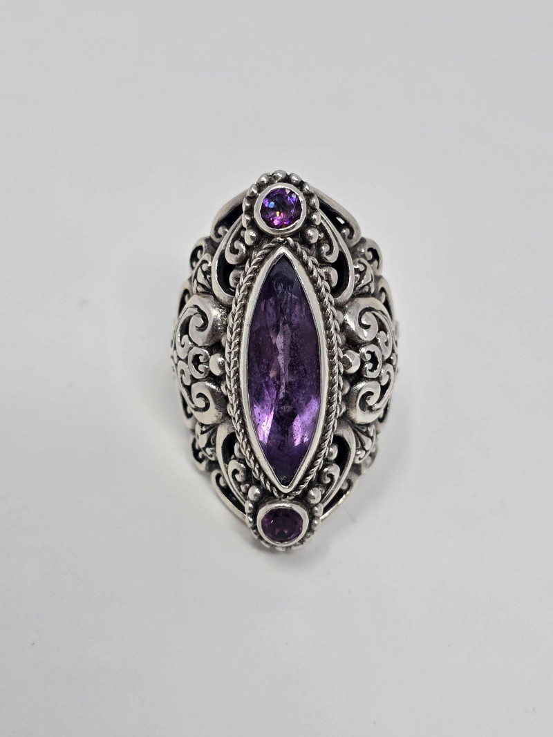 A bold vintage cocktail ring crafted in sterling silver, featuring a marquise-cut faceted purple stone in an ornate filigree setting. The ring is stamped 925 and shows very minimal wear from light use. The stone has not been tested and is not confirmed to be amethyst. Details: Metal: Sterling silver (stamped 925) Stone: Faceted marquise-cut purple gemstone (untested; not confirmed as amethyst) Ring Size: 7.5-8 approx. Total Weight: 15.22 grams Condition: Very light wear; no notable damage; clean and well‑kept Markings: “SARDA” maker’s mark on inner band Notes: