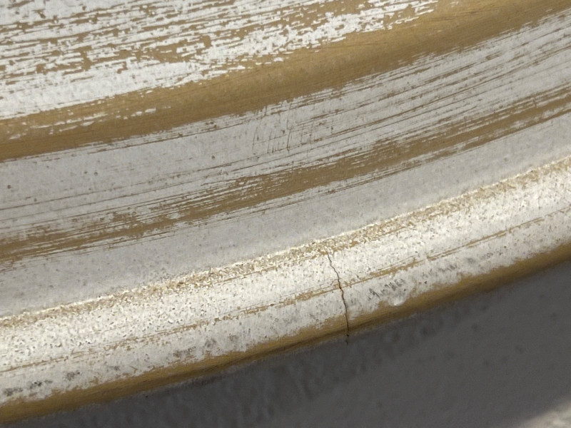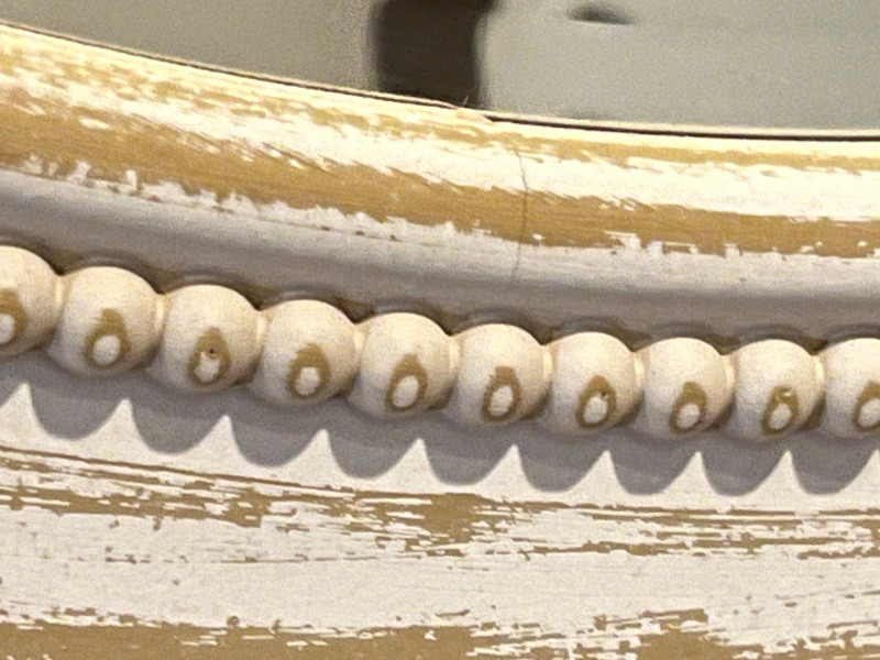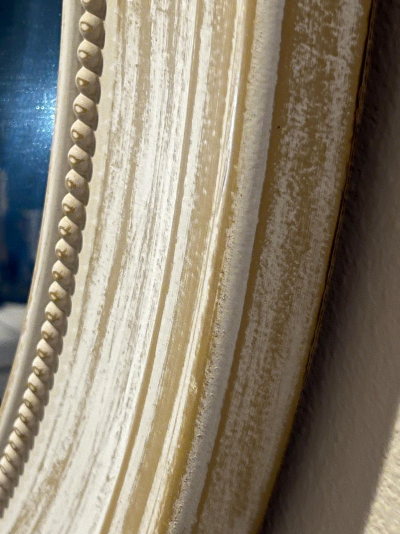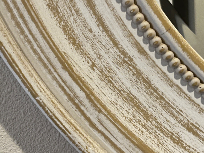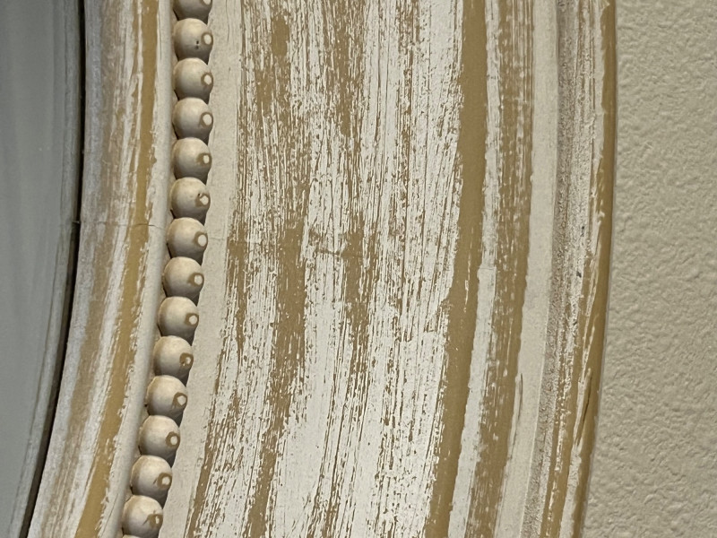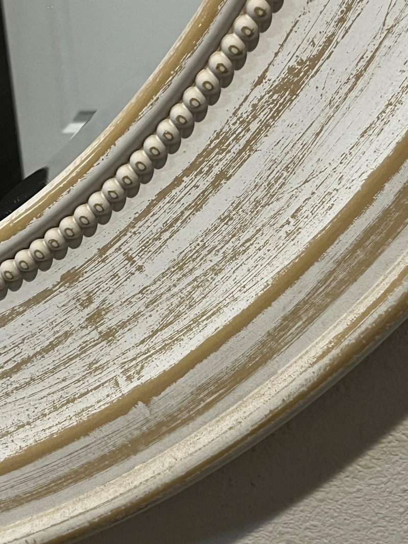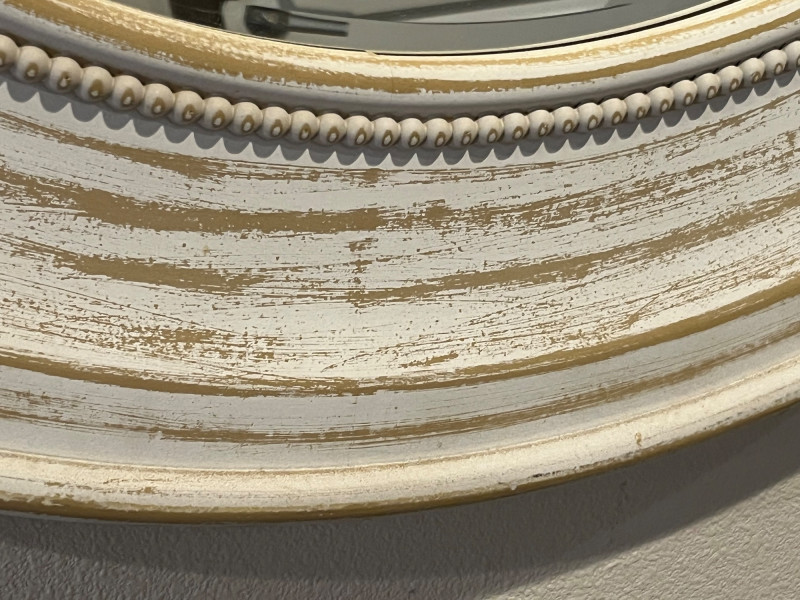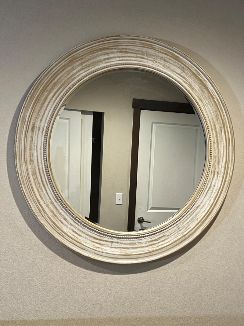 Large circular wall mirror featuring a wide, sculpted frame with an intentionally distressed rustic finish. The frame displays layered paint wear, exposed undertones, and a beaded outer edge that adds depth and texture. The mirror presents a warm, timeworn aesthetic suitable for farmhouse, industrial, and vintage‑inspired interiors. The glass is clear and reflective with no chips or cracks. A light stain is present on the backing only and is not visible when the mirror is hung. The piece has a substantial visual presence and serves well as a focal point above a console, mantel, or entryway. Dimensions: Approx. 42" diameter
