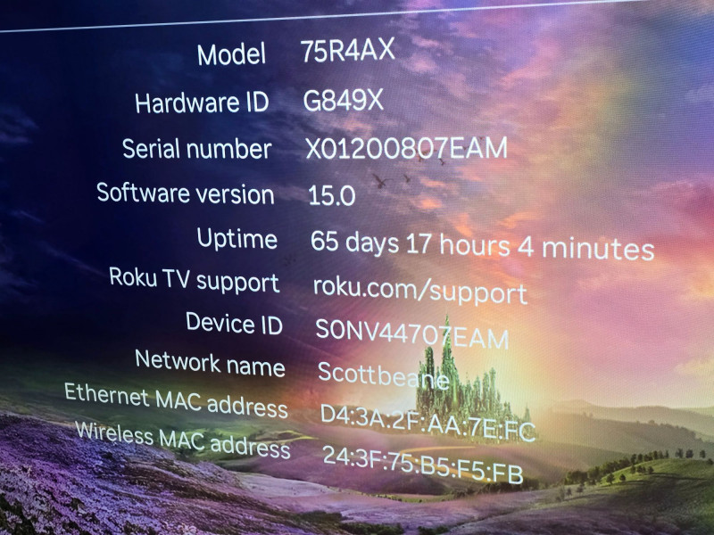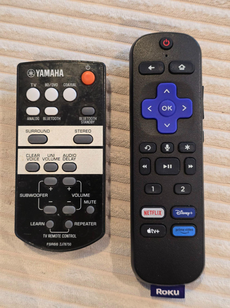 Large‑format 75" Roku 75R4AX UHD smart television paired with a Yamaha ATS‑1030 soundbar. The television includes both the original feet for tabletop placement and mounting hardware for wall installation. Roku remote and Yamaha soundbar remote included. Roku 75R4AX 75" UHD Smart Television Integrated Roku streaming platform Yamaha ATS‑1030 soundbar HDMI and digital audio connectivity Includes both remotes (Roku TV + Yamaha soundbar) Includes wall‑mount hardware Includes original feet for tabletop setup Fully functional television and soundbar Clean display with no cracks or panel damage Inputs and outputs tested Both remotes tested and responsive Roku 75R4AX 75" Television Yamaha ATS‑1030 Soundbar Roku remote Yamaha soundbar remote Wall‑mount hardware Original feet for tabletop placement Power cablesFeatures