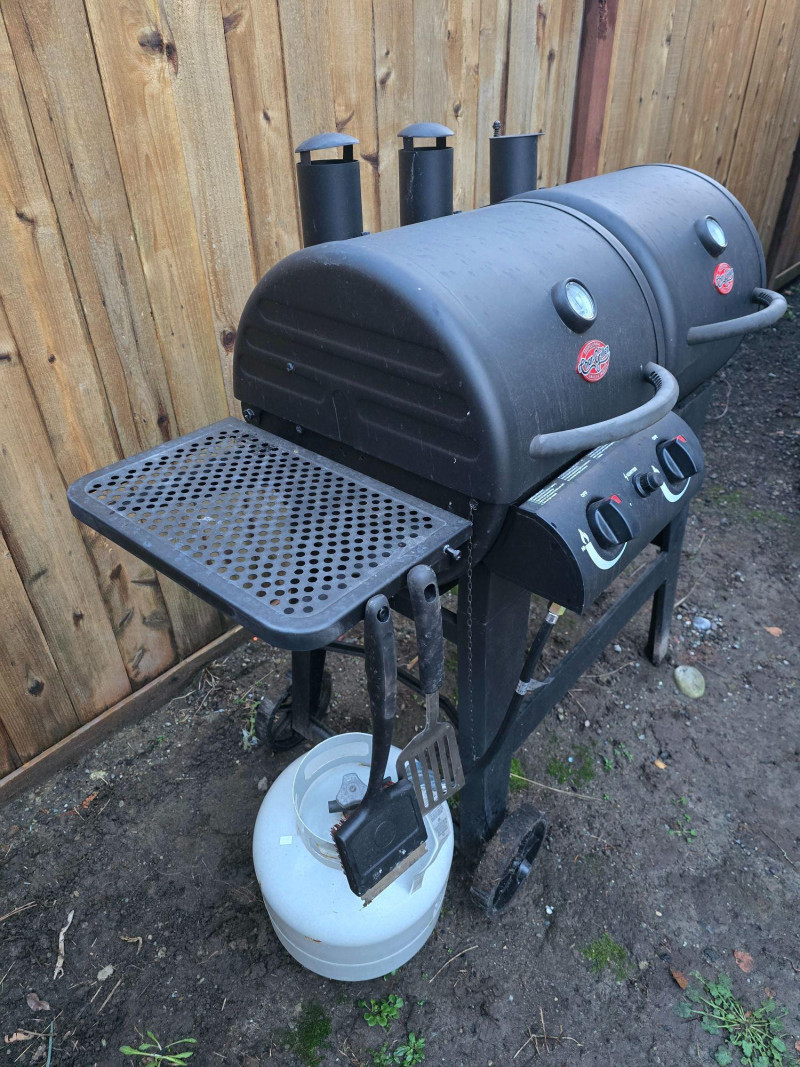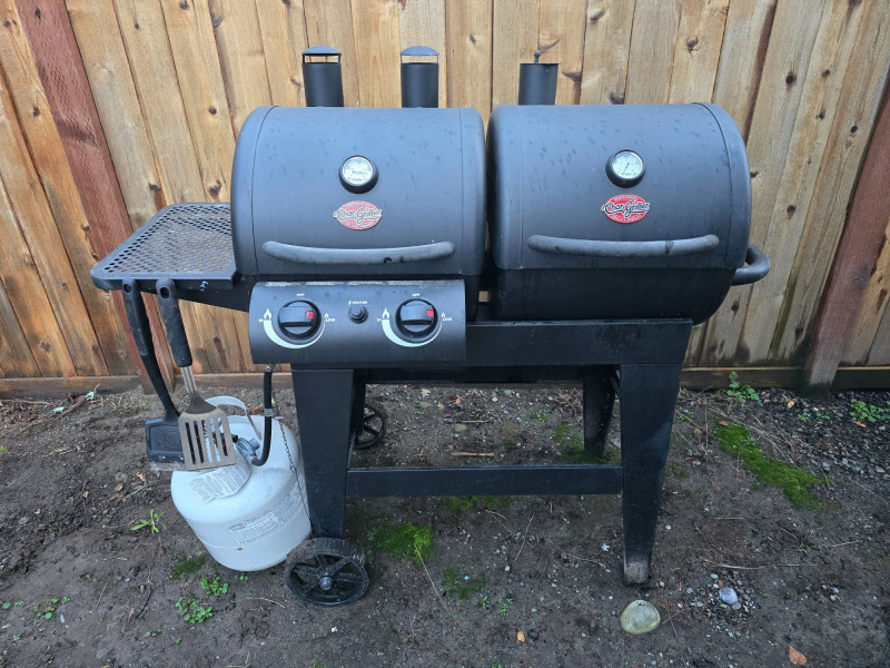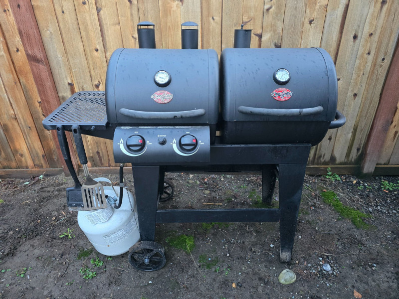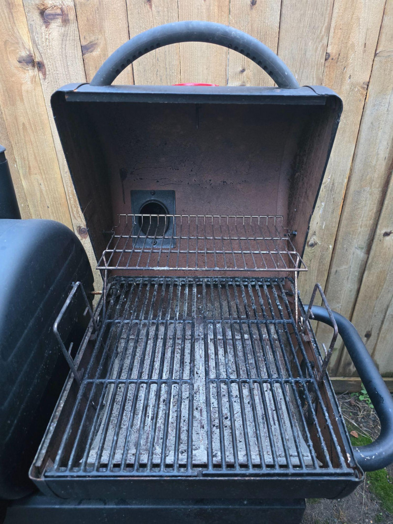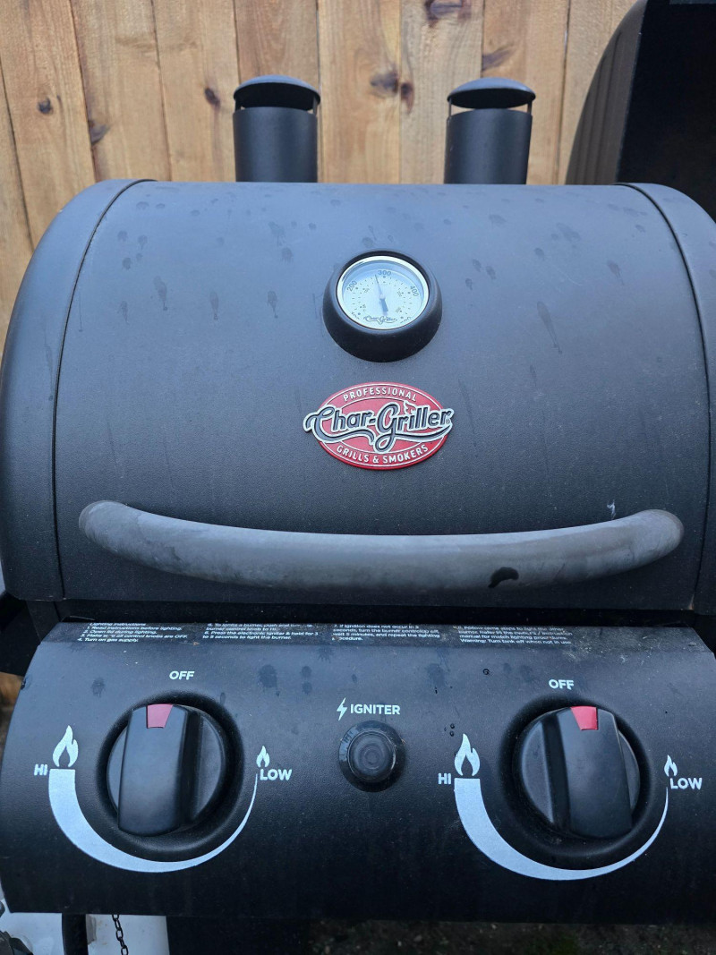 Versatile outdoor grill offering dual cooking zones: one for propane gas and one for traditional charcoal. Ideal for backyard cooks who want the flexibility of quick‑start gas grilling and the flavor depth of charcoal. Features include: Model: Char‑Griller E5030 Dimensions: Approx. 48" W x 28" D x 49" H Cooking Area: 870 sq in total Two independent grilling compartments (gas + charcoal) Char‑Griller branded built‑in thermometer (100°F–700°F range) Protective grill cover included Sturdy steel construction with vented lids Mounted on wheeled frame for mobility Used condition with signs of outdoor exposure. Thermometer face is clear and functional. Grill surfaces show typical wear from use. Please review all images for condition details.