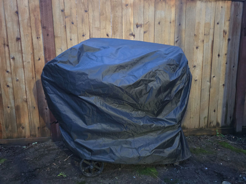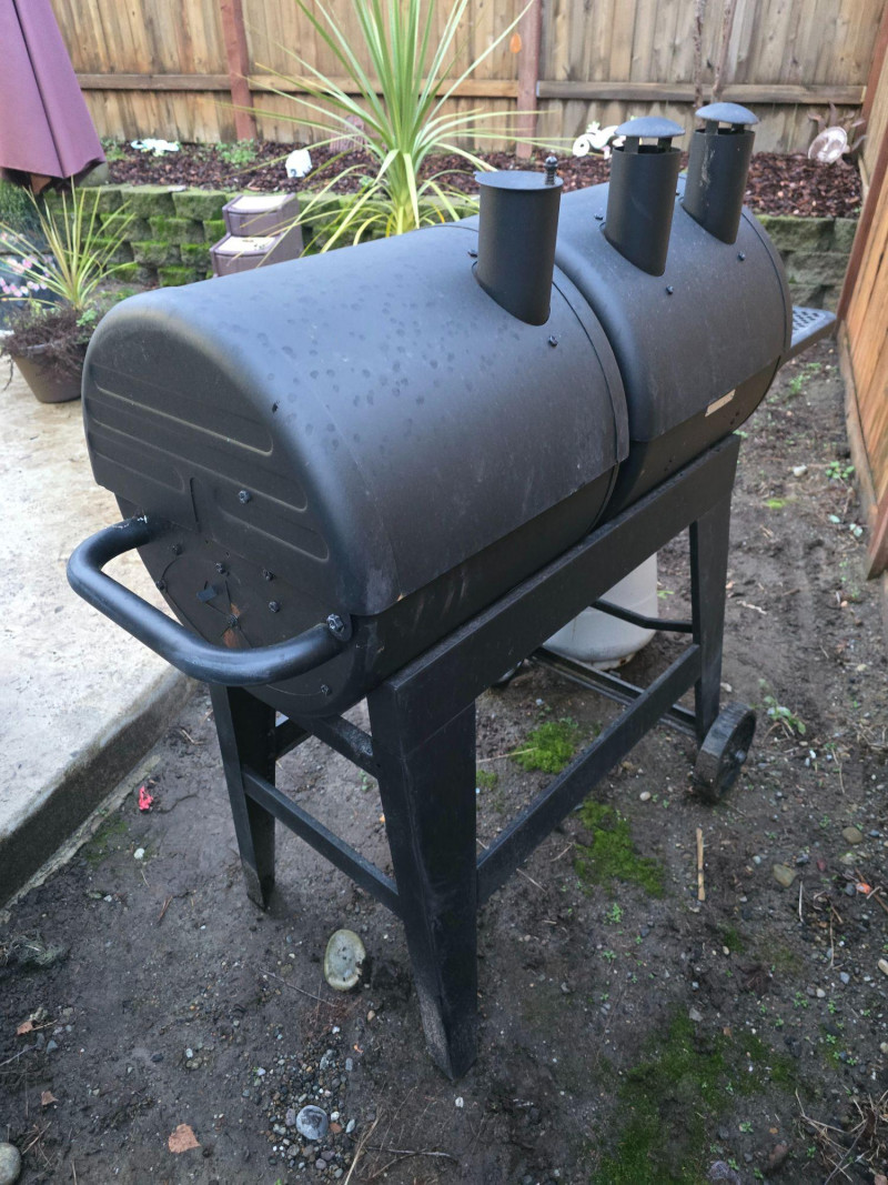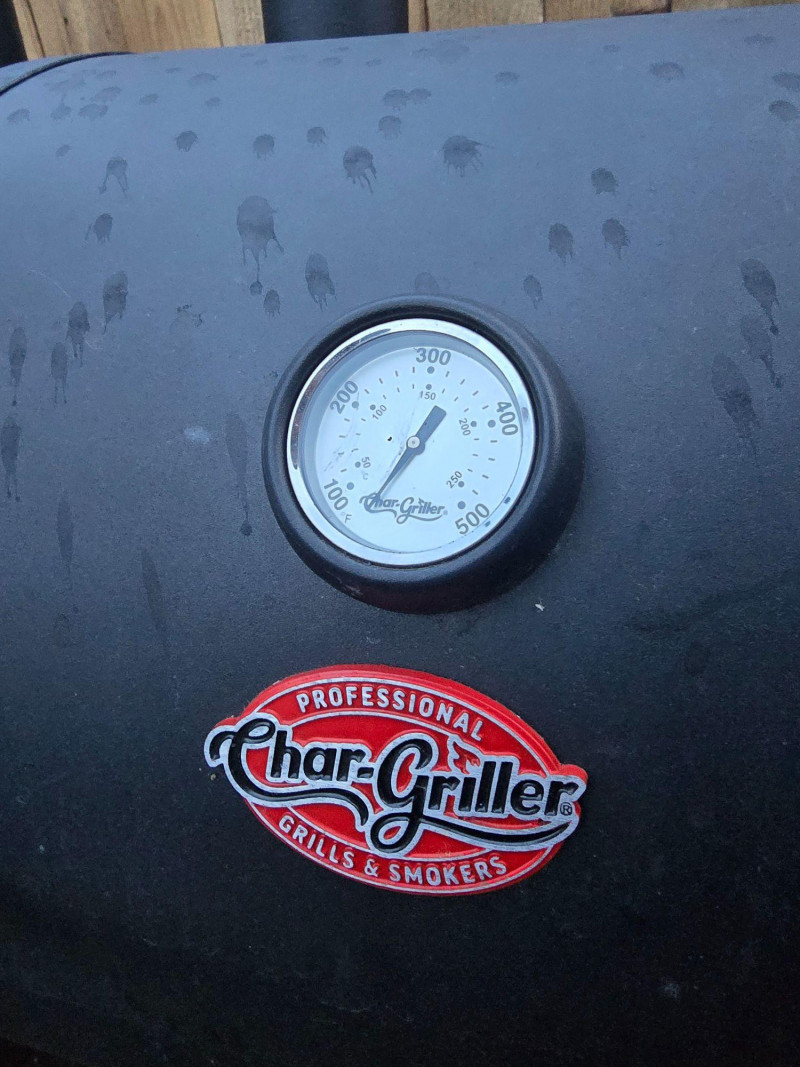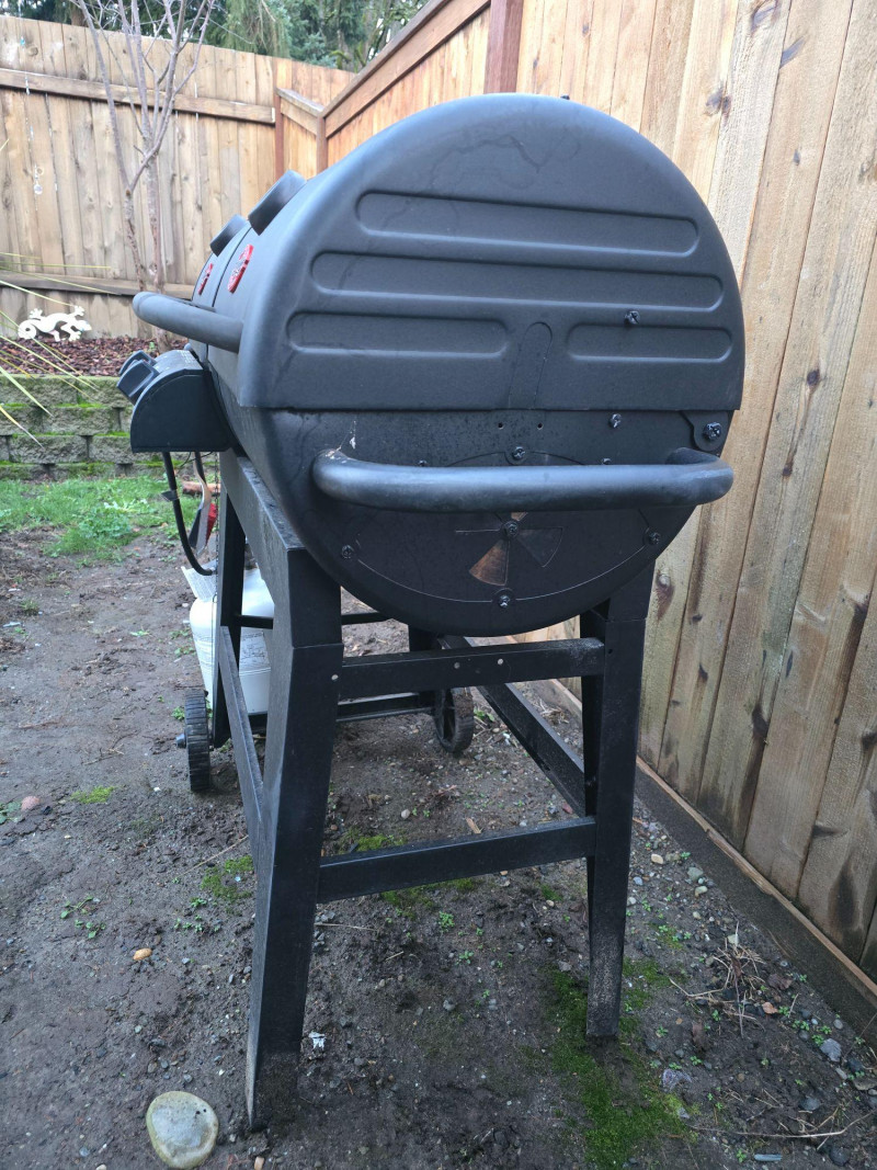 Versatile outdoor grill offering dual cooking zones: one for propane gas and one for traditional charcoal. Ideal for backyard cooks who want the flexibility of quick‑start gas grilling and the flavor depth of charcoal. Features include: Model: Char‑Griller E5030 Dimensions: Approx. 48" W x 28" D x 49" H Cooking Area: 870 sq in total Two independent grilling compartments (gas + charcoal) Char‑Griller branded built‑in thermometer (100°F–700°F range) Protective grill cover included Sturdy steel construction with vented lids Mounted on wheeled frame for mobility Used condition with signs of outdoor exposure. Thermometer face is clear and functional. Grill surfaces show typical wear from use. Please review all images for condition details.