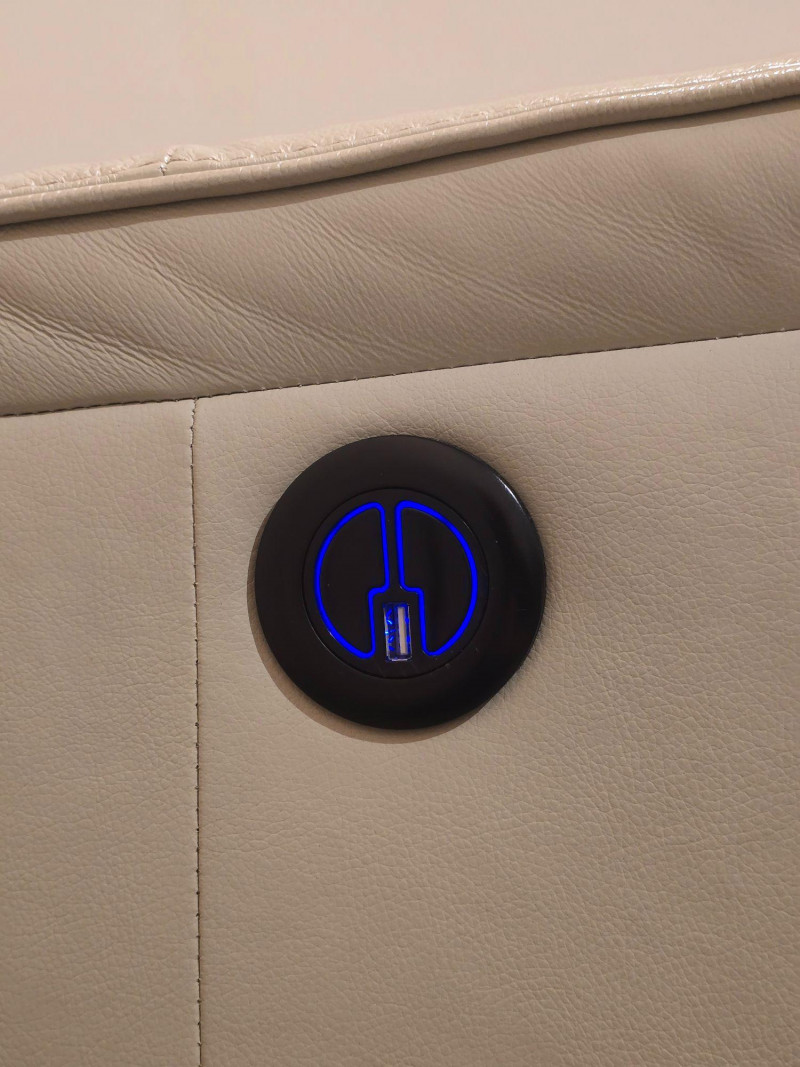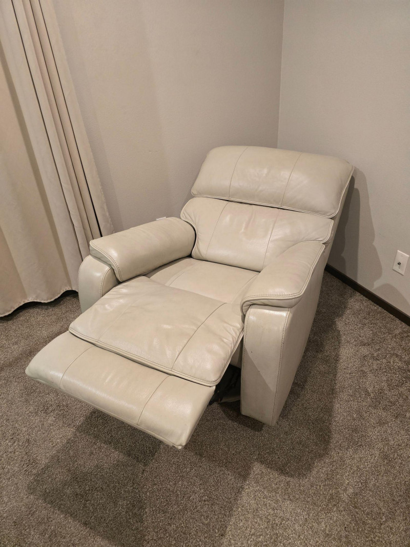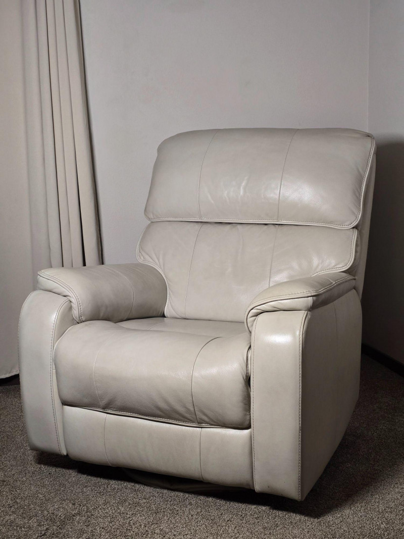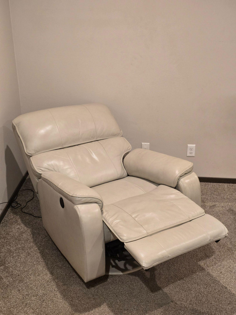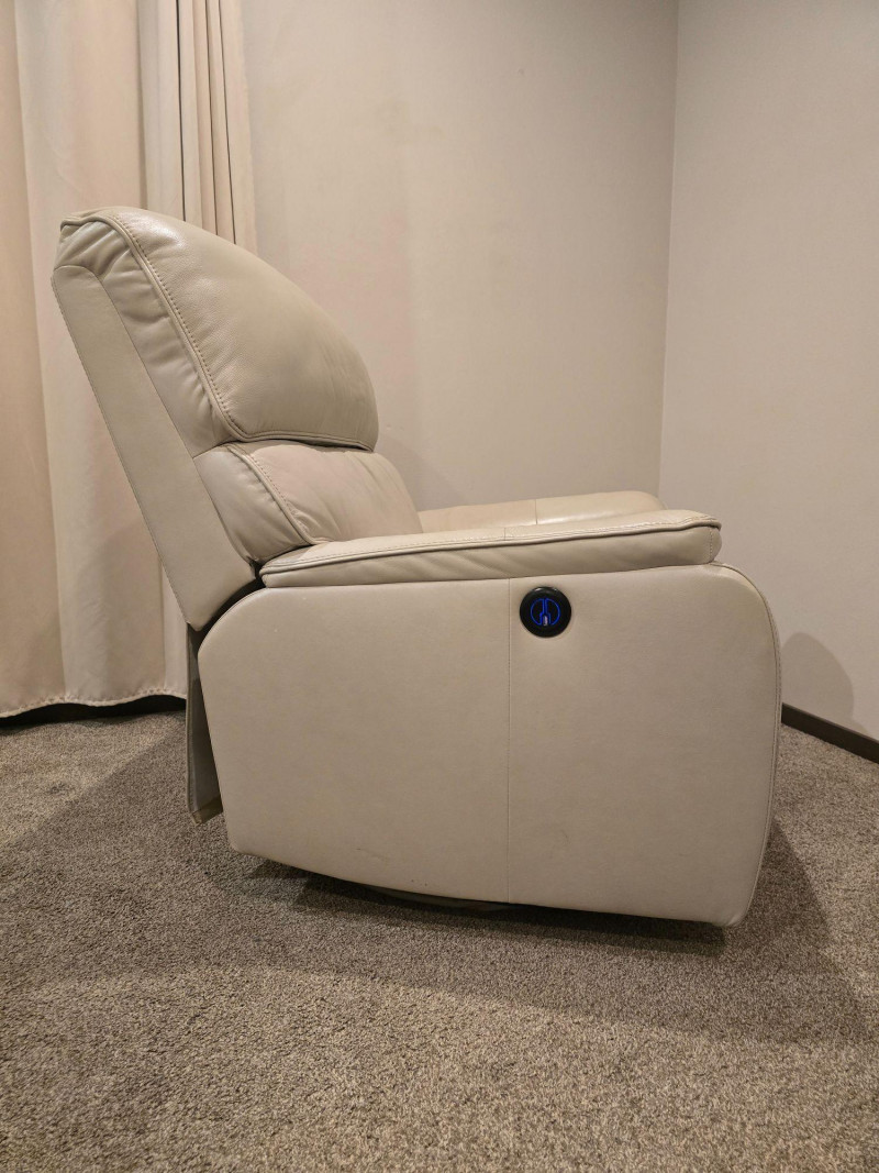 Modern comfort meets clean design in this light beige leather power recliner. Upholstered in smooth, high-quality leather with tailored stitching and a streamlined silhouette. Features a motorized reclining mechanism with integrated footrest and a blue-illuminated control button that includes a built-in USB port for convenient device charging. Upholstery: Light beige leather Function: Power recline with footrest extension Controls: Illuminated button (blue LED) with integrated USB charging port Condition: Excellent; tested and fully functional Notes: Includes close-up of leather texture and stitching; all angles photographed for clarity A versatile piece suited for living rooms, media spaces, or reading nooks. Quiet motor operation and neutral tone complement a range of interiors. See all photos for details.