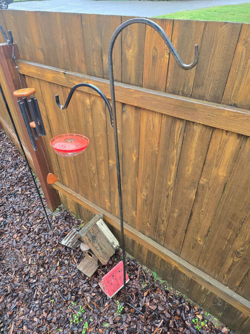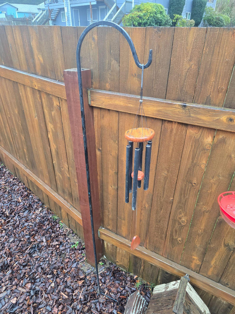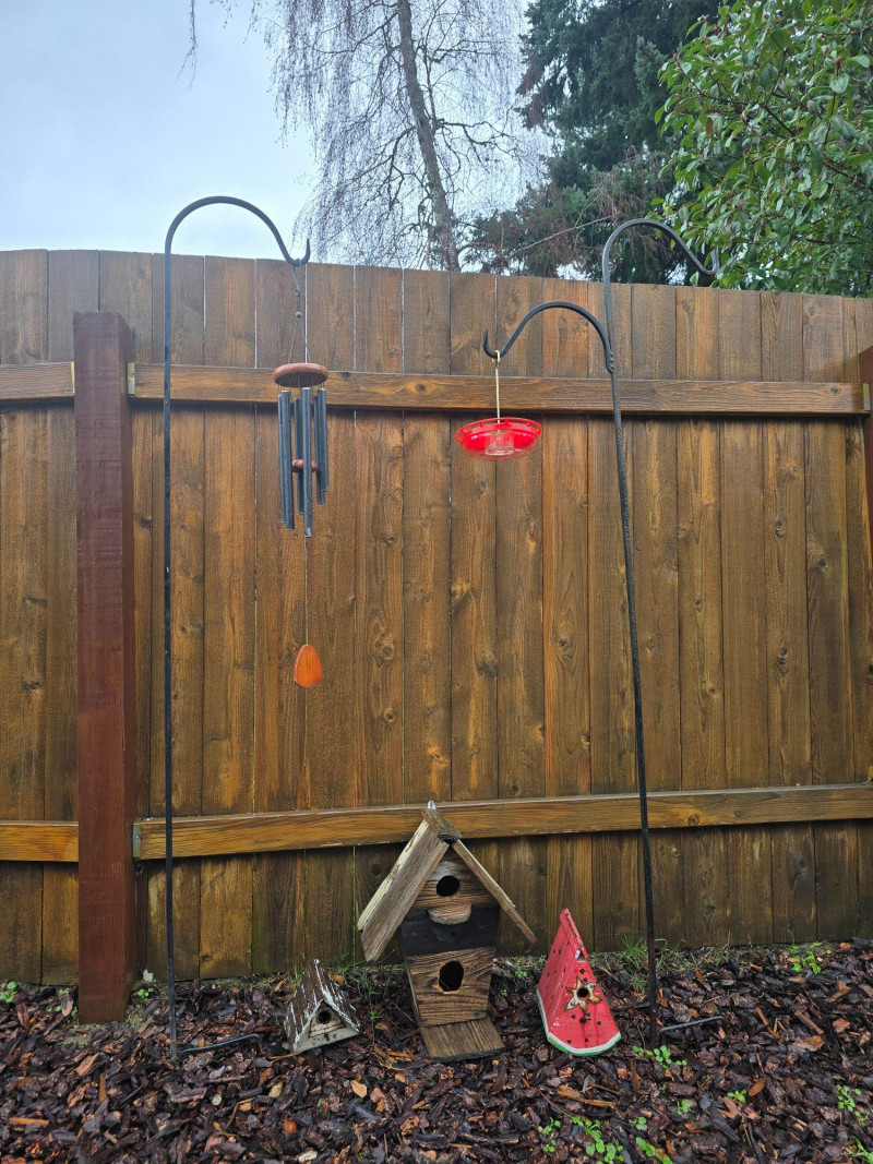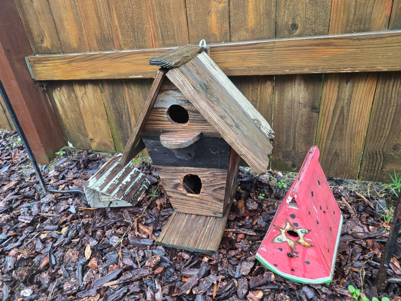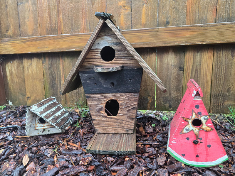 Outdoor garden décor ensemble featuring three rustic wooden birdhouses, a coordinating wind chime, and a matching bird feeder. The wind chimes and bird feeder are each mounted on individual metal stakes for easy placement in soil, mulch, or landscaped beds. The three birdhouses are freestanding decorative pieces, photographed together to show scale, style, and overall presentation. This set brings a charming, handcrafted look to any garden or patio setting. Highlights: Includes three wooden birdhouses, one wind chime, and one bird feeder Wind chimes and bird feeder come on metal stakes for ground installation Birdhouses feature varied rooflines and entry designs for visual interest Natural wood construction with rustic outdoor appeal Photographed in natural light with mulch and fence backdrop Condition: