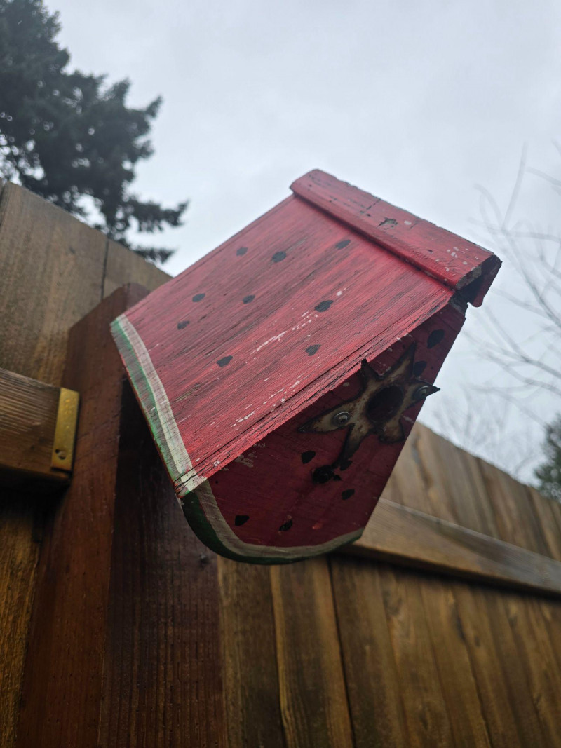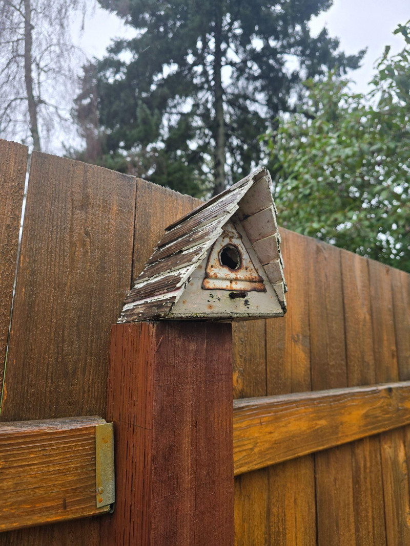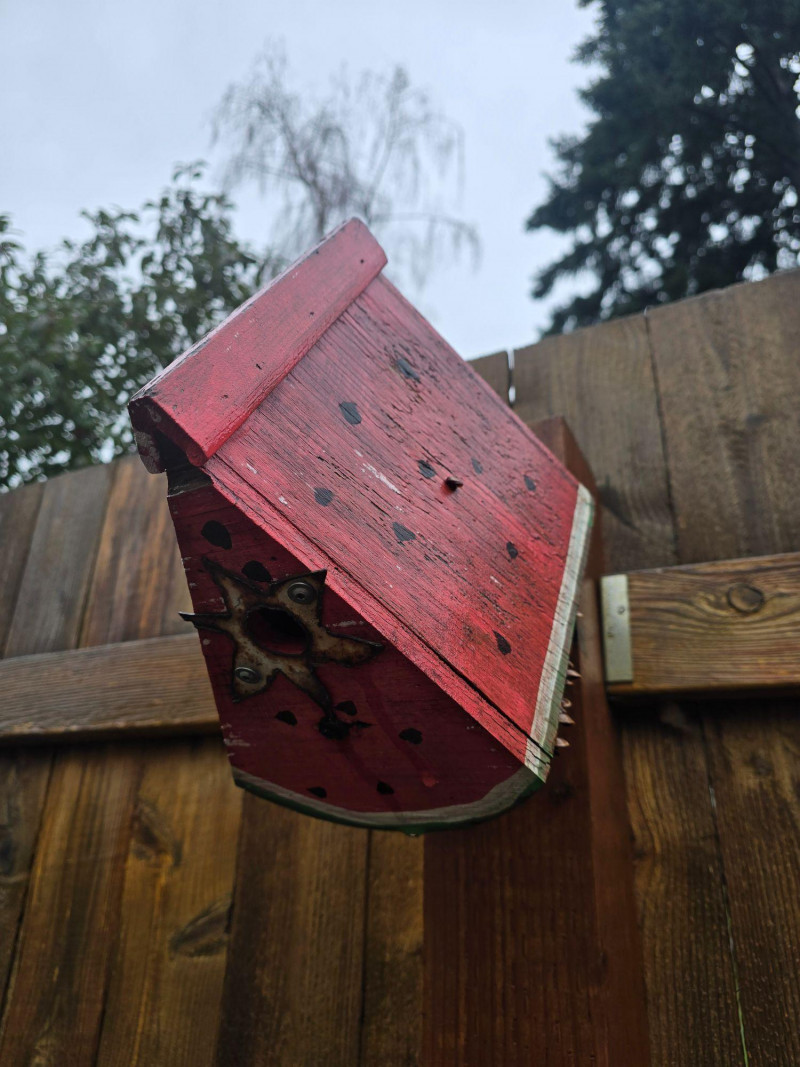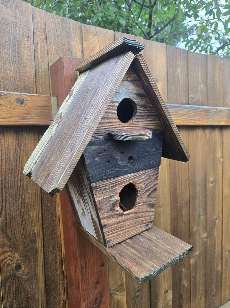 Outdoor garden décor ensemble featuring three rustic wooden birdhouses, a coordinating wind chime, and a matching bird feeder. The wind chimes and bird feeder are each mounted on individual metal stakes for easy placement in soil, mulch, or landscaped beds. The three birdhouses are freestanding decorative pieces, photographed together to show scale, style, and overall presentation. This set brings a charming, handcrafted look to any garden or patio setting. Highlights: Includes three wooden birdhouses, one wind chime, and one bird feeder Wind chimes and bird feeder come on metal stakes for ground installation Birdhouses feature varied rooflines and entry designs for visual interest Natural wood construction with rustic outdoor appeal Photographed in natural light with mulch and fence backdrop Condition: