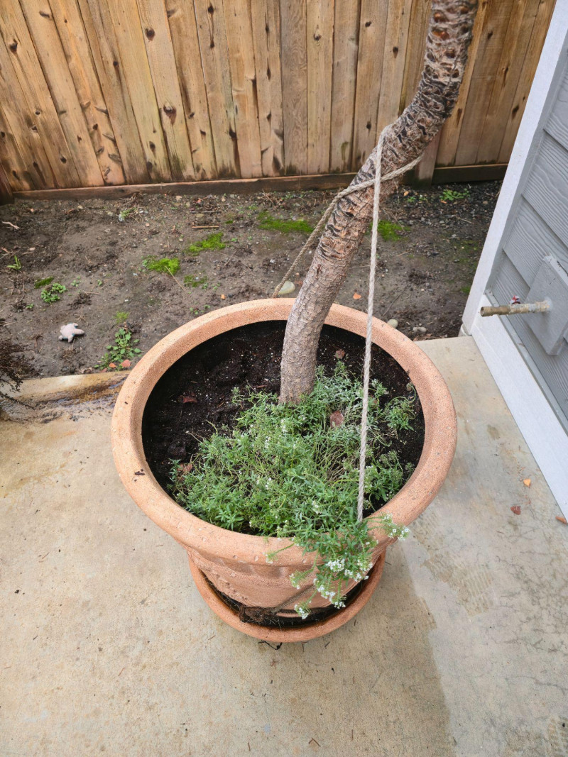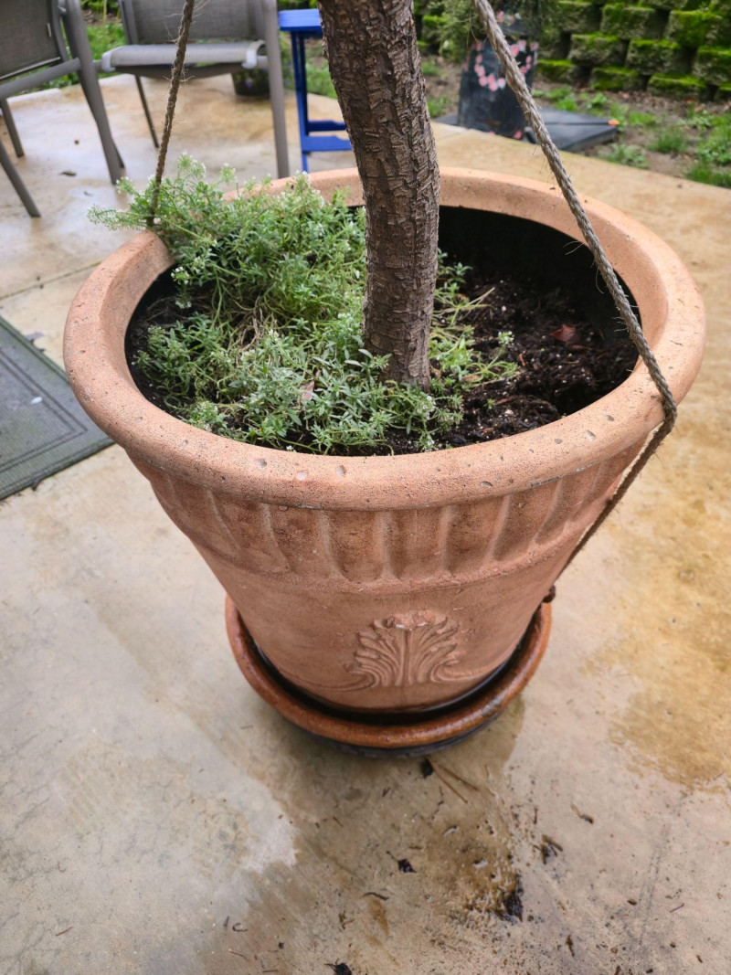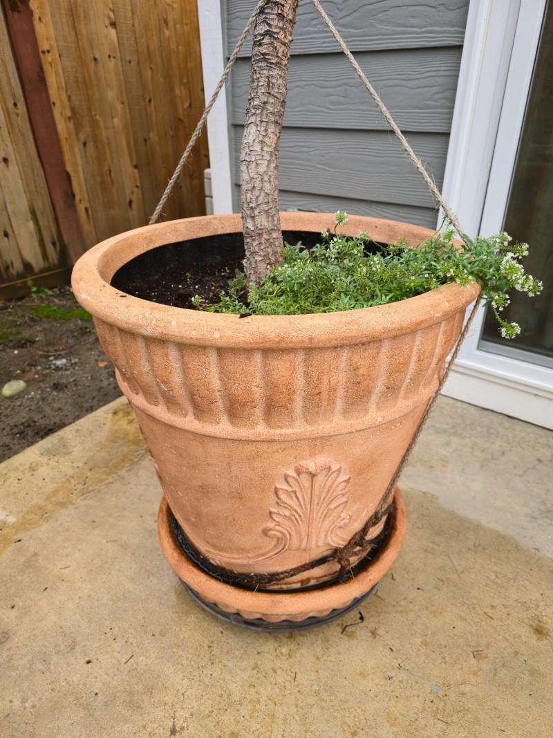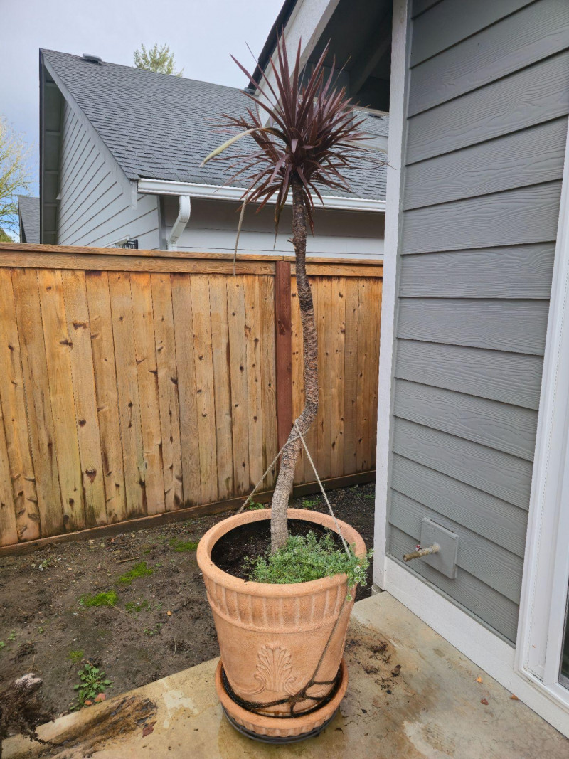 Striking mature Red Star Cordyline in decorative terracotta pot. Plant stands approx. 80" tall with deep burgundy foliage and upright growth habit. Pot measures approx. 25"H × 23"W and features classic ribbed detailing with matching saucer. Positioned on patio near fence and siding for scale. Appears healthy and well-established. Ideal for outdoor accent or container gardening. Some wear to pot consistent with age and outdoor use. Please review all photos for condition and scale.