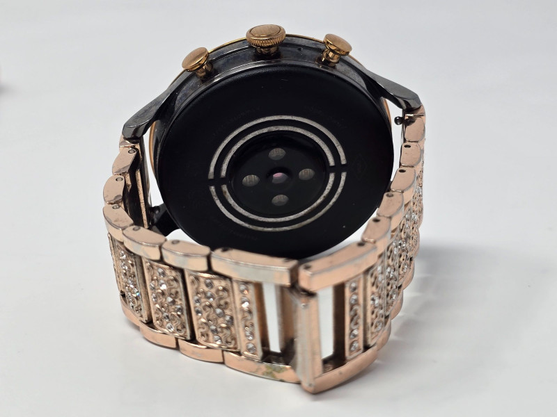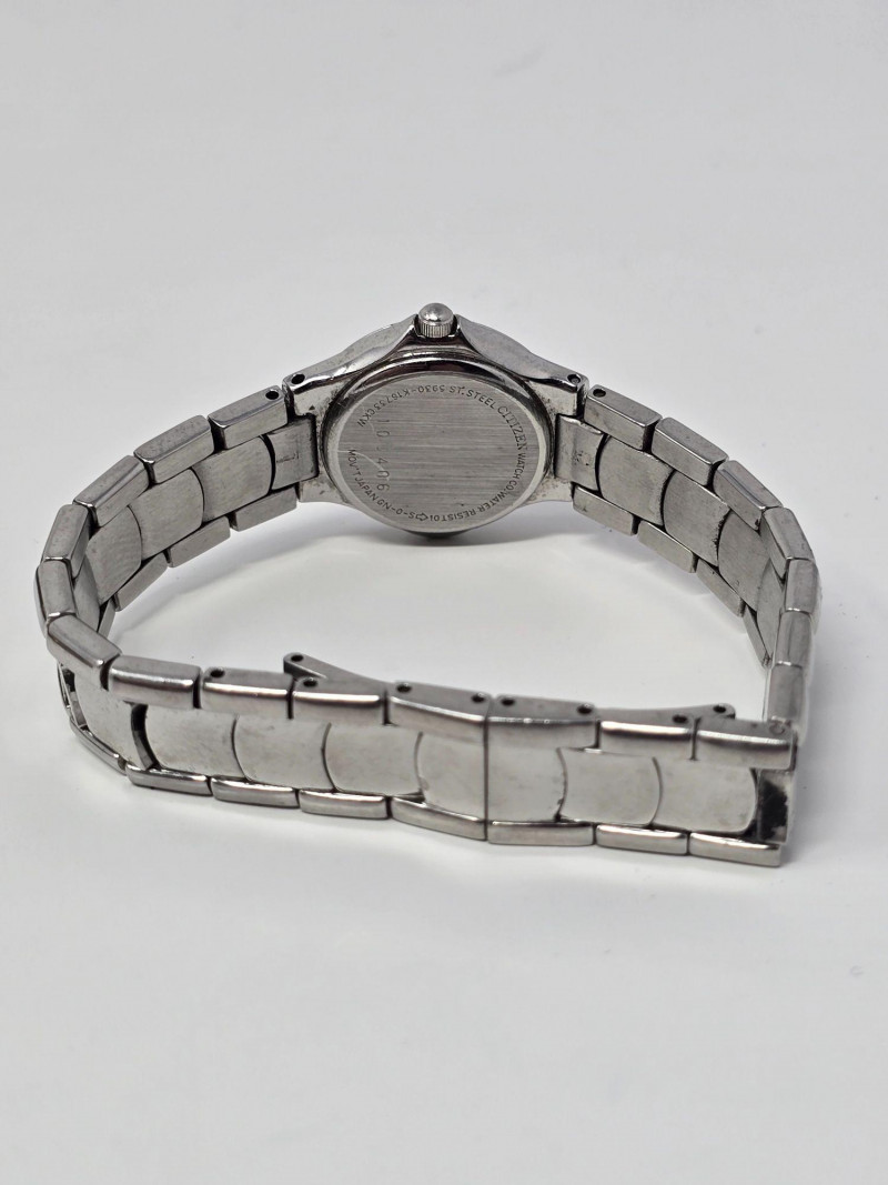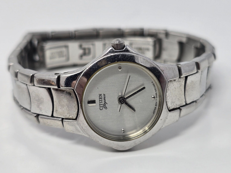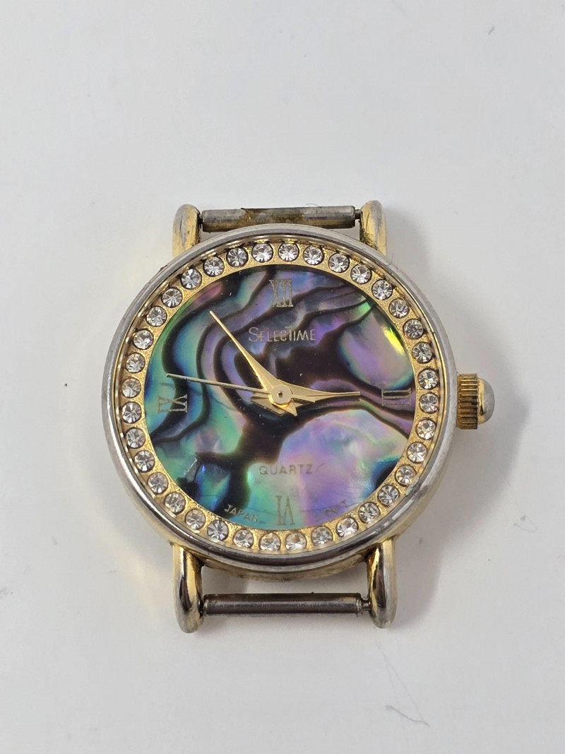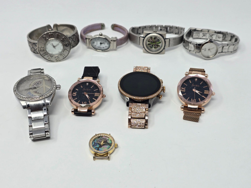 Collection of ladies wristwatches featuring Citizen, Fossil, SelecTime, one unbranded smartwatch, and additional fashion pieces. Mixed analog styles with metal and leather bands. Case backs include markings such as “Stainless Steel Back,” “Base Metal Bezel,” and “Japan Movt.” Condition varies with visible wear consistent with age and use. All watches are battery‑powered and currently non‑functional due to dead batteries. No further testing performed. Sold as‑is. Includes: Citizen Quartz silver‑tone watch Fossil ladies watch with clover‑design dial SelecTime watch with crystal‑accented bezel One unbranded ladies smartwatch Additional fashion watches include various branded & unbranded pieces Please review all photos for condition and details.