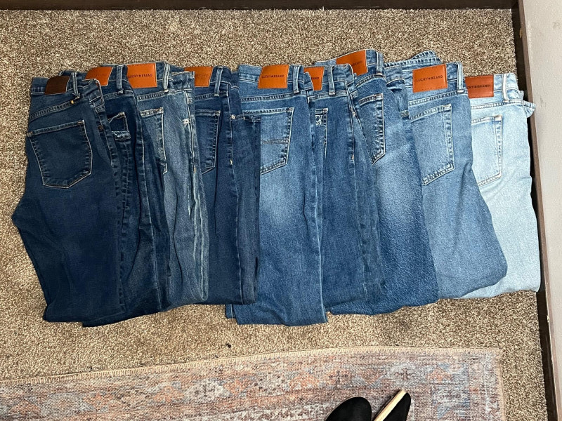 • Remainder denim jeans Fits & Styles: Includes skinny cuts and wider relaxed‑fit jeans Color Washes: Multiple denim washes ranging from dark to light Brands: Primarily Lucky Brand; includes True Religion, Rock Revival, and others Display: Items photographed individually Please review all photos for style, fit, and condition. Items sold as‑is.