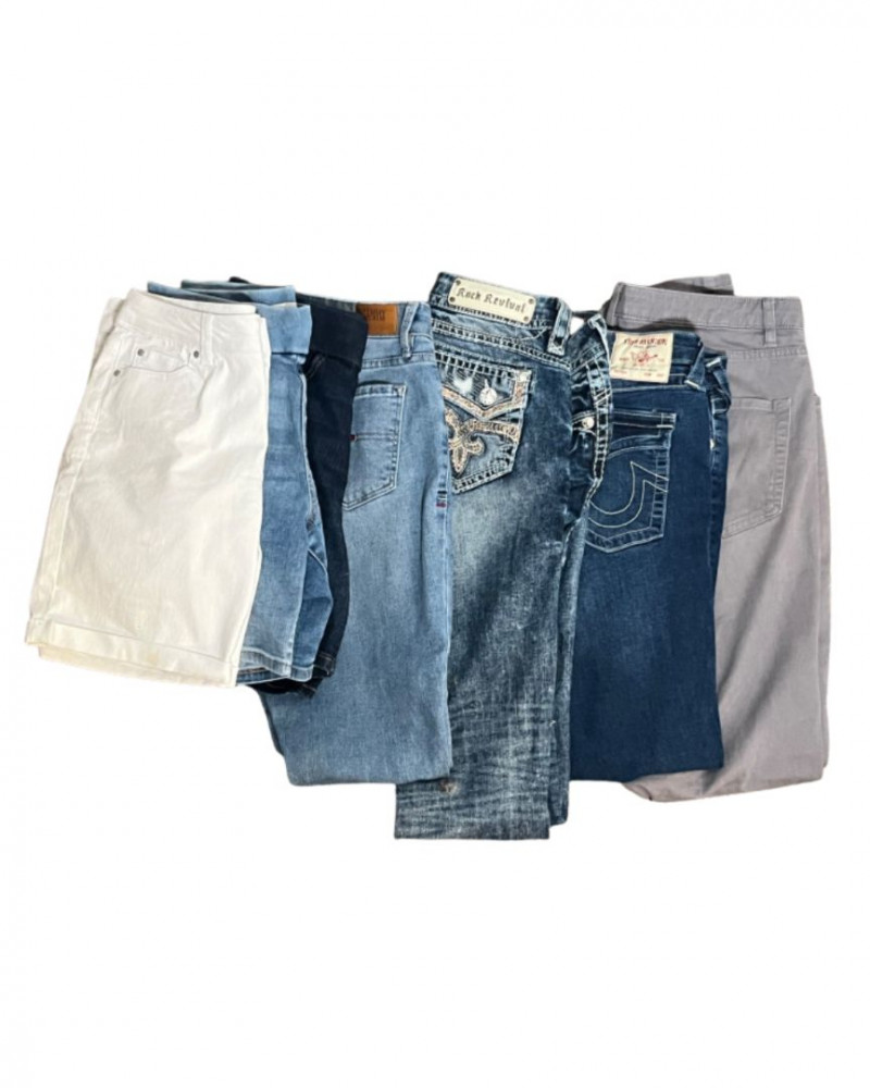 A curated mixed lot of women’s bottoms featuring denim jeans, denim shorts, linen shorts, and linen pants. Brands include Lucky Brand, True Religion, Rock Revival, and additional quality makers. All items present in very great condition, showing light wear to like‑new appearance. Condition: Pre‑owned; very great condition throughout Sizes: Women’s 6/28 through 10 Quantity: Mixed lot of jeans, shorts, and pants Contents: