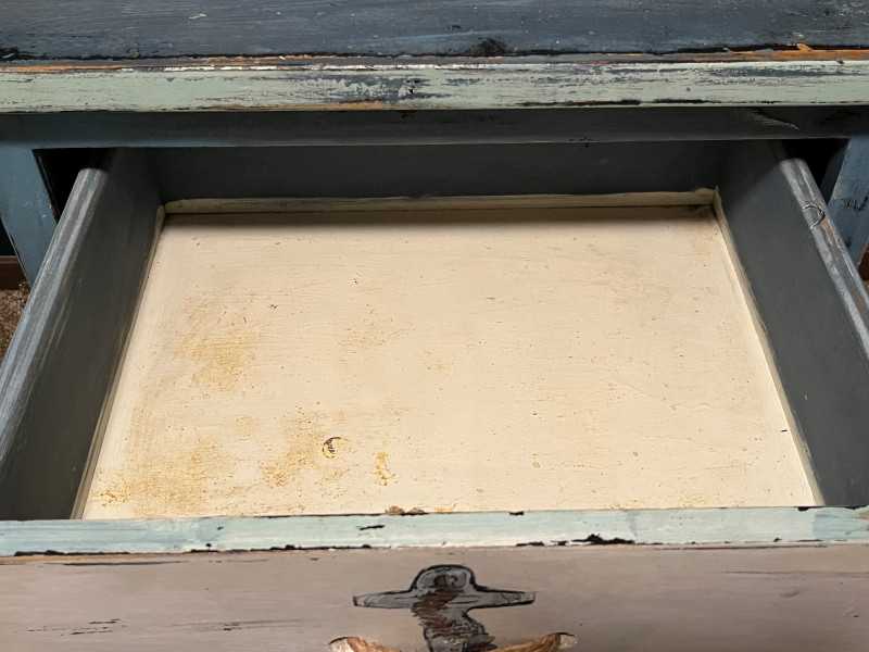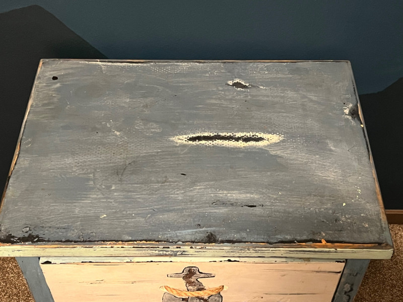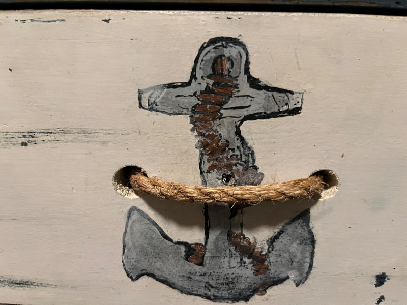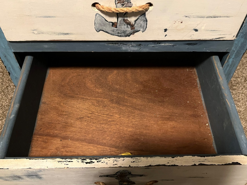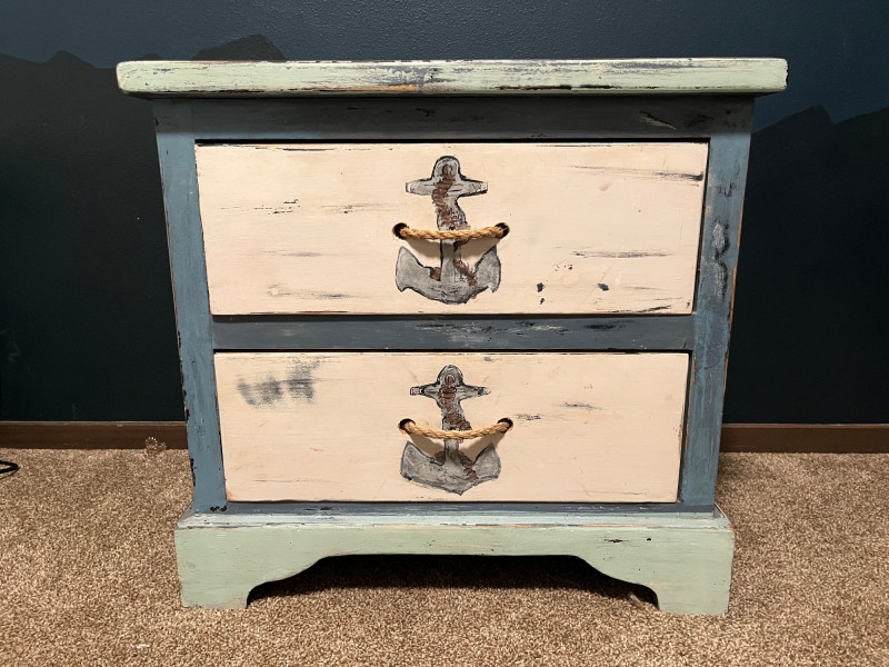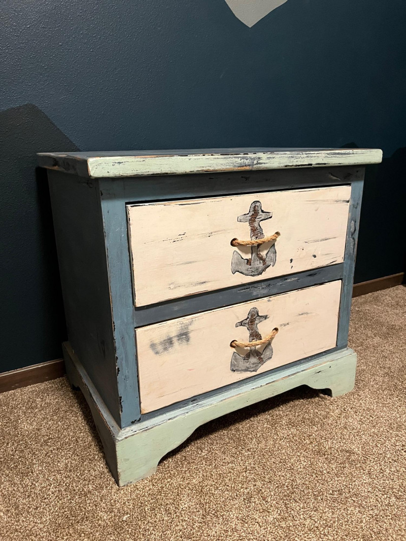 Wooden nightstand finished in a coastal palette of blue, seafoam, and off‑white. Both drawer fronts feature painted anchors at center and true rope pulls. Paint shows intentional distressing consistent with the nautical style; additional areas of wear and small chips present from age and use. Structure remains solid with no noted instability. Images show overall condition, painted surfaces, rope pulls, and areas of wear.