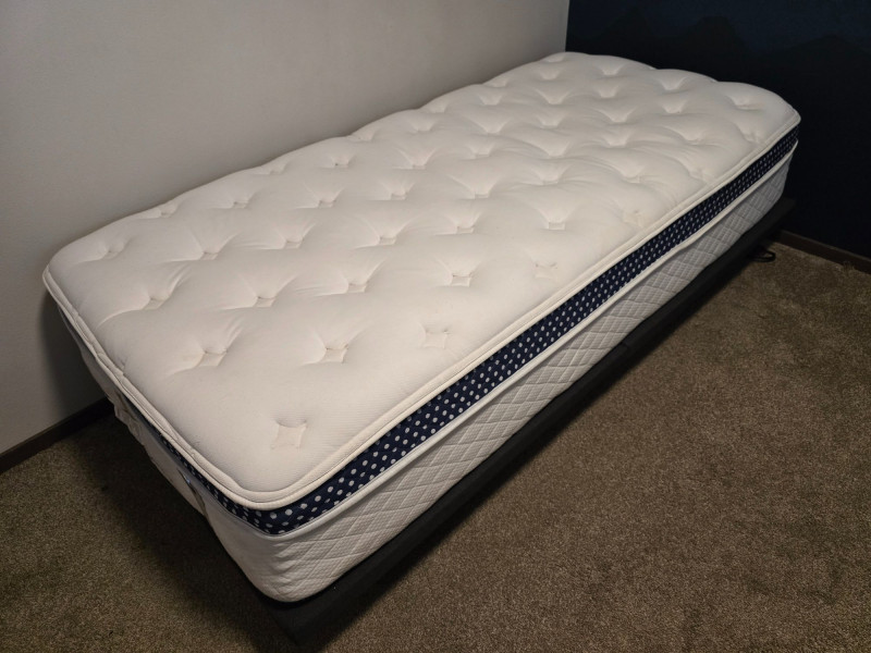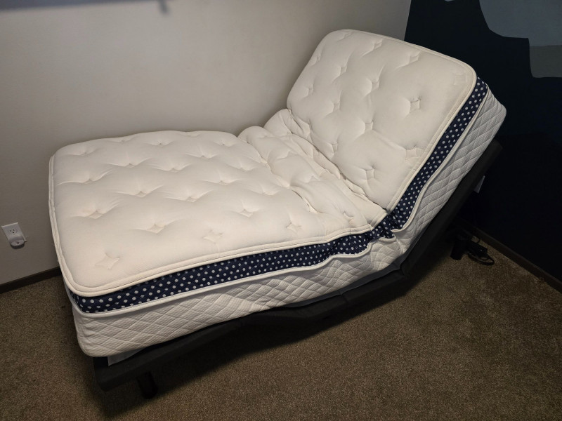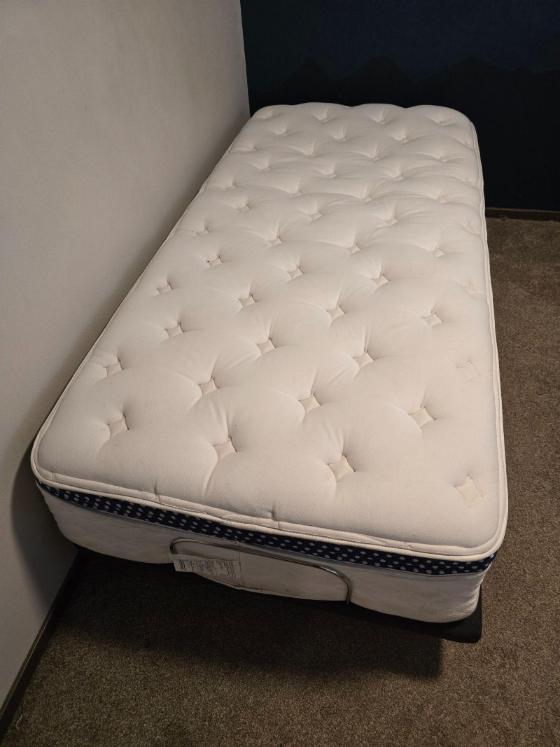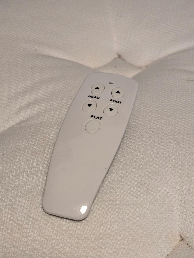 Twin-size adjustable bed frame paired with a very gently used twin mattress. Frame features powered head/foot adjustment operated by the included remote control. Additional feet are included to raise the frame height if desired. Frame shows light cosmetic wear consistent with normal household use. Includes: Twin adjustable bed frame Twin mattress (very gently used) Remote control Extra feet for optional height adjustment Notes: Tested and functioning at time of cataloging Buyer responsible for disassembly and removal