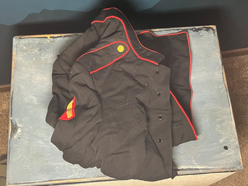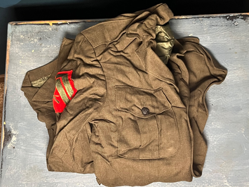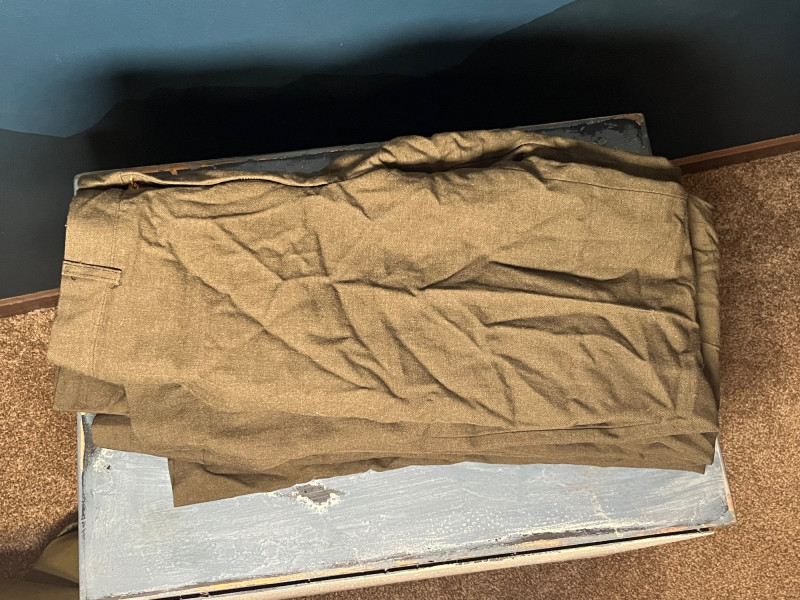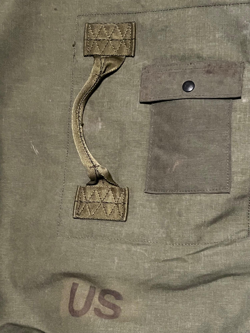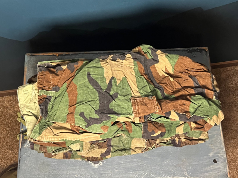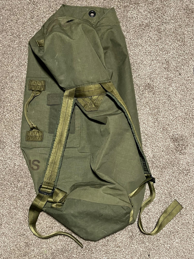 Large U.S. military‑issue duffel bag filled with assorted U.S. Marine Corps uniforms. Includes a mix of dress uniform components and camouflage utility pieces. All items show typical wear from use and storage. Clothing pieces are men’s large where labeled. The duffel bag is fully packed, heavy, and measures nearly 4 ft high when filled. Ideal lot for collectors, reenactors, display, or repurposing.