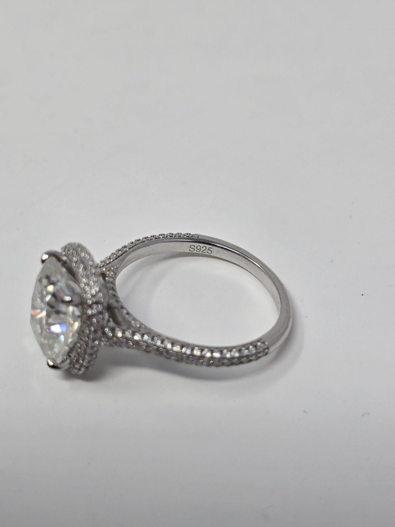 Sterling silver ring stamped 925, featuring an elongated cushion‑cut stone in a classic halo setting. The stone is untested and of unknown type. Fits approximately size 7–7.5. Total weight is 4.12 grams. Condition is great with light wear consistent with gentle use. A refined and elegant piece suitable for daily wear or collection.