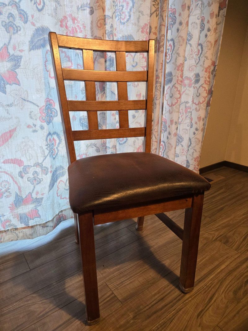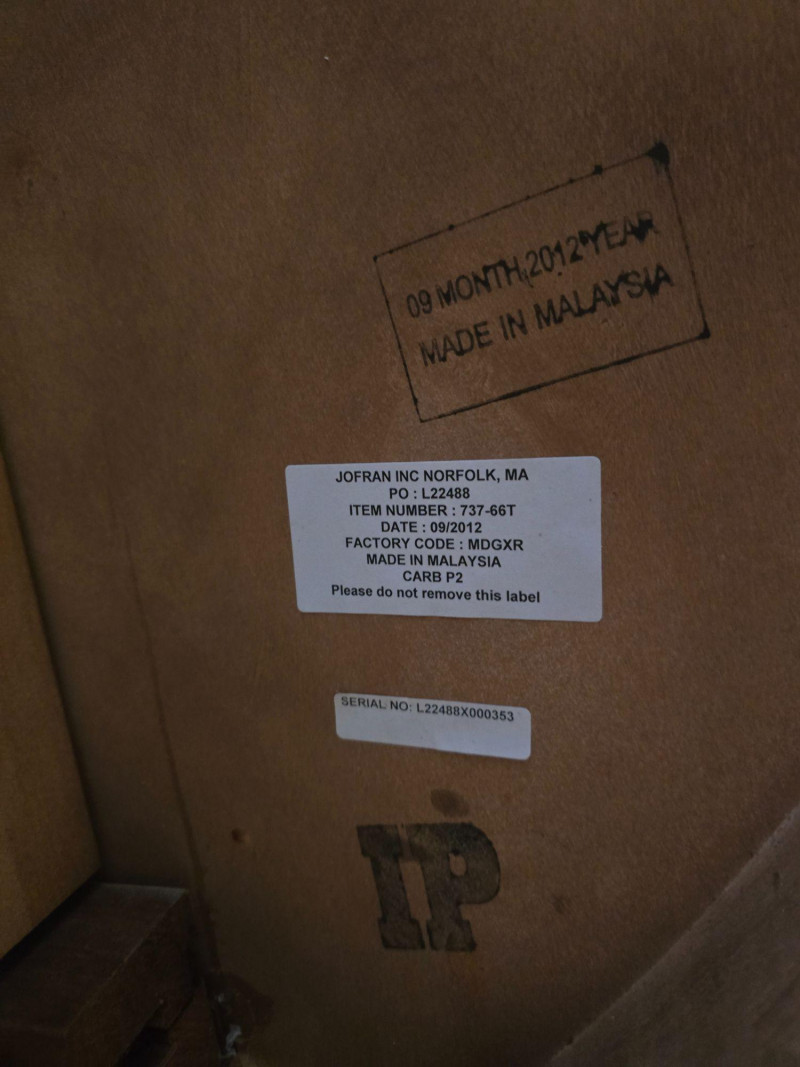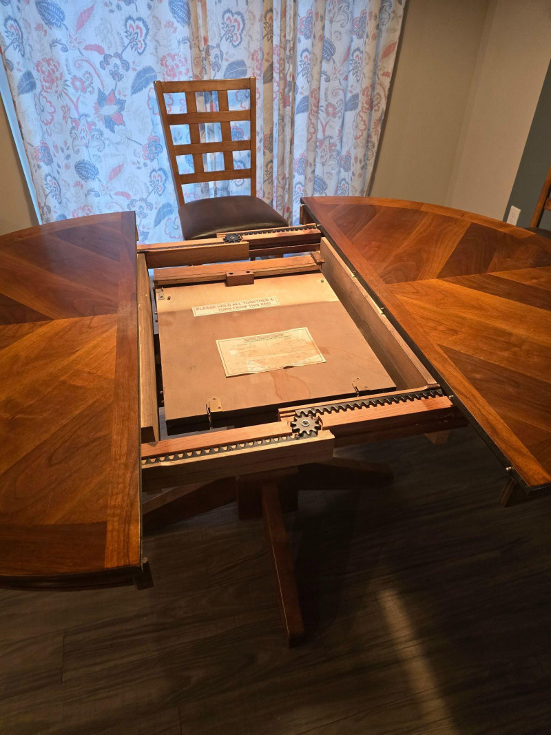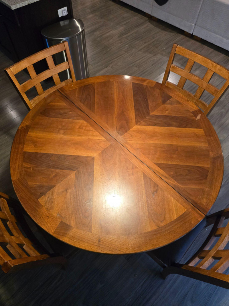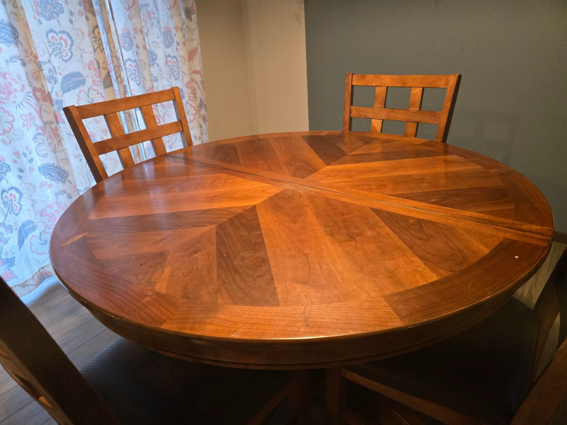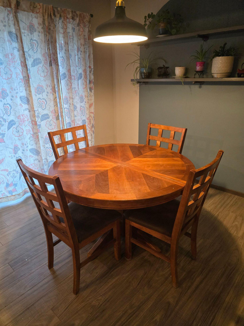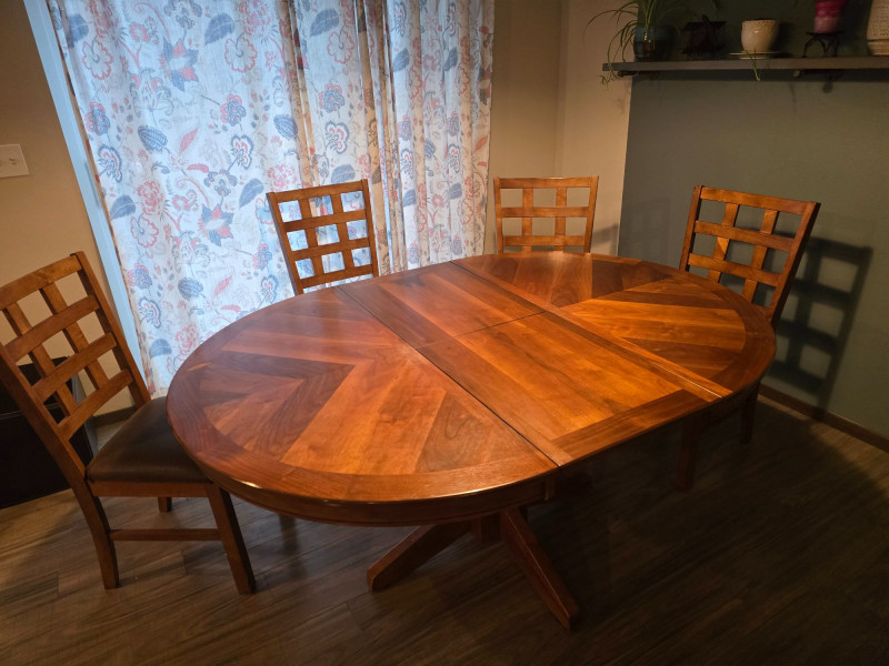 Extension leaf adds 17 3/4inches approx Dining set by Jofran Inc. featuring an extension table and four coordinating chairs. The table includes a built‑in leaf that increases the length for additional seating. Chairs have a matching finish and standard dining height. Solid, functional set suitable for everyday use. Includes: Extension dining table Four matching chairs Condition: