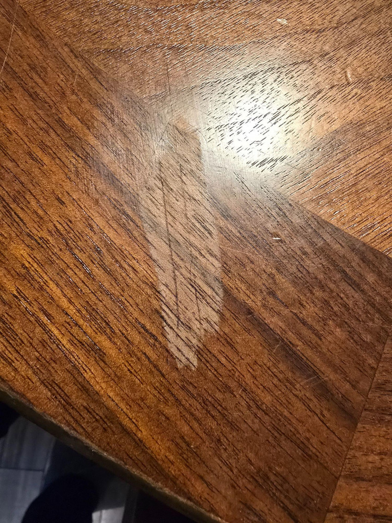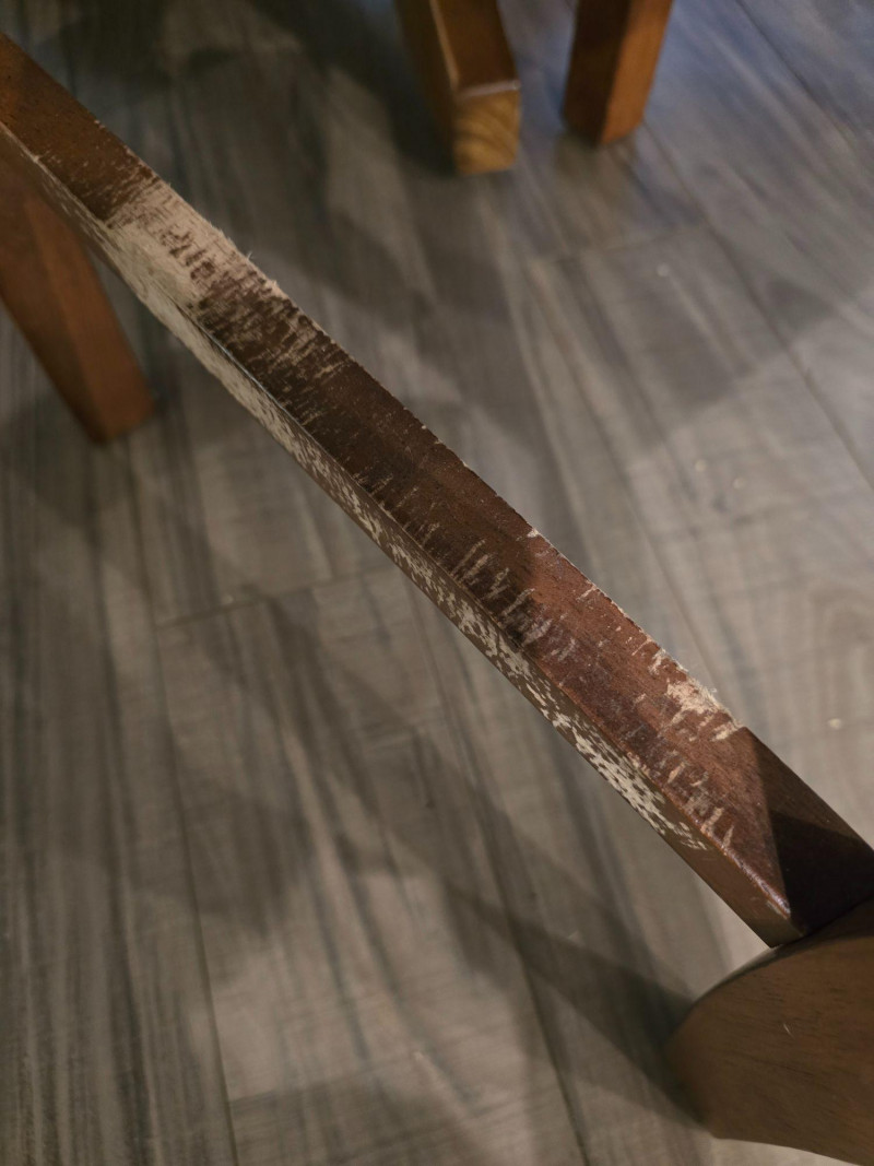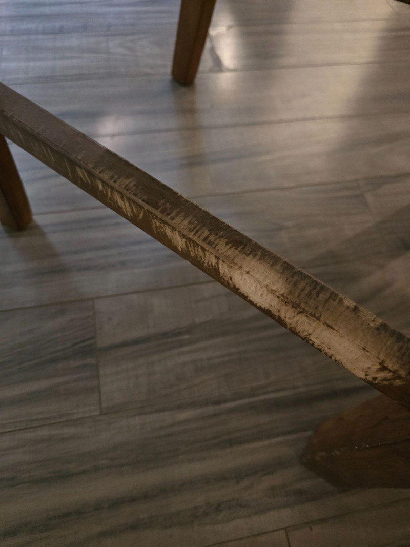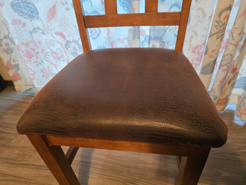 Visible wear on the tabletop surface and legs, as photographed. Wear is cosmetic only; no structural issues observed. Chairs show light use consistent with household wear. Approx. Measurements: Table (without leaf): 48" L × 30" H Leaf Extension: Adds 17 3/4" to length Table (with leaf): Approx. 65 3/4" L Chairs: Standard dining height Notes: