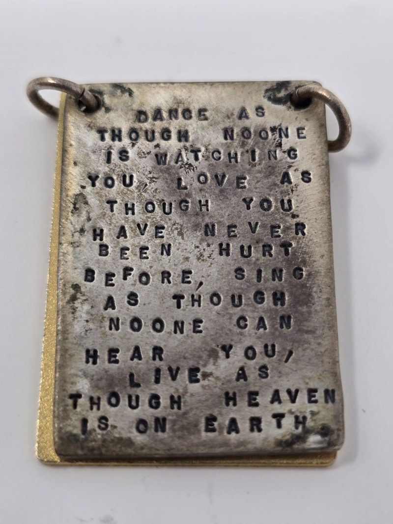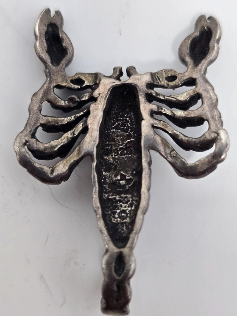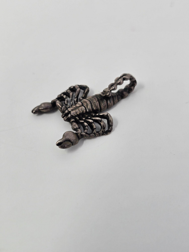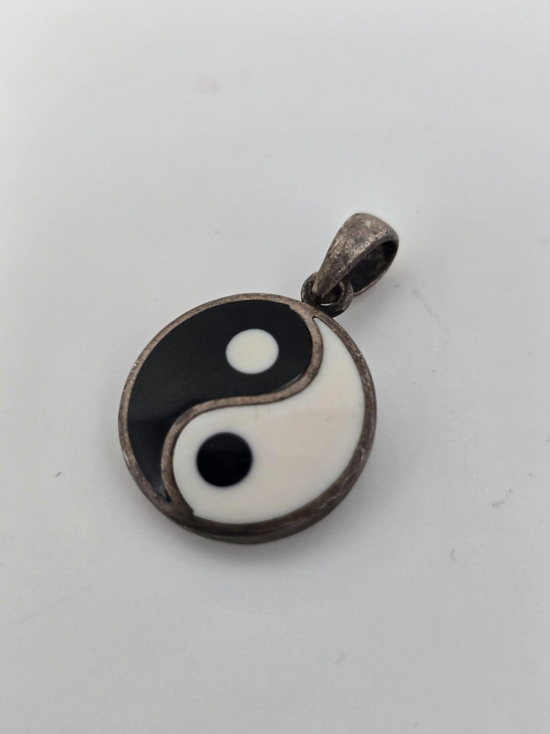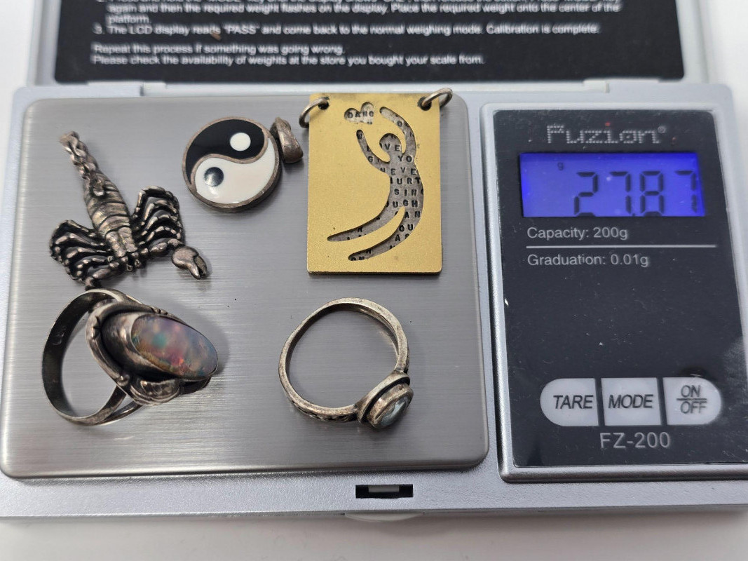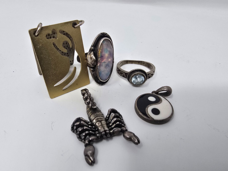 Miscellaneous lot of sterling silver stamped jewelry including three pendants and two rings, with a combined weight of 27.87 grams. The pendants include a scorpion motif, a yin‑yang symbol, and an inspirational words pendant by artist Kathy Bransfield. The two rings feature unknown, untested stones and are estimated to fall between sizes 7–9. All pieces show light wear consistent with normal use. A versatile grouping suitable for collectors, resale, or silver weight buyers.