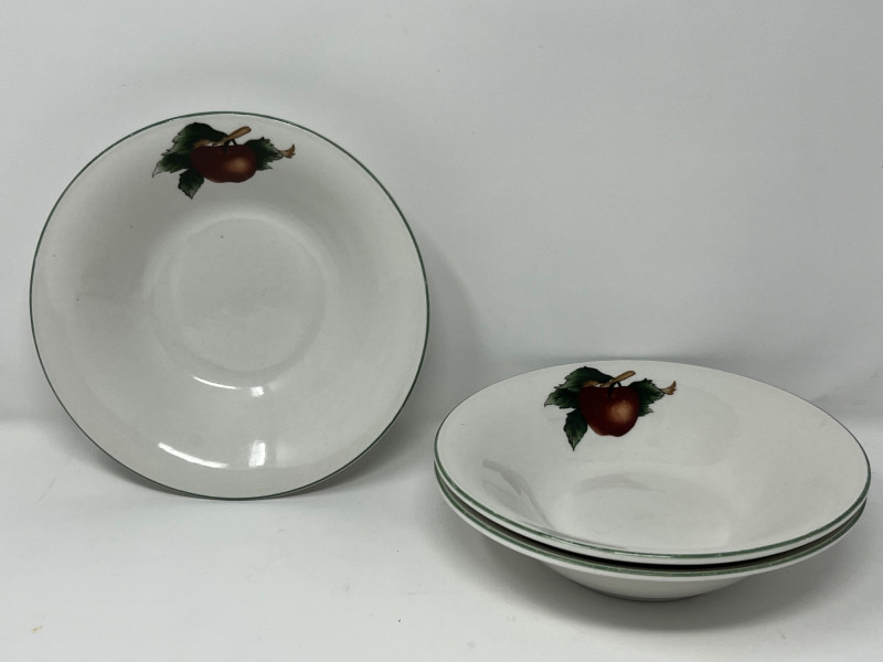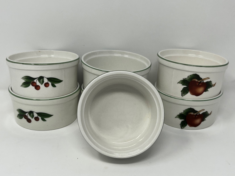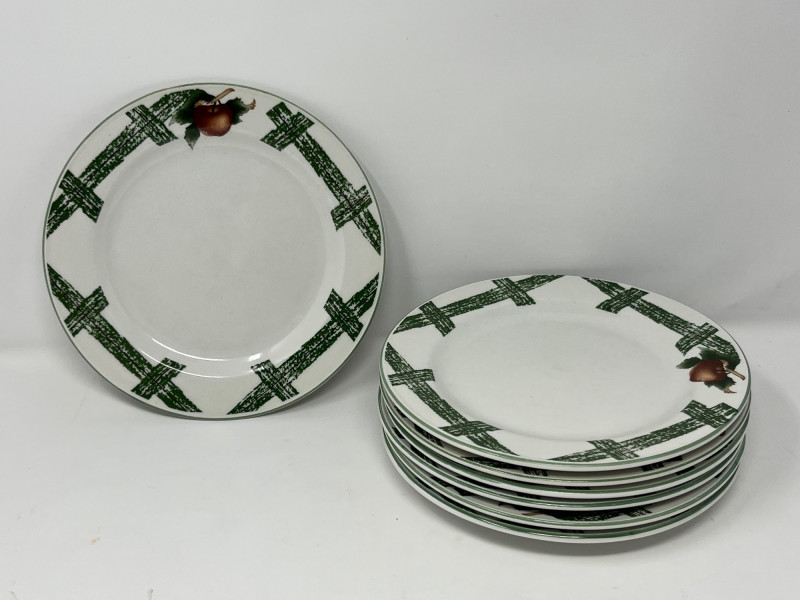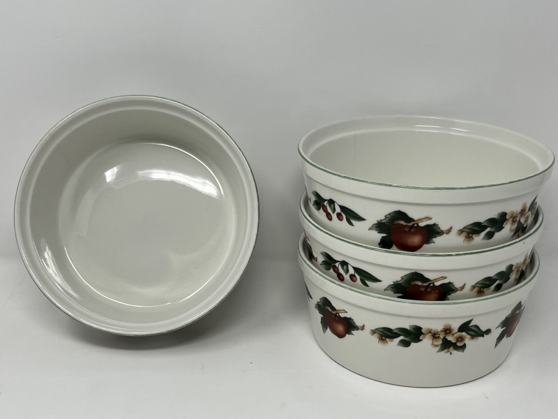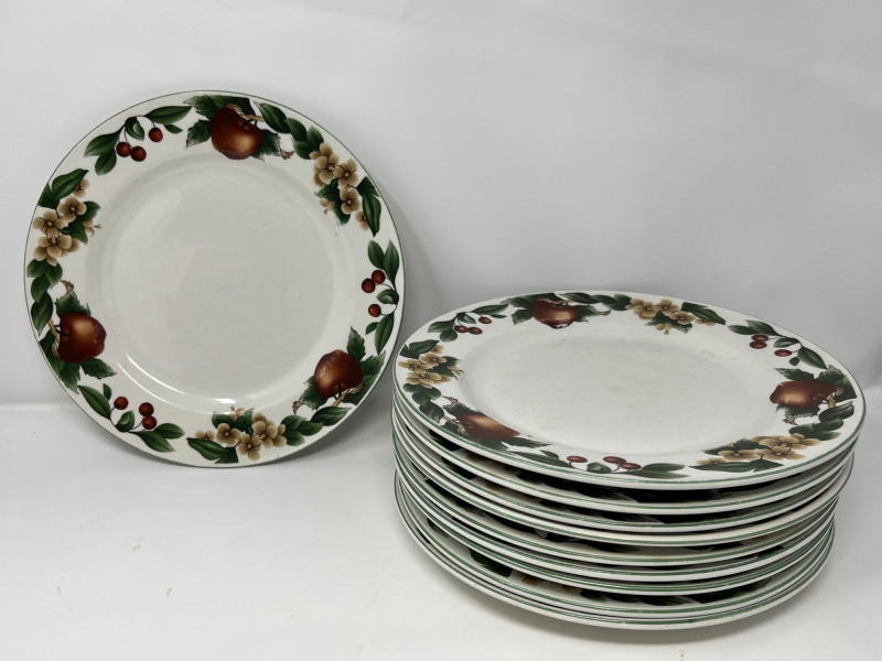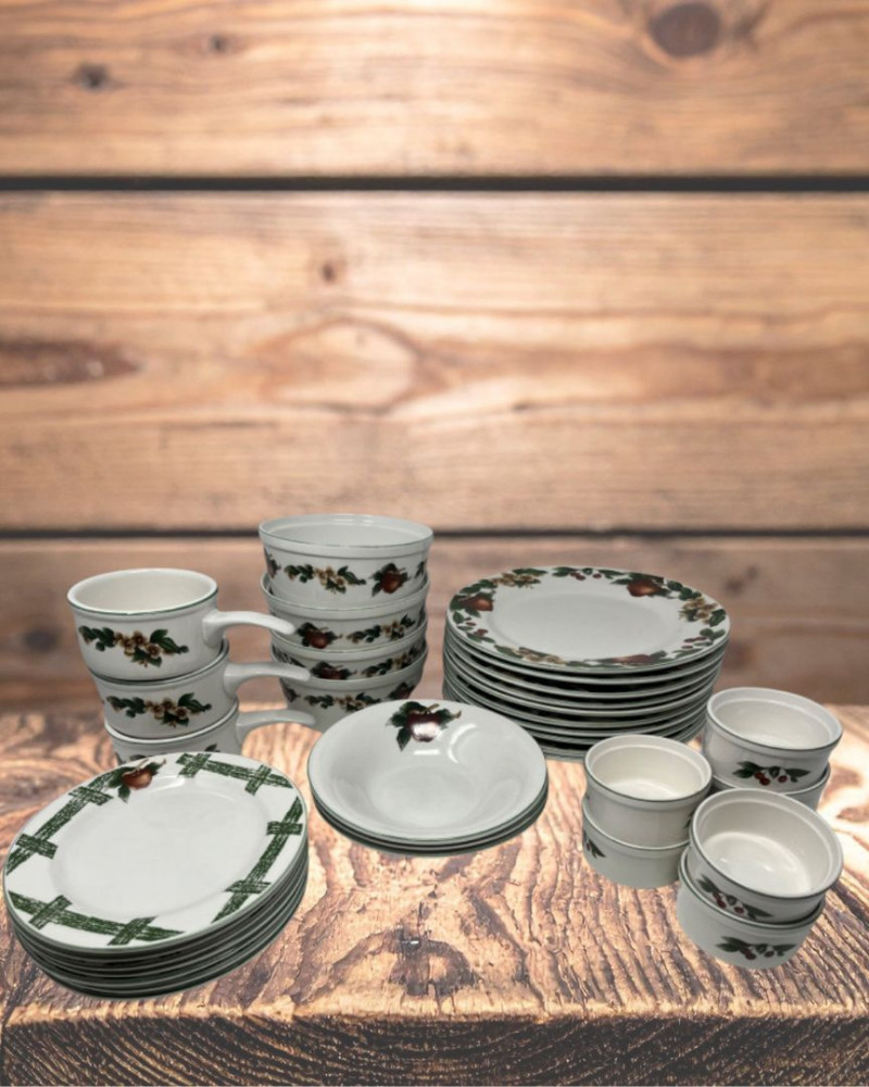 Collection of Cades Cove dinnerware featuring the classic apple motif. This set shows use consistent with age; some of the apple print is rubbed or worn. All pieces remain structurally sound and ready for continued use. Includes: (10) Dinner Plates (7) Salad Plates (3) Handled Soup Bowls (3) Additional Bowls (7) Mini Ramekins (4) Soufflé Bowls A substantial mixed lot ideal for everyday use, replacements, or expanding an existing Cades Cove set. Condition varies; please review photos for details.