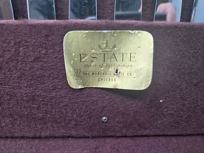 Chateau Rose Sterling silver flatware set displayed in a vintage Art Deco Bakelite chest with a deep burgundy velvet lining, likely by the Marshall White Co. of Chicago.Overall Description