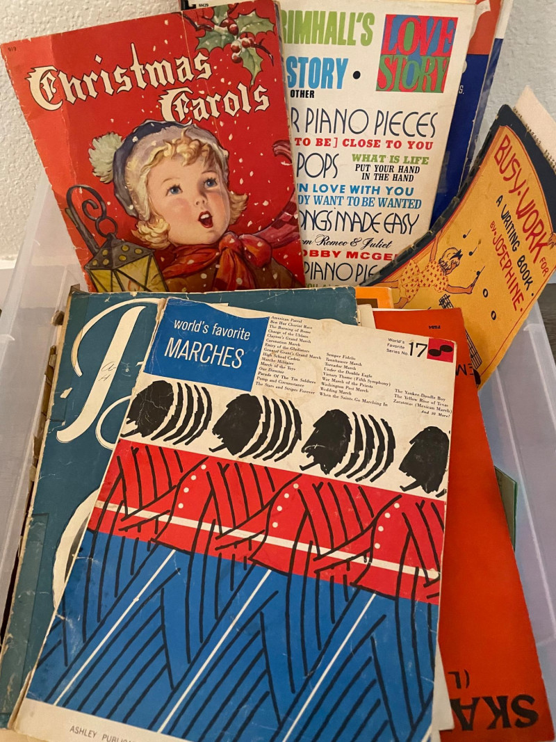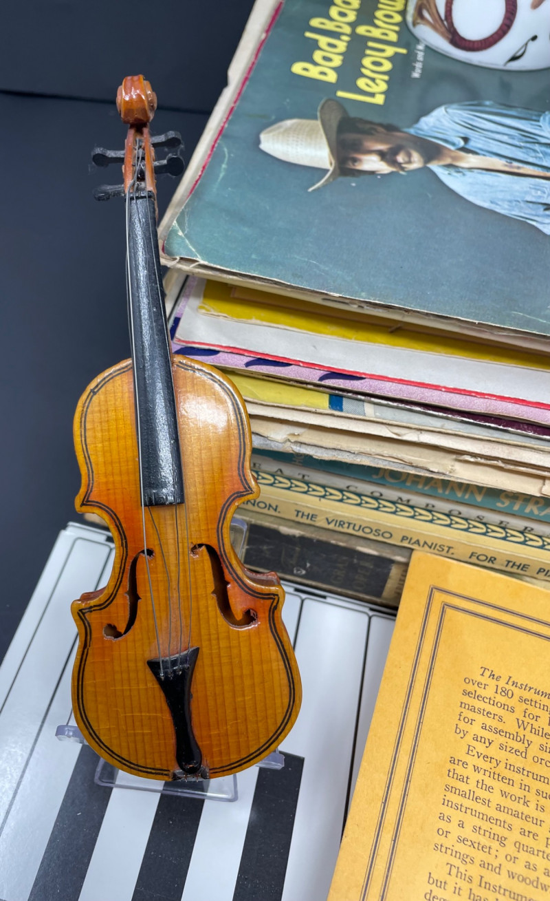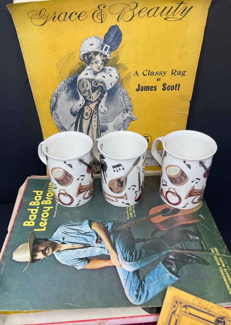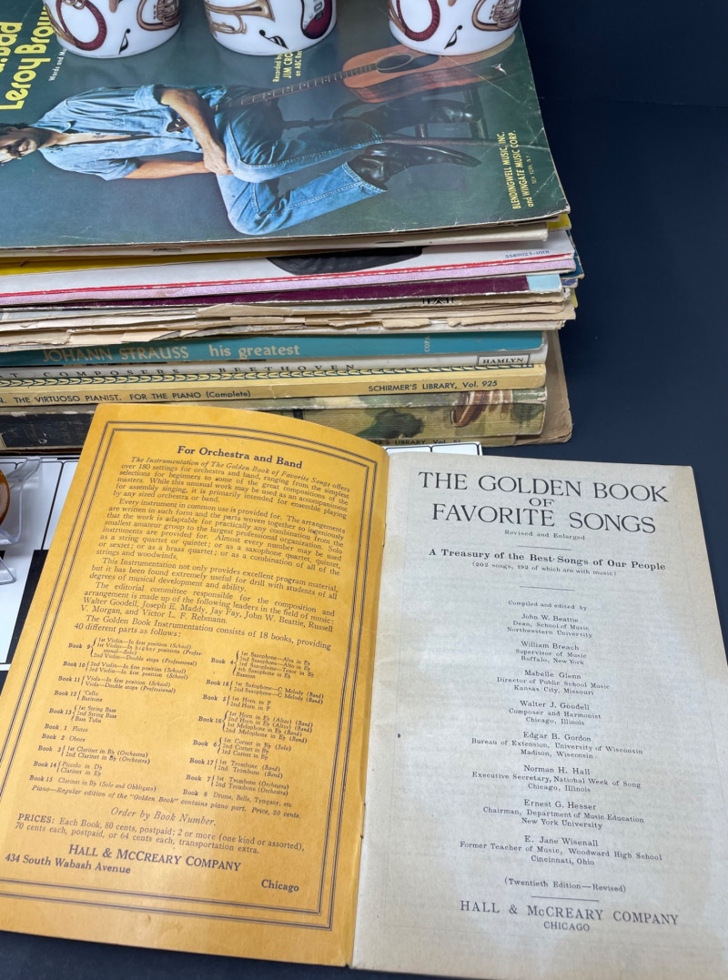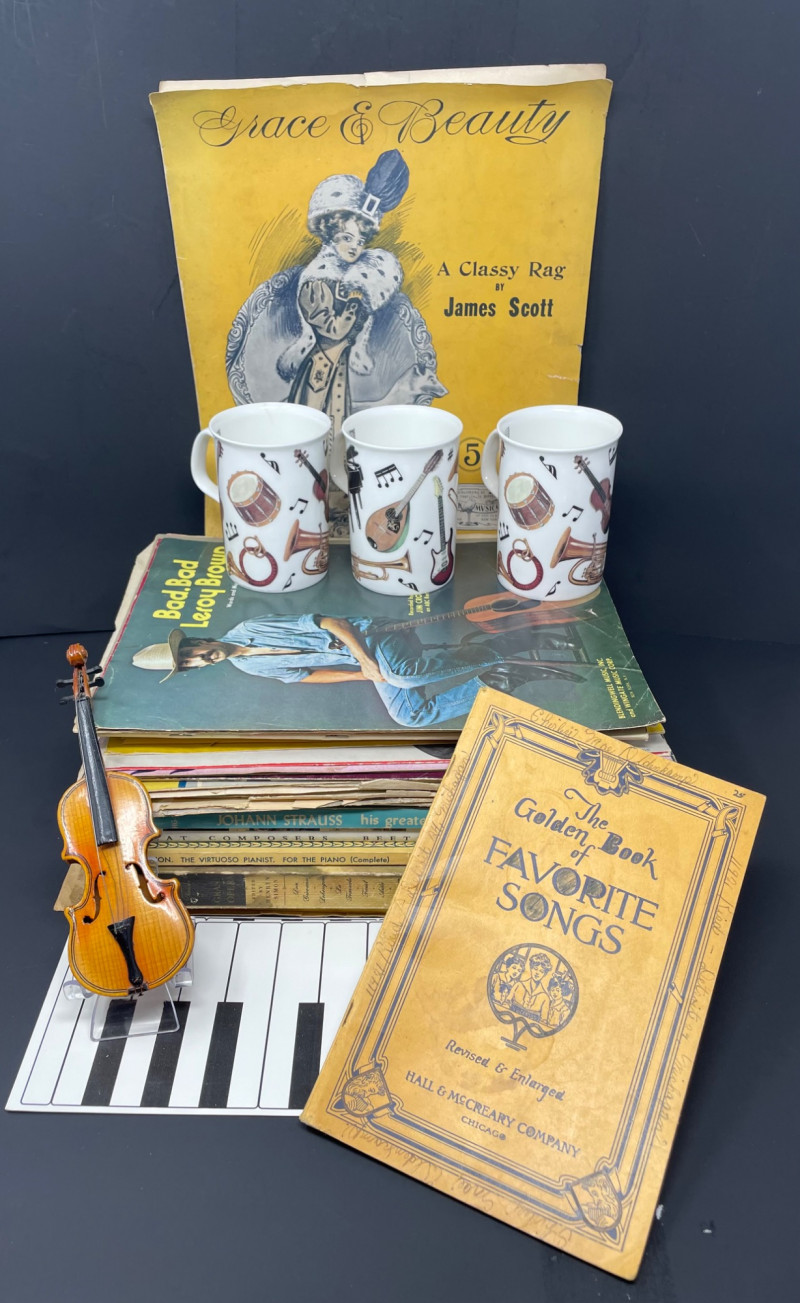 Category: Collectibles / Musical Memorabilia / Decorative & Functional Sheet Music & Books: Grace & Beauty: A Classy Rag by James Scott — bold yellow cover with period illustration Bad Bad Leroy Brown — cowboy-themed cover art The Golden Book of Favorite Songs — Revised & Enlarged edition by Hall & McCreary, Chicago Johann Strauss: His Greatest Hits and The Virtuoso Pianist — classic piano repertoire Decorative Mugs (3): White ceramic with musical instruments and note motifs — ideal for display or use in a music studio Miniature Violin: Resting on a keyboard-patterned surface — charming accent piece for music lovers This lot celebrates musical heritage through: Ragtime, classical, and pop sheet music Functional decor for musicians and educators Whimsical and nostalgic presentation 2 Tubs full of music books, sheet music, 3 coffee mugs and small Base Knick Kack 7 1/2 x 2 1/2"For The Love of Music