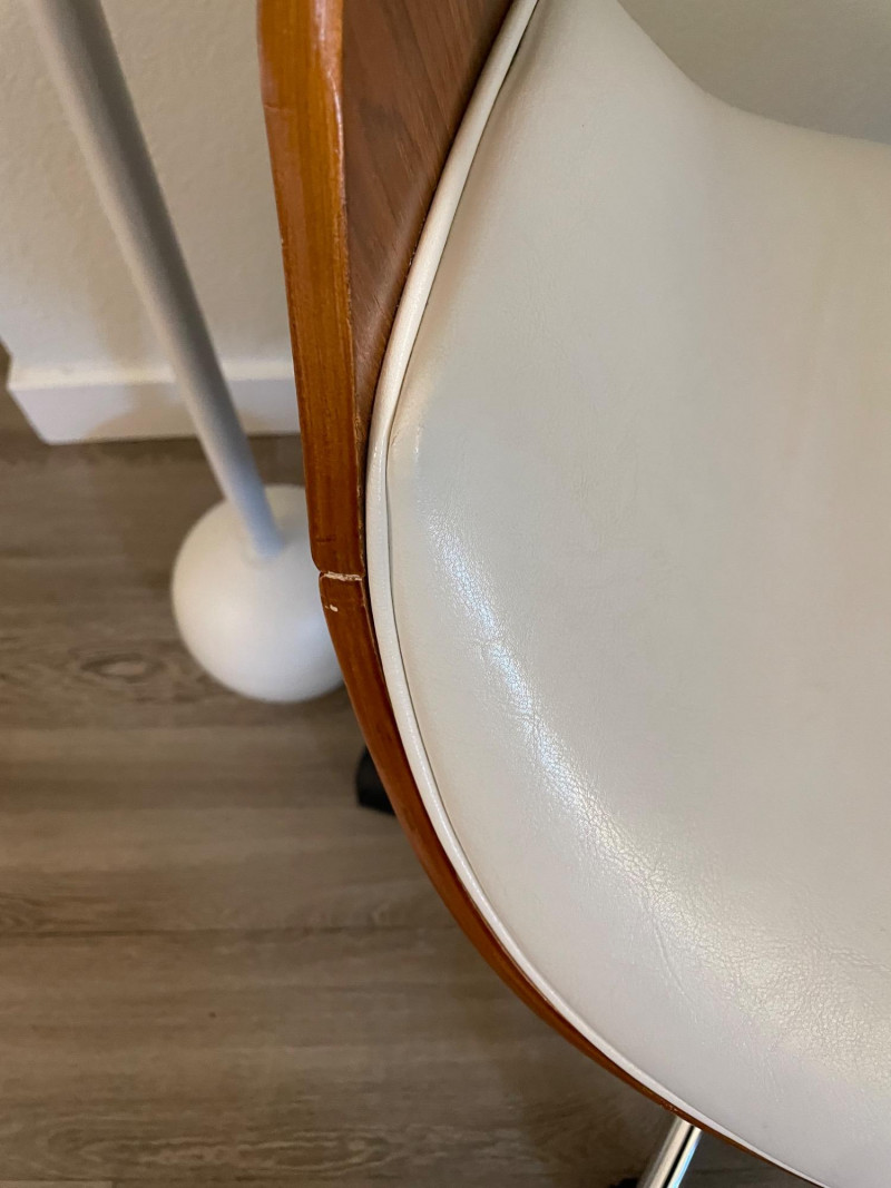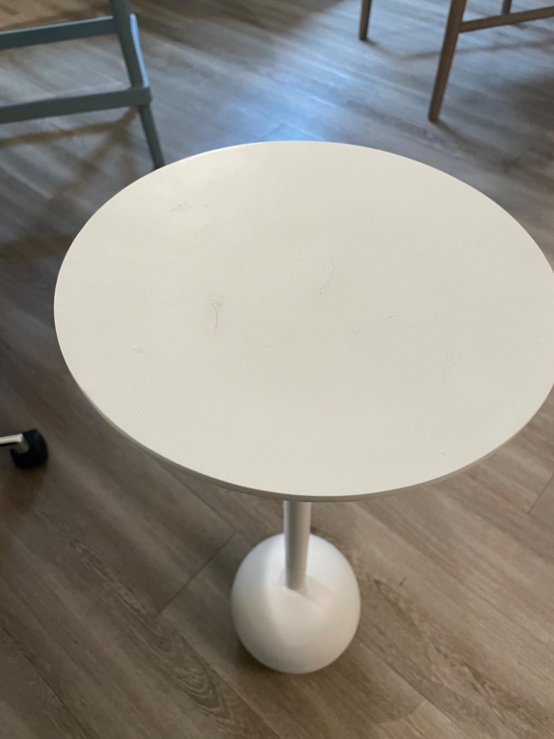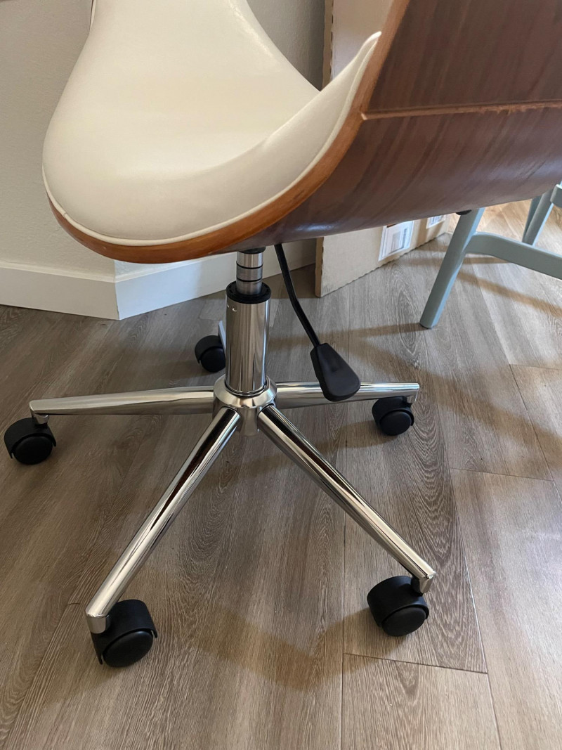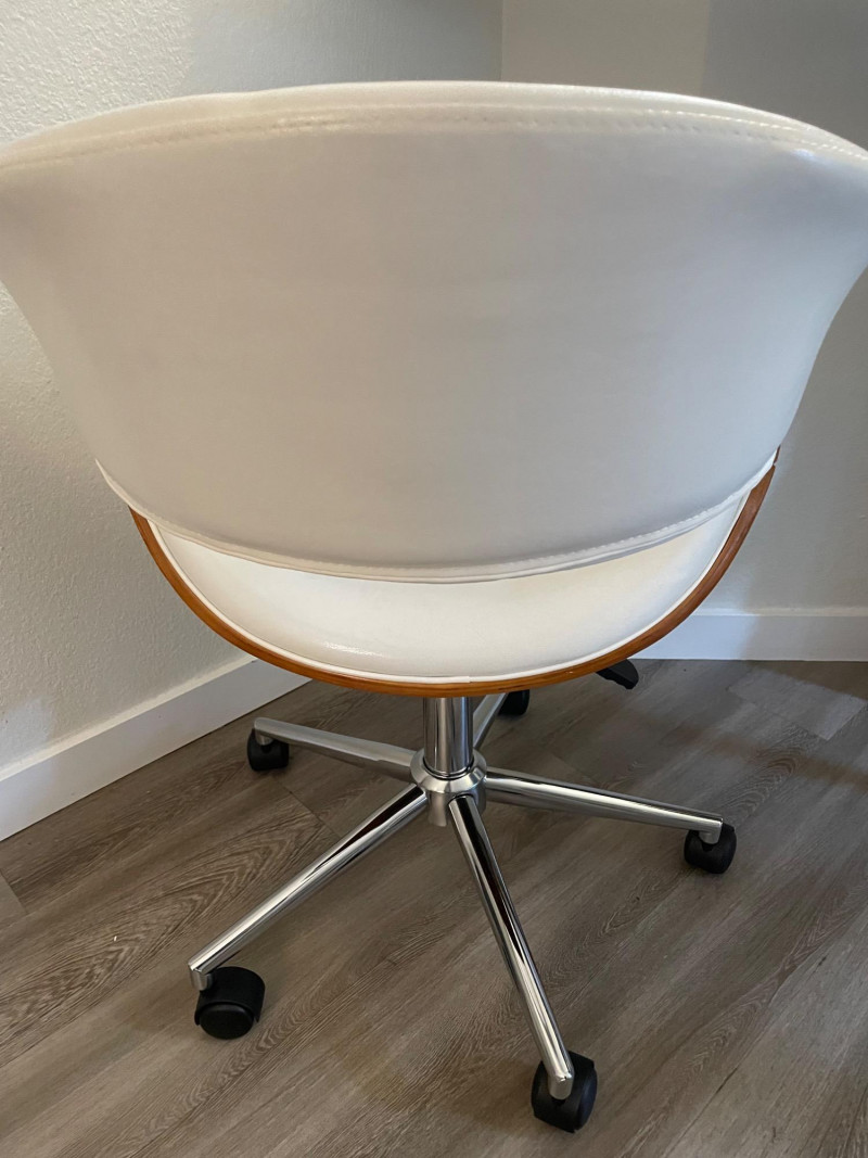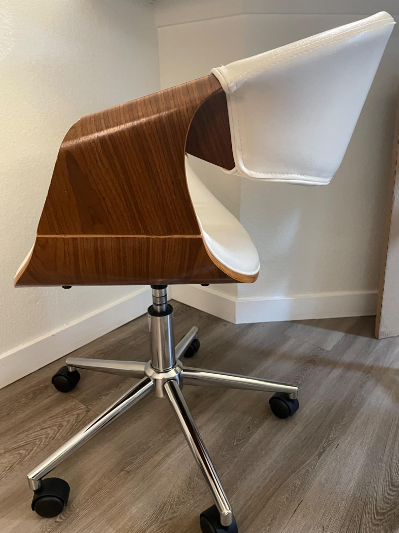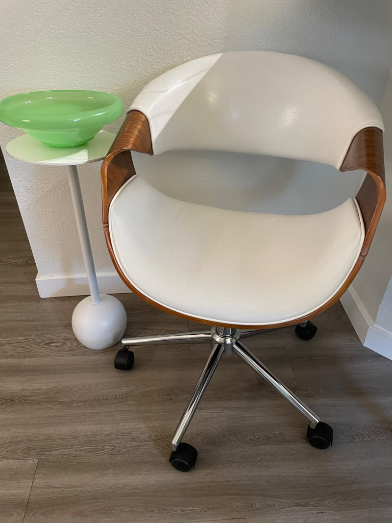 Included Items: 1 White & Wood-Accented Office Chair 1 Sculptural White Pedestal Side Table 1 Translucent Green Glass Bowl Chair: Curved white seat with warm wood veneer backrest Chrome legs with caster wheels for smooth mobility Sleek silhouette blends ergonomic comfort with retro flair Ideal for workspace, vanity, or reading corner Side Table: Minimalist pedestal design with spherical base Glossy white finish complements modern and mid-century interiors Perfect for accent placement or small-space styling Green Bowl: Translucent glass with soft contours Adds a pop of color and organic texture Suitable for display, serving, or catch-all use Mid Century Modern Chair 33 1/2 H and Seat 21 x 15 1/2 " Small Round White Table/Stand 24" H and 10" Round Green Decorative Bowl 10" Round and 5" HMid-Century Modern Seating & Accent Trio