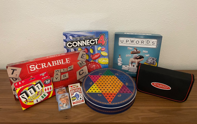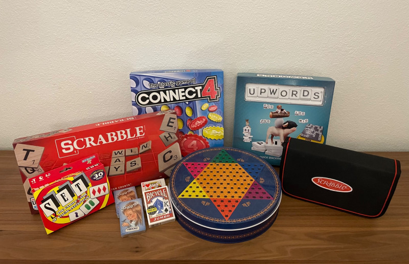 Condition: Mix of new and gently used; all appear complete and playable Scrabble: Classic word-building game in red box Connect 4: Strategy disc-drop game in blue box Upwords: 3D word stacking challenge Set: Fast-paced visual perception card game Chinese Checkers: Decorative round tin with star-pattern board Bicycle Playing Cards (2 decks): One Jumbo, one with horse motif Travel Scrabble Case: Black and red zippered pouch—compact and portable Round Metal Checkers and Chinese Checkers Game Like New Scrabble Game Like New Travel Scrabble Game Never Used UP Word Game Connect 4 Game Never Used Set Match Game Four sets of New or Like New Decks of CardsGame Night – Classic & Casual Fun
