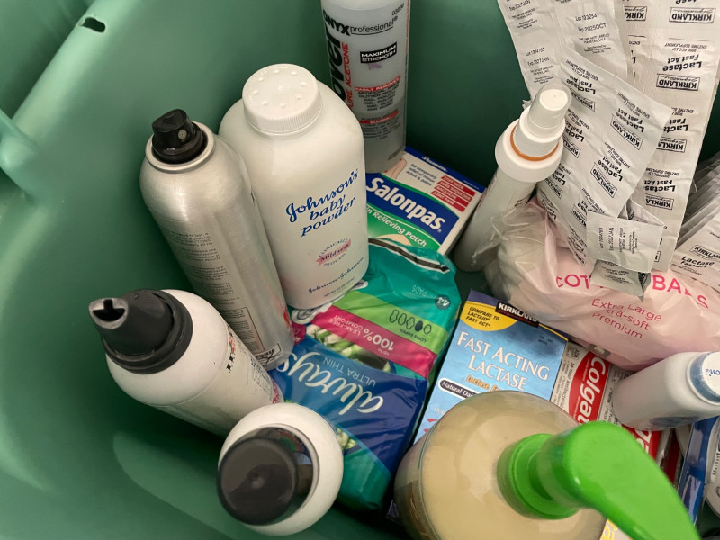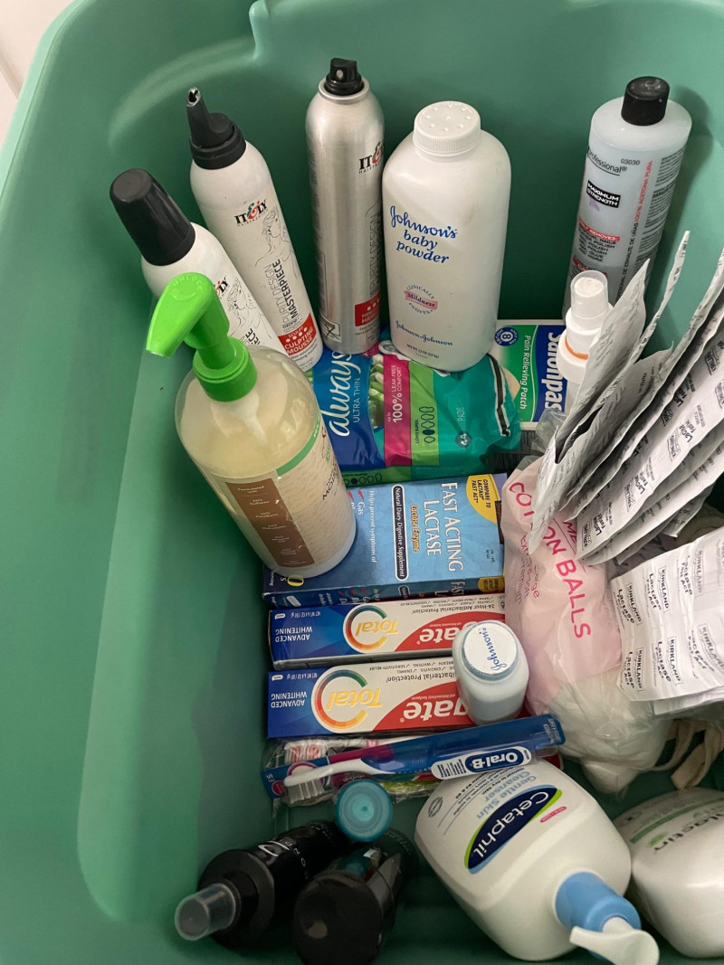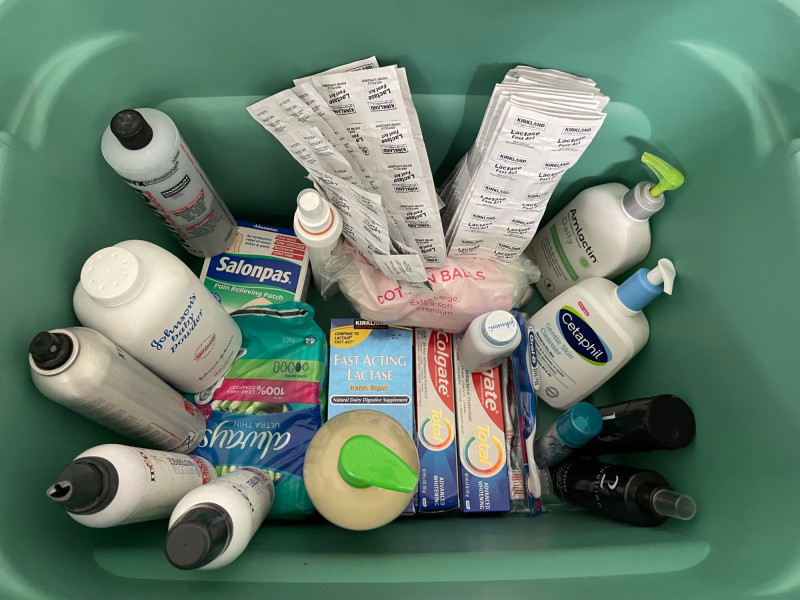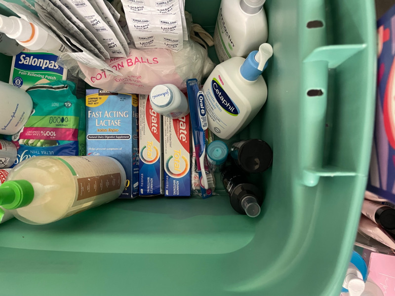 Container: Large green plastic bin labeled “PERSONAL CARE”