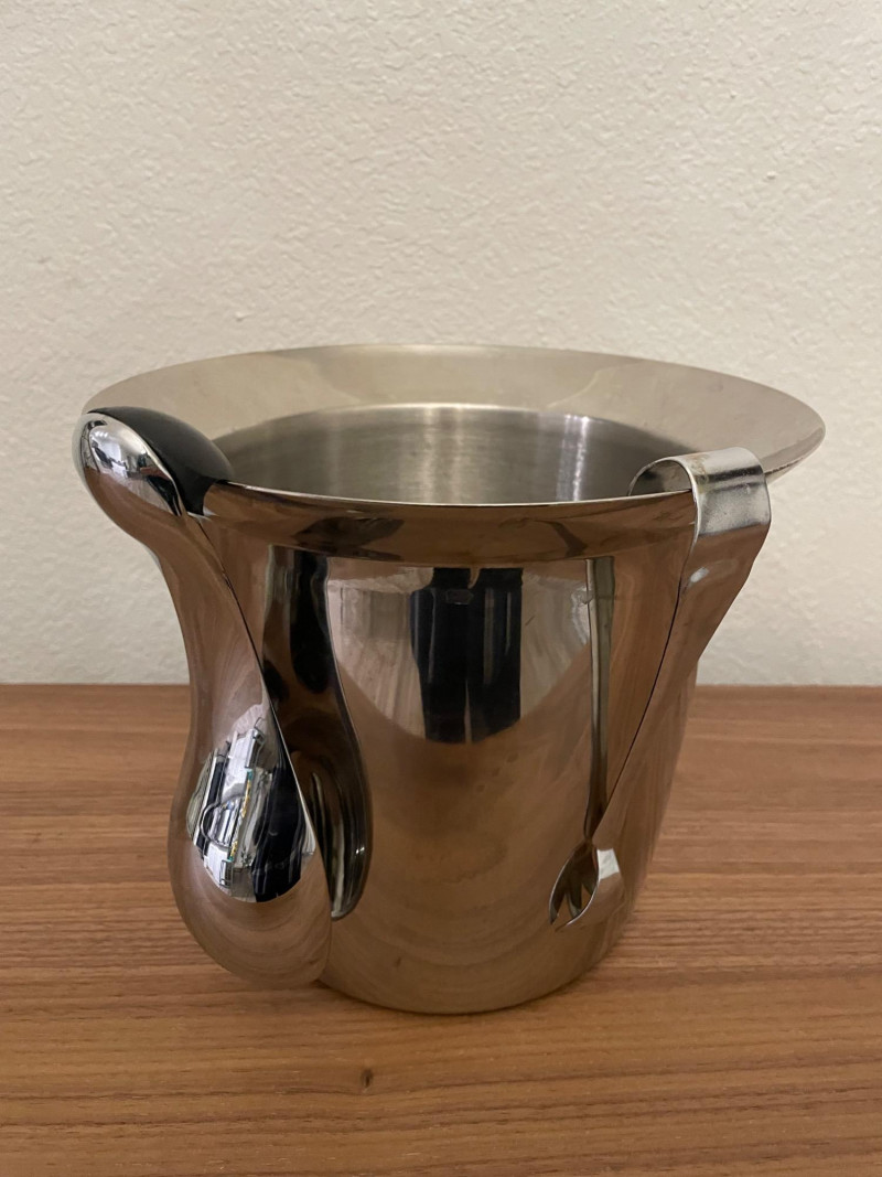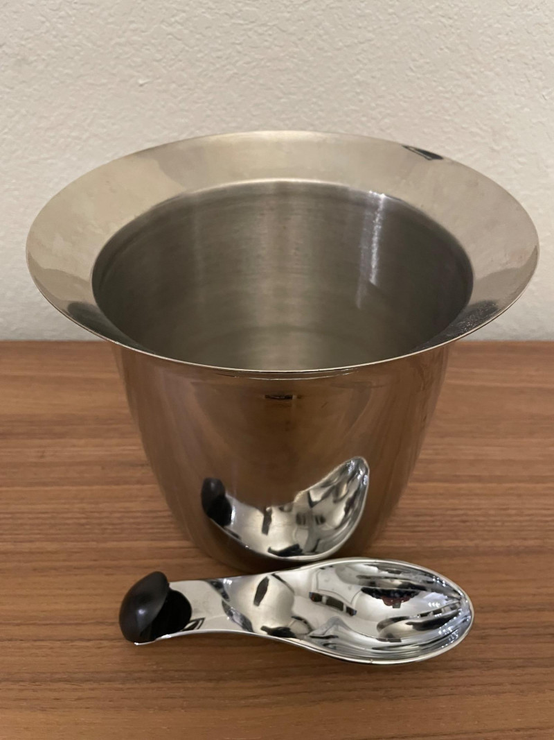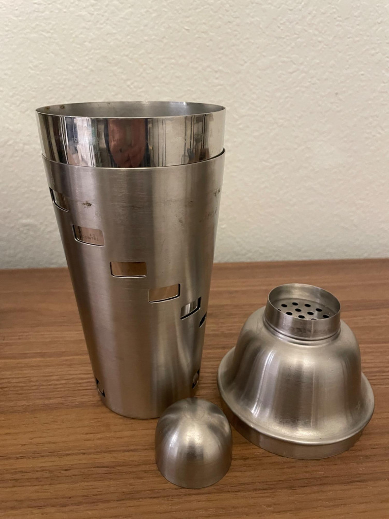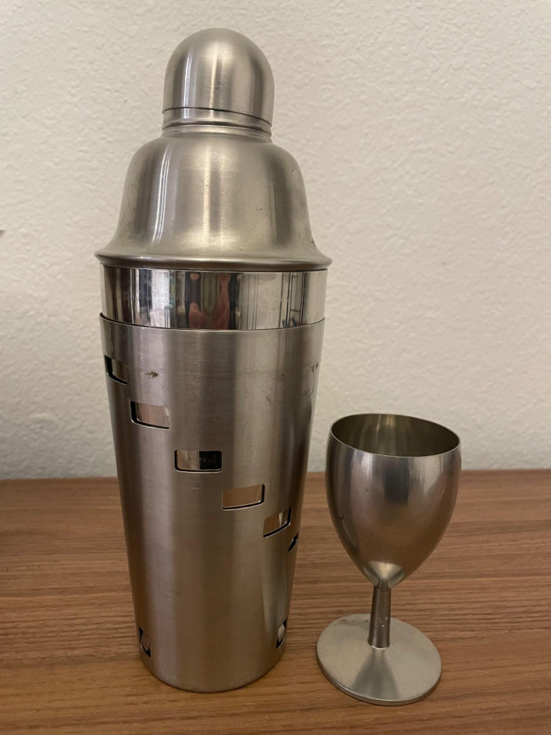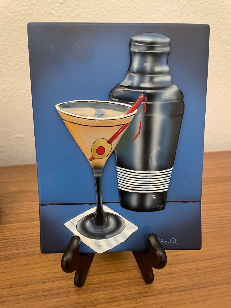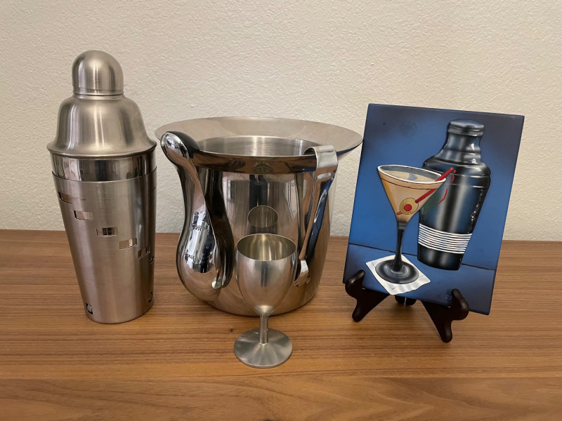 Condition: Excellent; clean, display-ready Stainless Steel Cocktail Shaker: Sleek, polished finish Functional centerpiece for mixology setups Polished Metal Ice Bucket with Tongs: Integrated handle Includes matching metal goblet for serving or display Retro Martini Artwork: Stylized painting of a martini glass with olive and cocktail pick Includes cocktail shaker and napkin motif Blue background with easel stand—perfect for bar cart or shelf accent A collection of stainless steel barware items and art deco style martini decorative art. The barware set includes a large cocktail shaker, ice bucket with an integrated handle, and small metal stemmed cup. Art size is *" x 6" Display stand not included Lot Title: Martini Time – Barware & Retro Cocktail Art