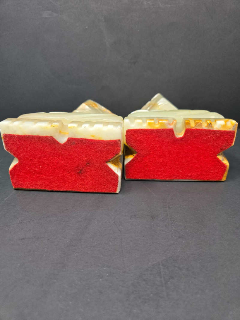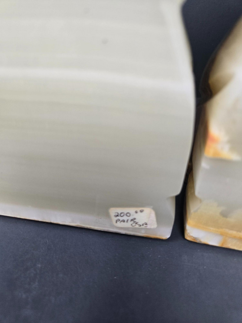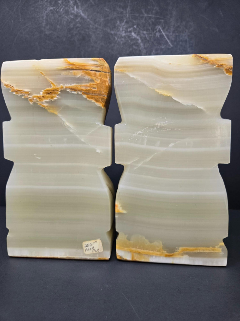 Pair of marble bookends with a distinctive carved design. Material: Design: Condition: