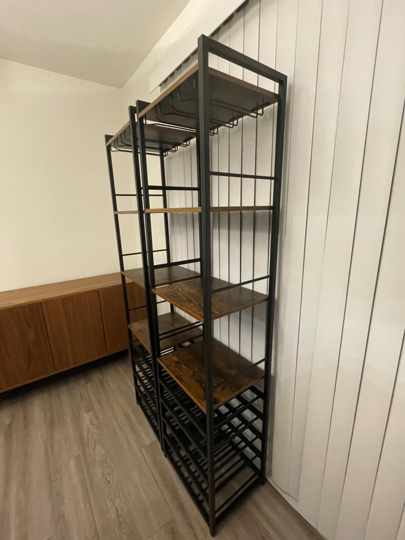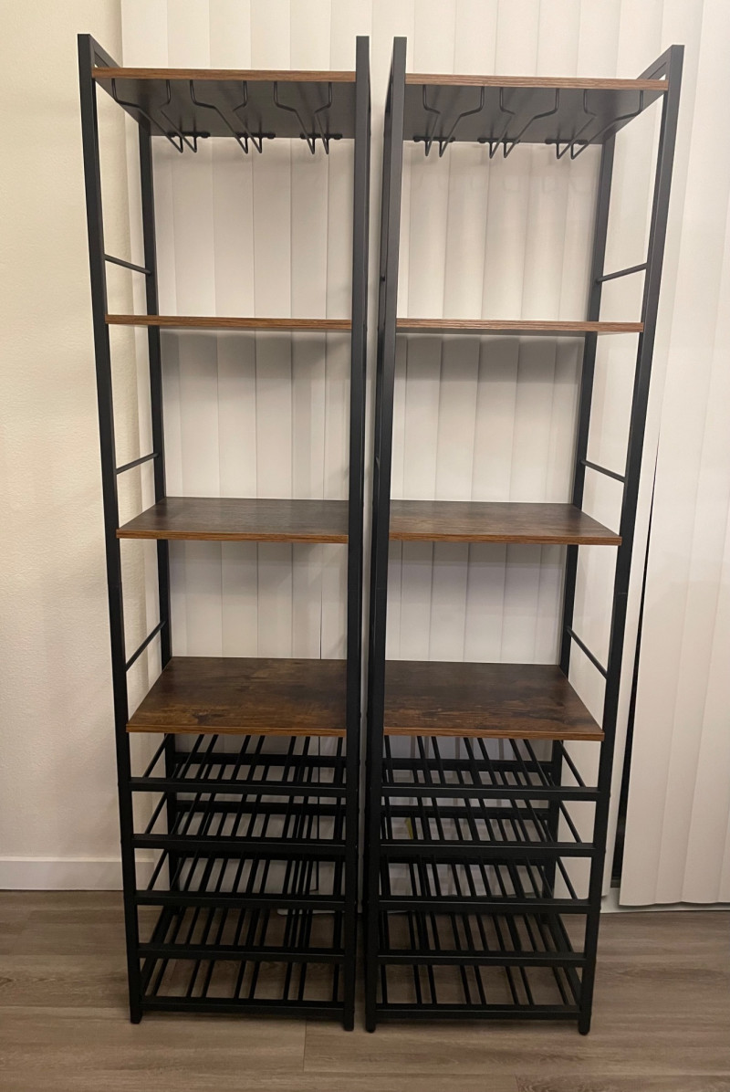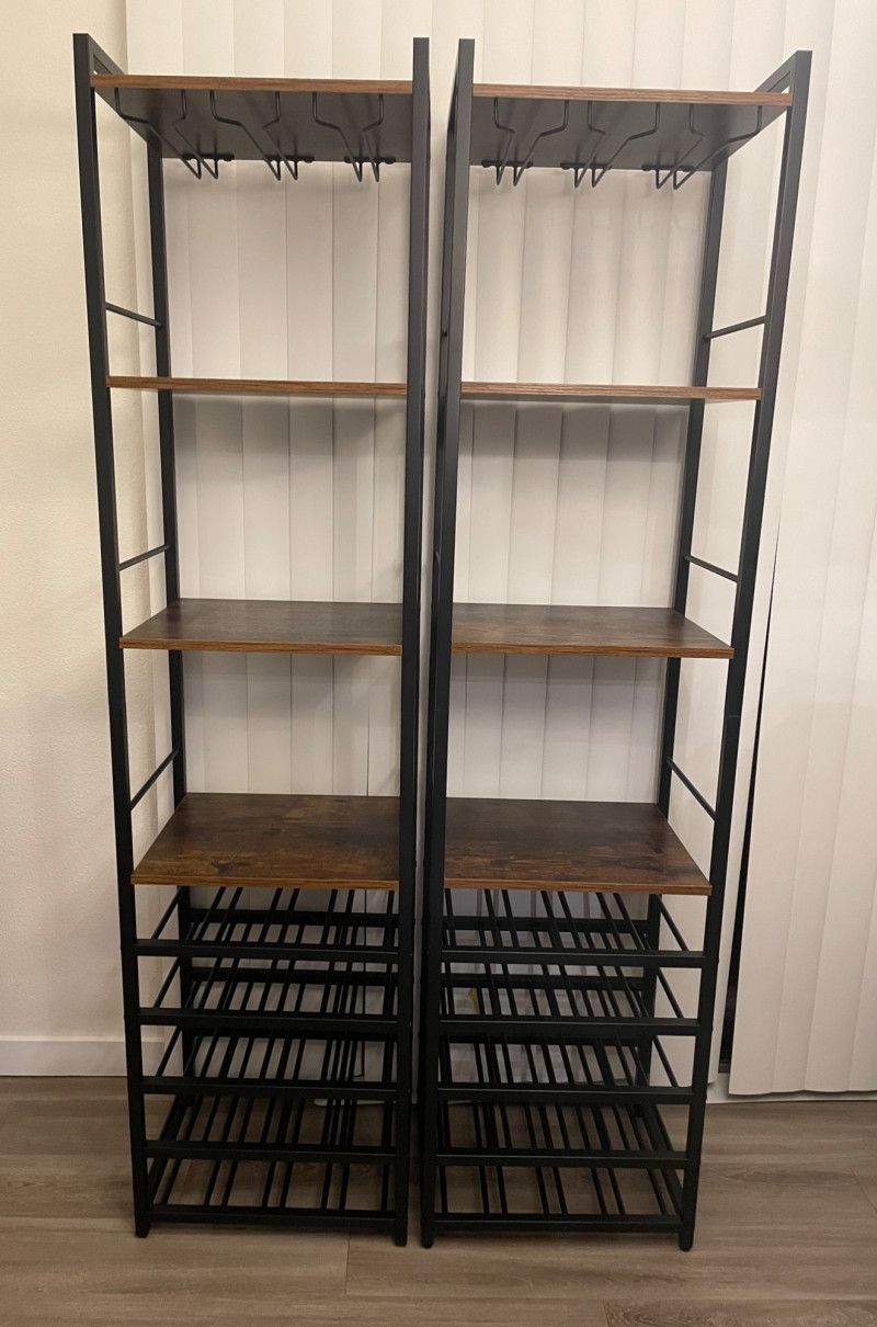 Style: Sleek vertical design with modern-industrial flair Material: Sturdy metal frame with wood shelving Storage: Lower slatted racks designed for wine bottles Upper hanging racks suitable for stemware Multiple tiers for versatile display and storage Design: Clean lines and open structure for visual appeal Ideal for dining rooms, kitchens, or entertainment spaces Can be used side-by-side or separately for flexible layout Measurements: 71" H x 18" x 14" D Lot Title: Pair of New Black Wine Racks