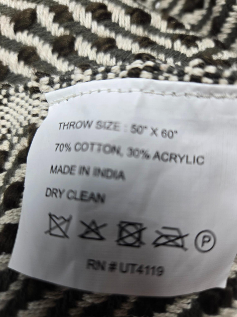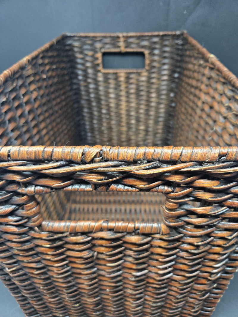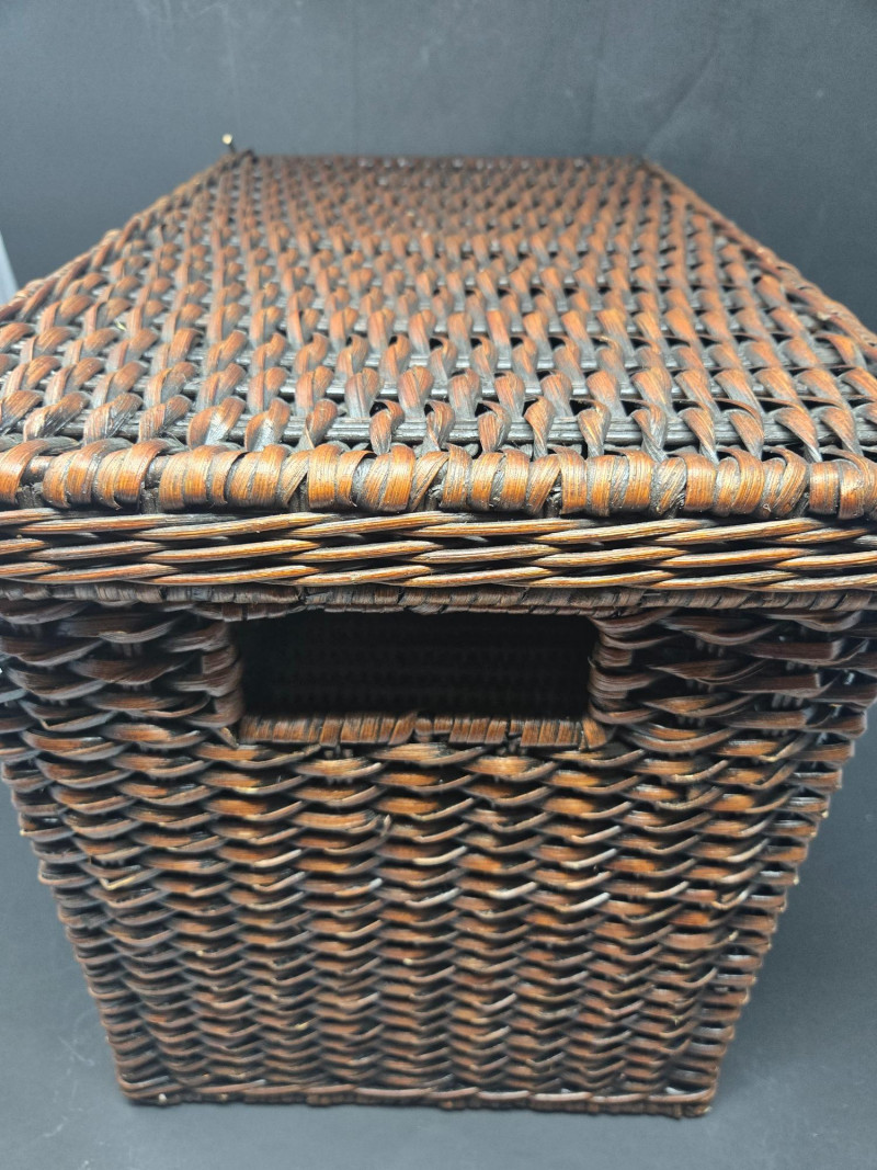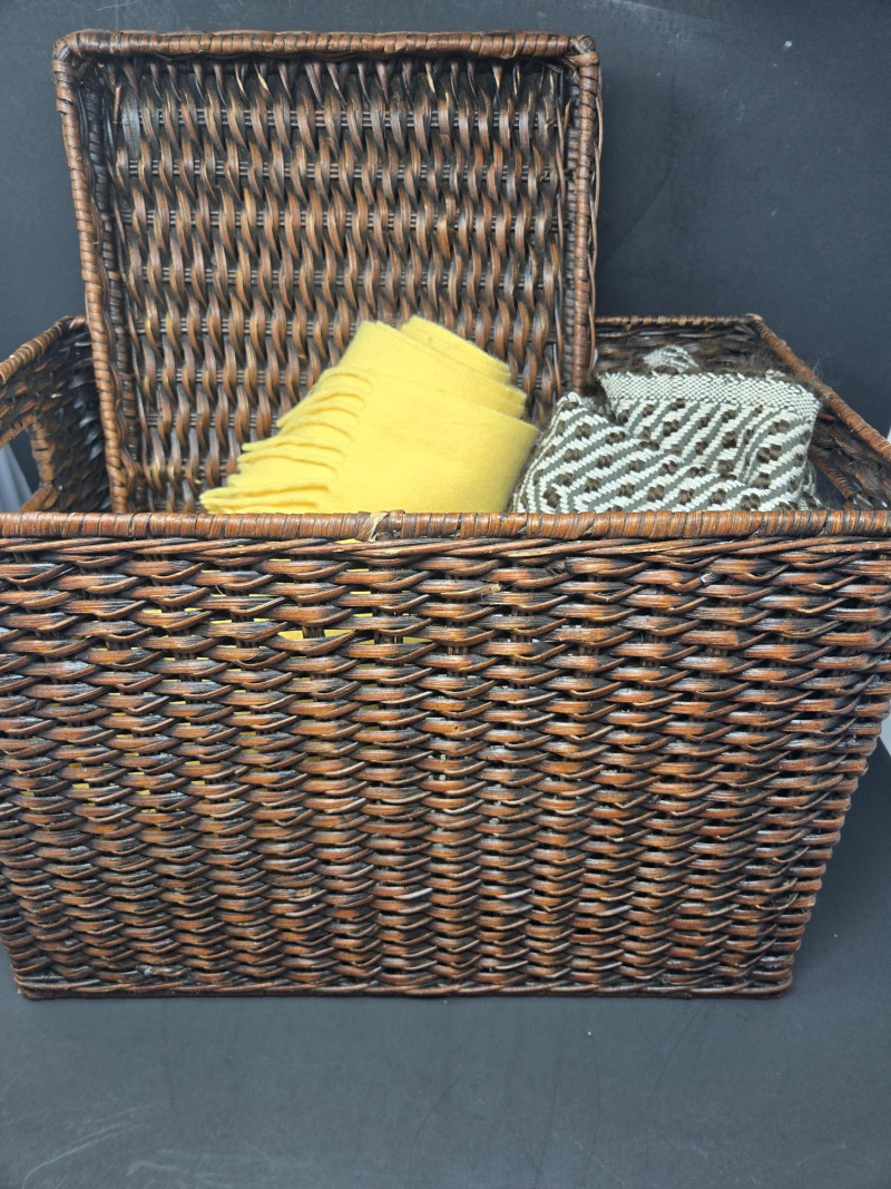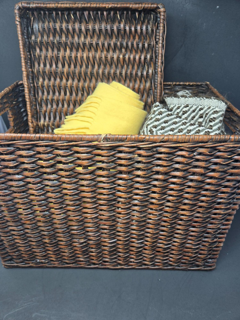 Woven storage basket filled with cozy throw blankets. Here’s a detailed description: Basket: Contents: Condition: