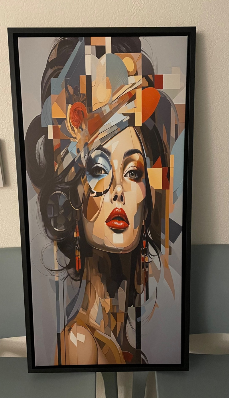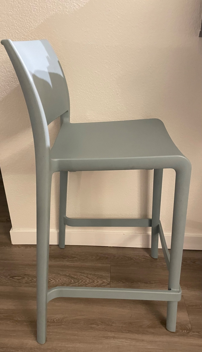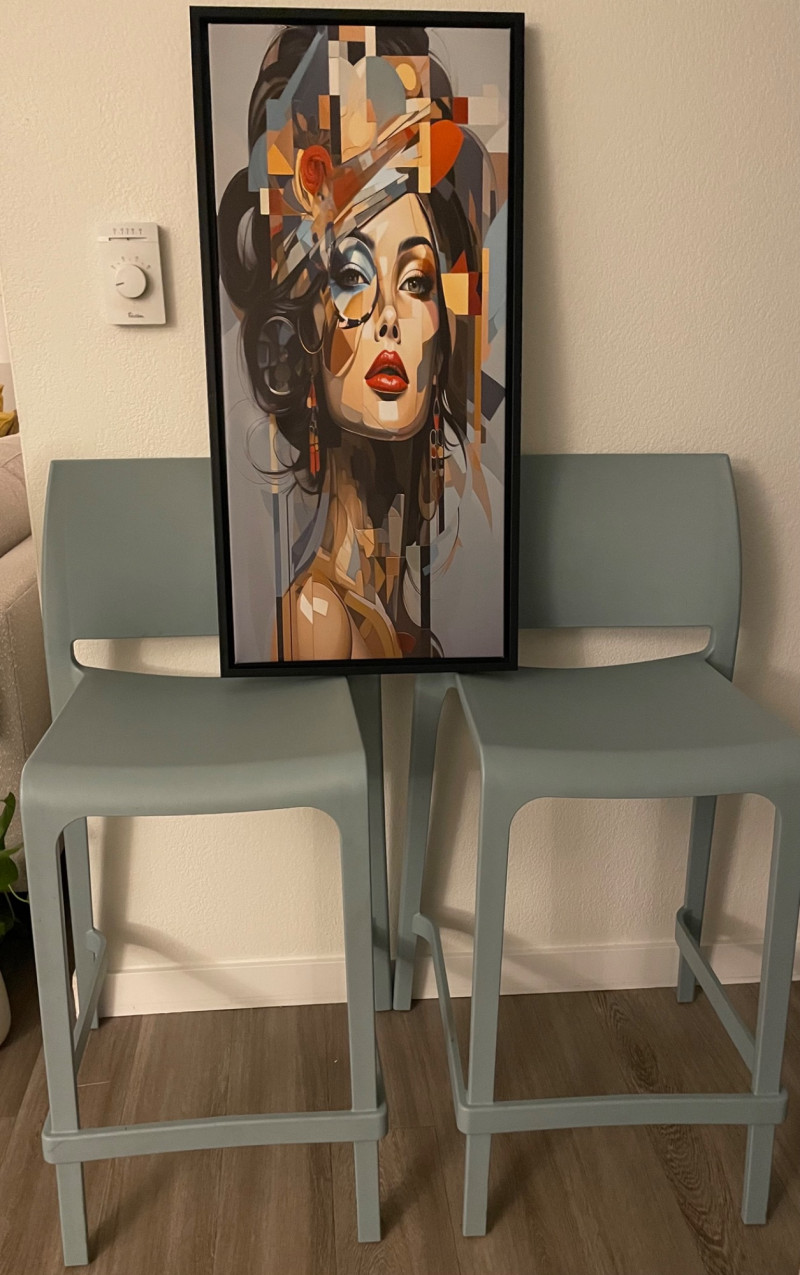 Condition: Excellent; clean, display-ready Bar Stools (2): Lagoon Sensilla Stackable Counter Stools (Model 7211C) Baby blue all-weather resin—suitable for indoor/outdoor use Dimensions: 37" H × 15" W × 15" D Lightweight, stackable design with modern silhouette Artwork: Titled Glam Harmonious Cubist Woman Portrait Abstract cubist-style fashion print featuring a woman with red lips, voluminous hair, and geometric accents Vibrant palette: orange, blue, beige, and black Framed and ready to hang—adds a bold pop of personality to any space Two Lagoon Sensilla Stackable Counter Stools (model 7211C). All weather resin stool designed for both indoor and outdoor use, in Baby Blue. 37" H x 15 x15" Seat Art Work title "Glam Harmonious Cubist Woman Portrait. Its contemporary, abstract and cubist-style fashion print. 32" H x 16" x 2 1/2" Lot Title: Blue Bar Stools & Abstract Portrait Artwork