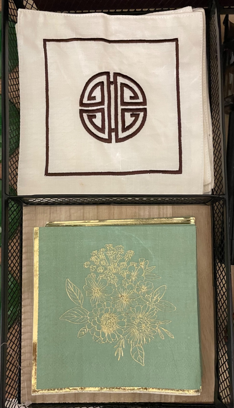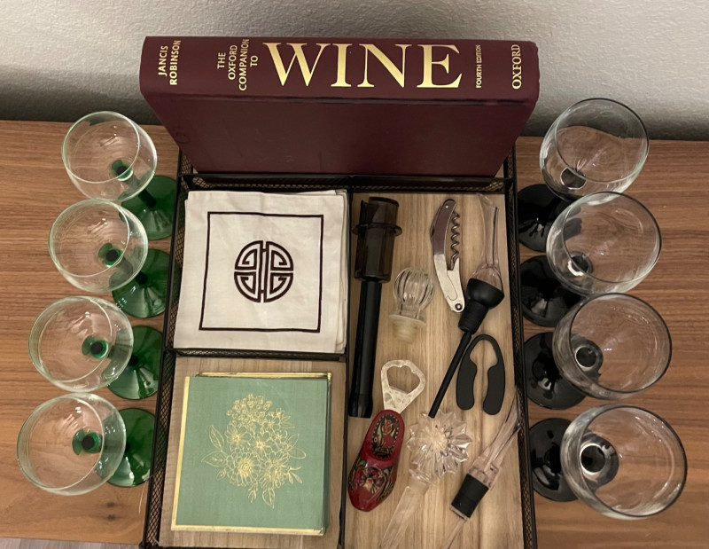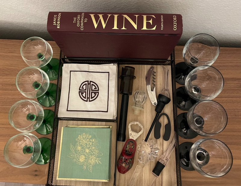 Opening Bid: $5.00 Reference Book: The Oxford Companion to Wine by Jancis Robinson, Fourth Edition Comprehensive guide for wine lovers, collectors, and sommeliers Glassware: 6 wine glasses with green stems 6 wine glasses with black stems Elegant and color-coordinated for tastings or themed events Linens: 1 white napkin with circular brown geometric design 1 green napkin with yellow floral embroidery Accessories: Corkscrew, foil cutter, wine stopper, aerator, bottle opener Decorative red wooden shoes Crystal-style wine stopper Wine Rack Measure 16" H x 11" x 6 1/2" Holds 12 BottlesWine Lovers – Oxford Wine Book & Accessories
