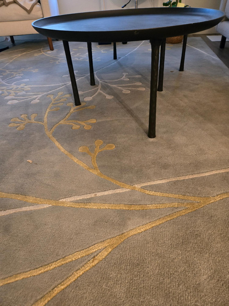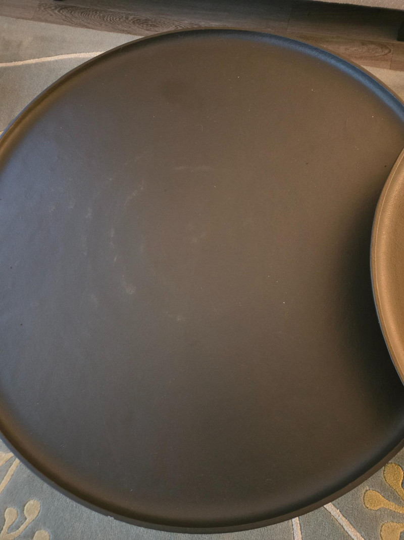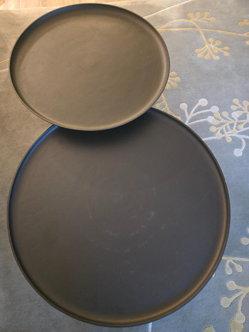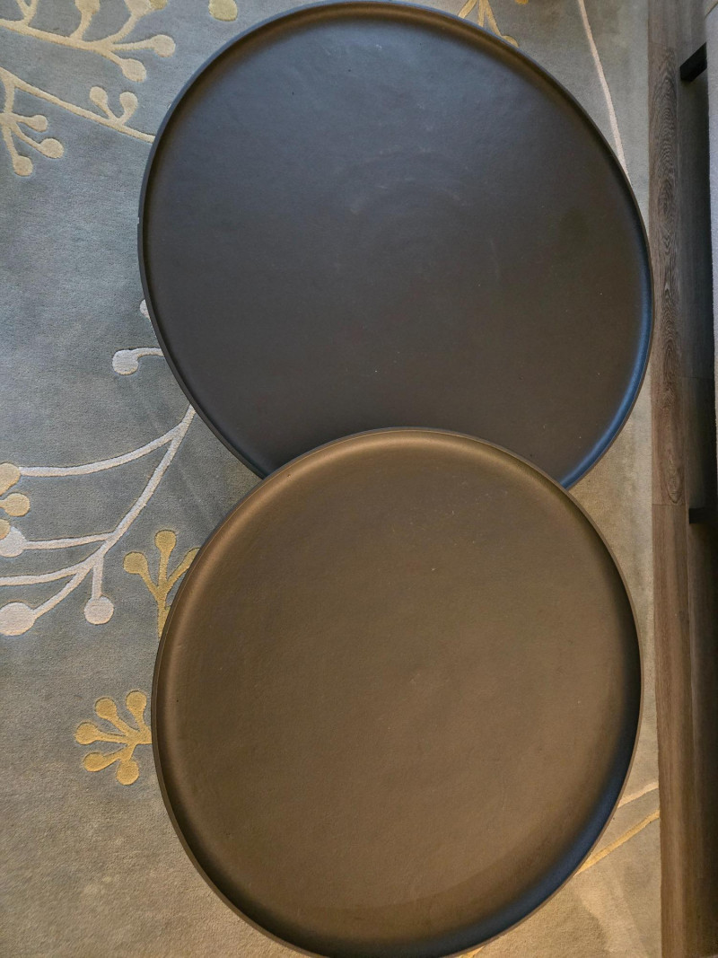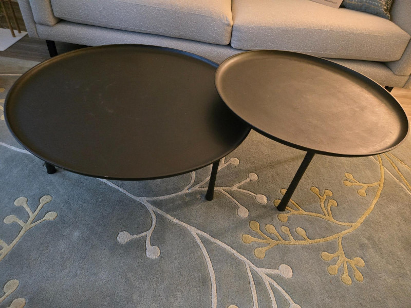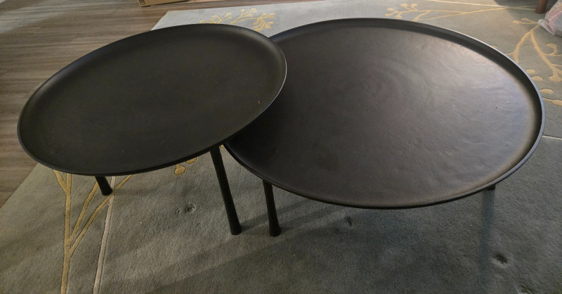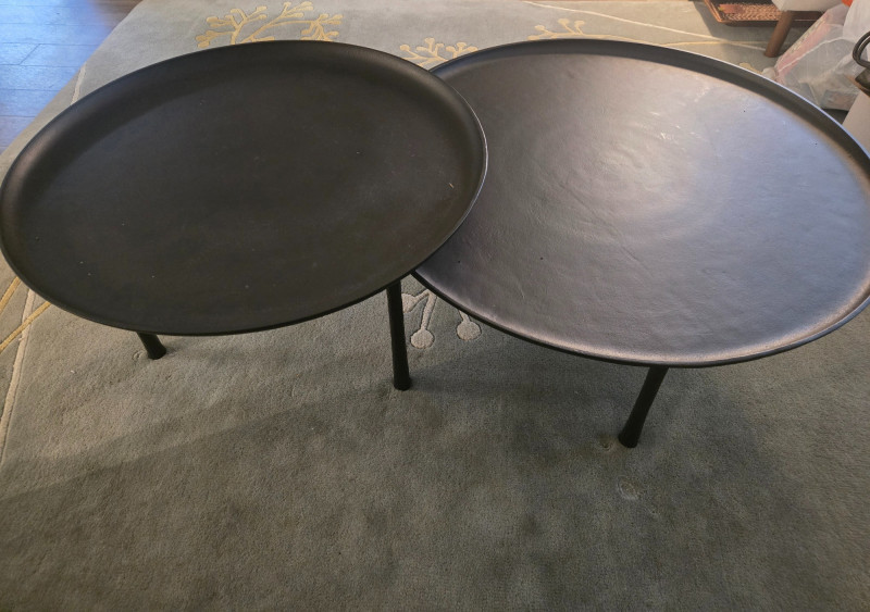 (look & feel of cast iron, 1 30" round & 1 36" round) Two round coffee tables from Williams Sonoma, crafted in a sleek, minimalist design. Here’s a detailed description: Material: Design & Shape: Color: Condition: Setting: