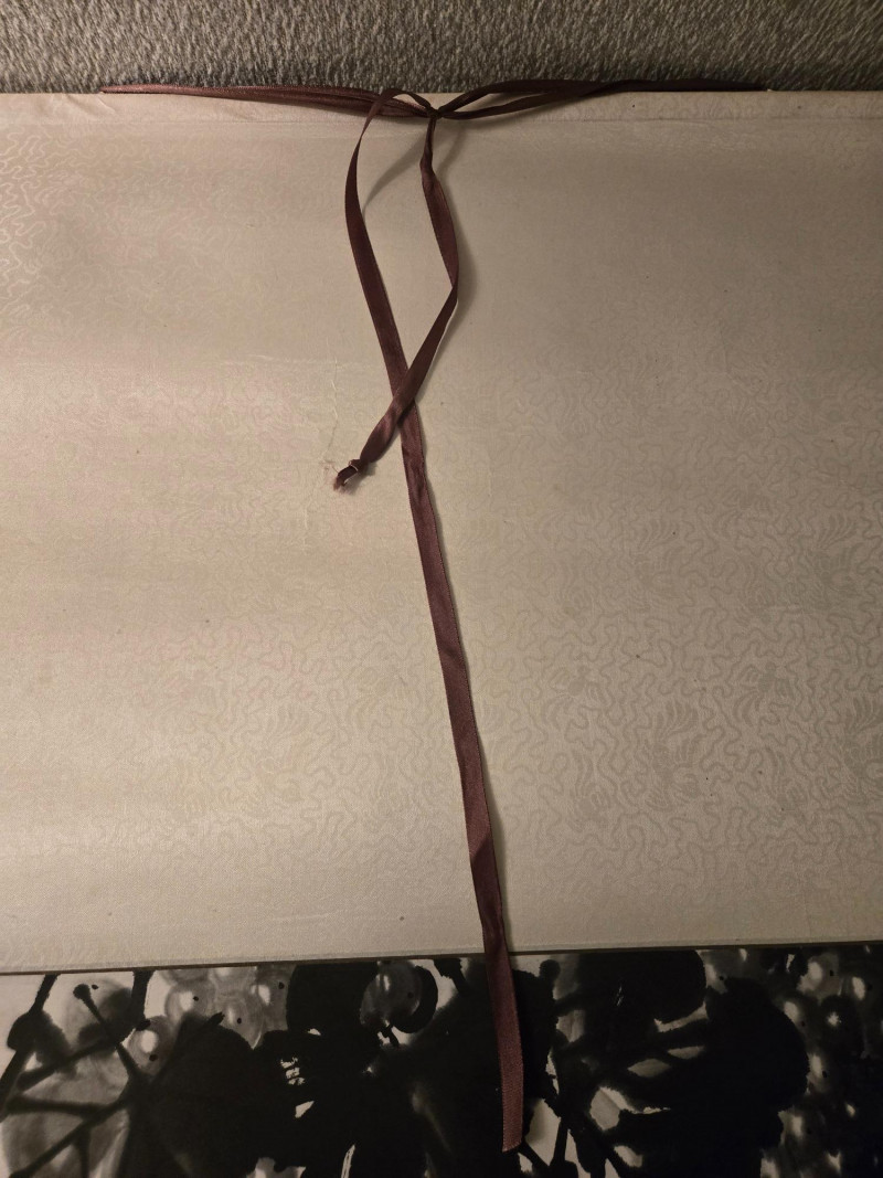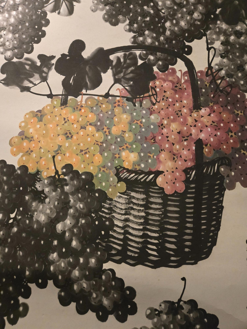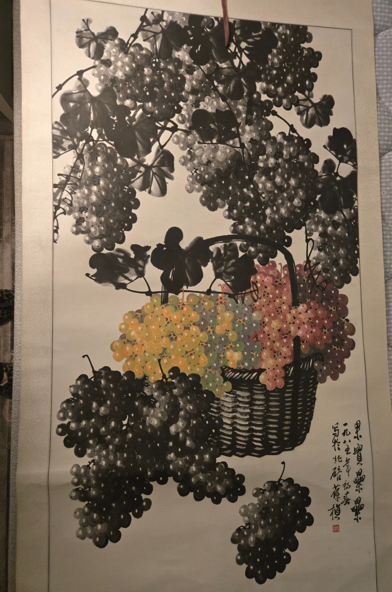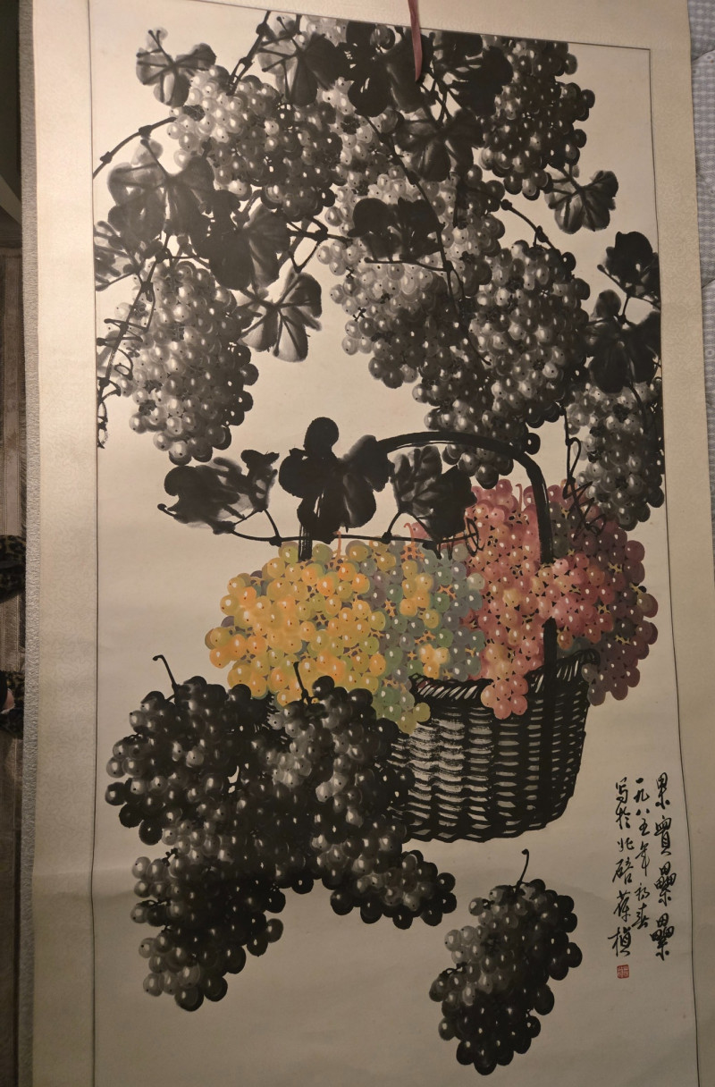This Japanese grape vine scroll is a stunning example of traditional East Asian ink and watercolor artistry, ideal for collectors who appreciate botanical themes and cultural symbolism. Japanese Grape Vine Scroll Dimensions: Approximately 31½ x 88 inches Medium: Ink and watercolor on paper Style: Traditional East Asian scroll painting Origin: Likely Japanese, based on stylistic elements and calligraphy Composition: A central basket overflowing with multicolored grapes—yellow, green, red—symbolizing abundance and seasonal richness. Surrounding clusters of dark purple grapes hang from twisting vines, rendered with expressive brushwork and tonal depth. The interplay of color and ink creates a dynamic yet harmonious balance between realism and stylization. Calligraphy: Located in the lower right, the inscription includes poetic phrasing and what appears to be the artist’s signature and studio name. Transcribed characters (approximate): 果豐貿樂果 / 元之年松春 / 寫作兆裕齋傅 These may reference themes of fruitfulness, seasonal joy, and the artist’s studio or lineage. Grapes in East Asian art often symbolize prosperity, fertility, and the rewards of labor. Scrolls like this were traditionally displayed seasonally or gifted to mark auspicious occasions. The large format and vibrant palette make this piece especially striking, suitable for both decorative and scholarly appreciation. Artwork Overview