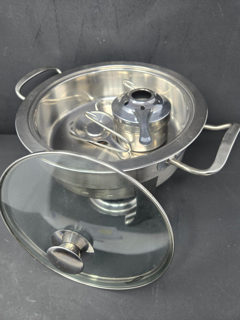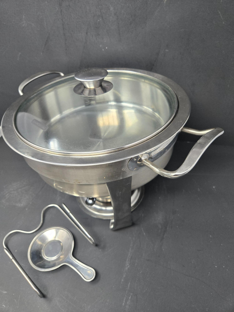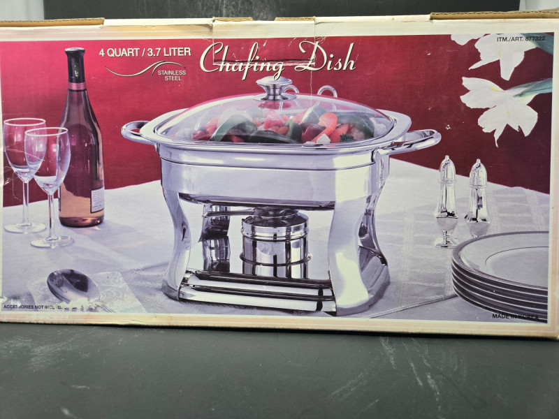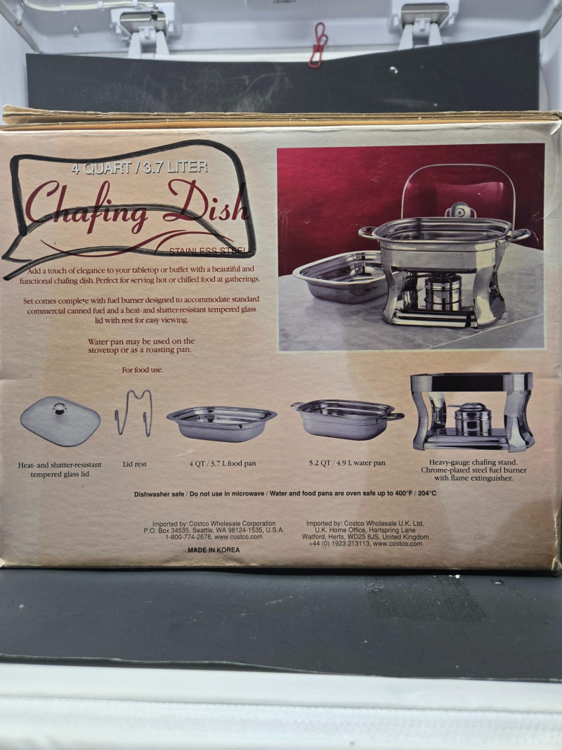 Serve in style with this matching pair of 4-quart stainless steel chafing dishes, each featuring a glass lid, elevated stand, and fuel holder for consistent heat. Ideal for buffet service, holiday hosting, or catering setups. Includes original packaging with elegant table-setting imagery. Capacity: 4 Quart / 3.7 Liter each Material: Stainless Steel with Glass Lid